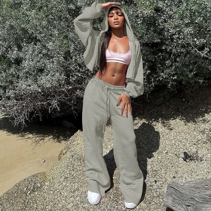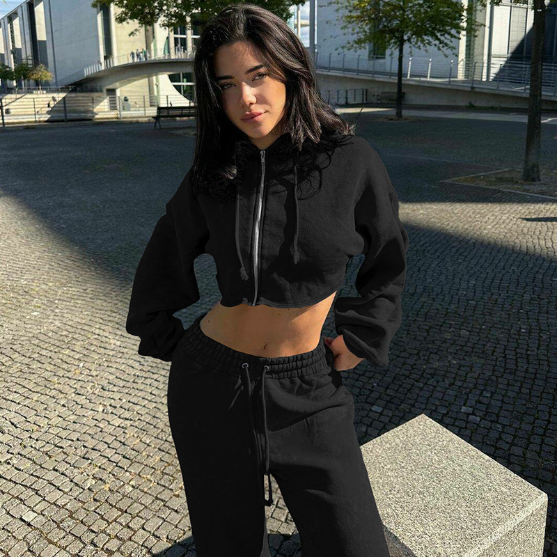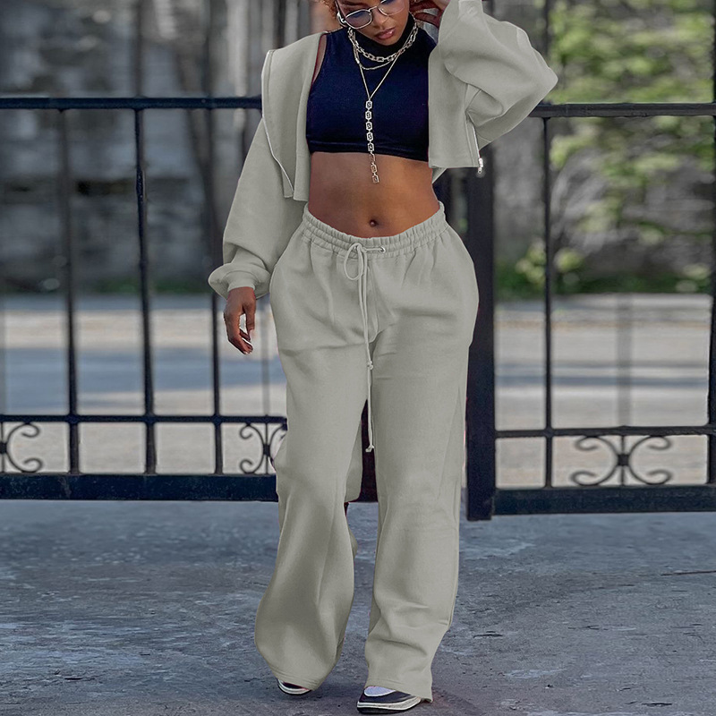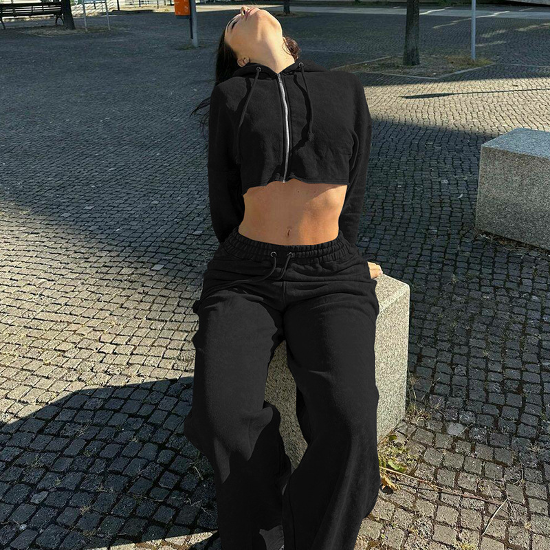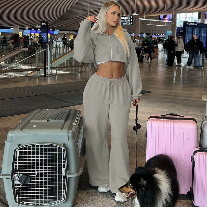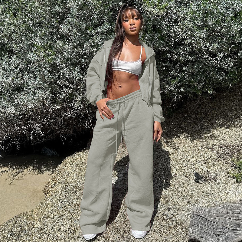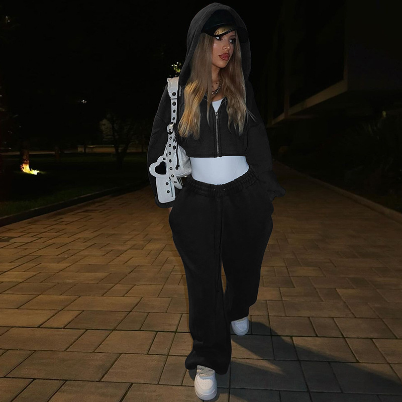 유럽과 미국 여성의 2024 가을과 겨울 새로운 패션 지퍼 후드 탑 슬림 캐주얼 바지 세트 도매