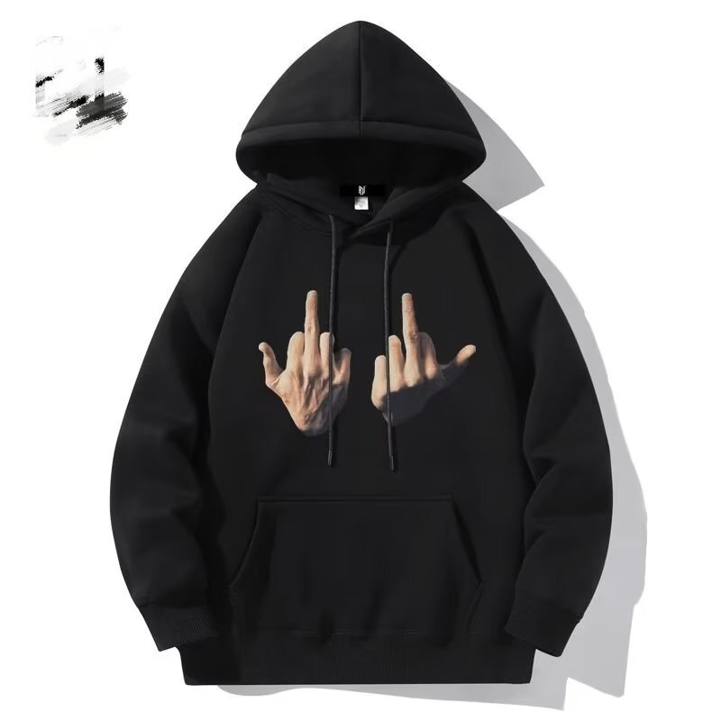 아메리칸 스타일 하이 스트리트 미들 핑거 롱 슬리브 후드 스웨트 셔츠 남성 가을 및 겨울 빈티지 캐주얼 올 매치 헤비 탑 재킷