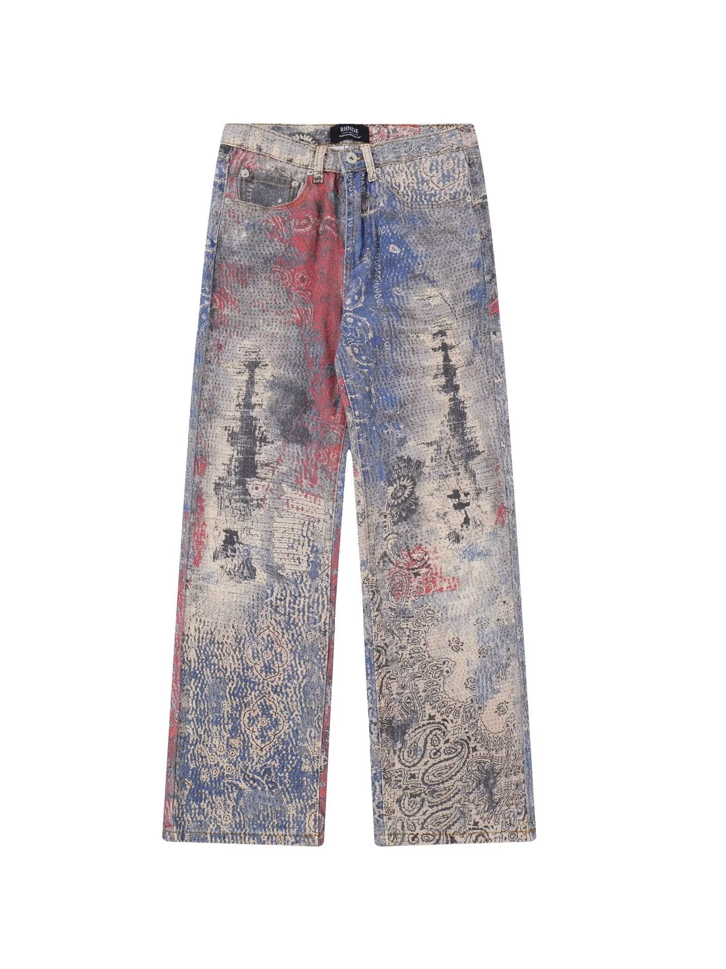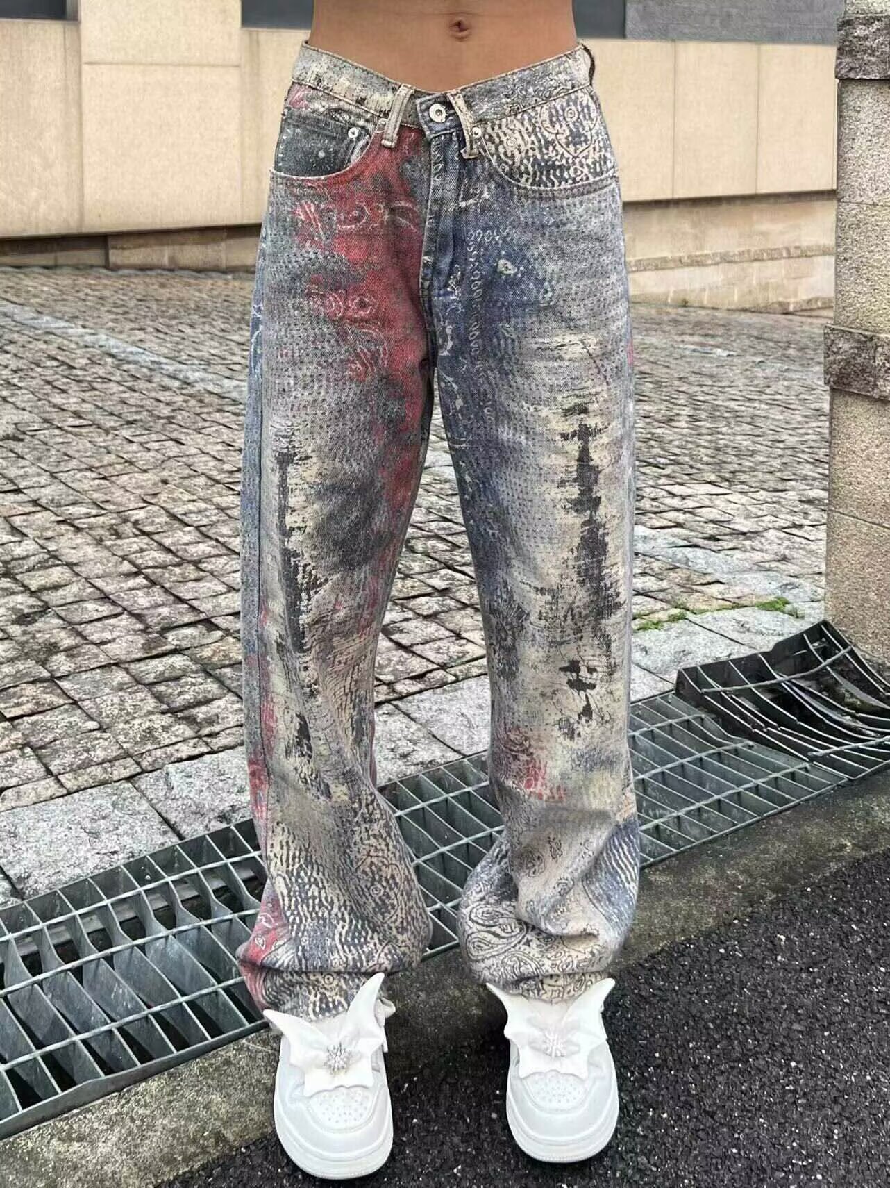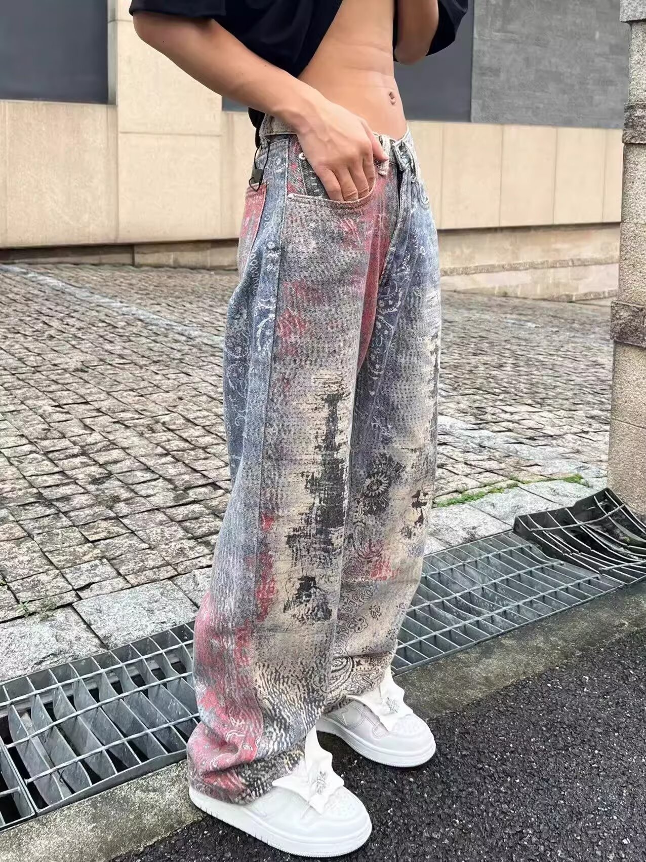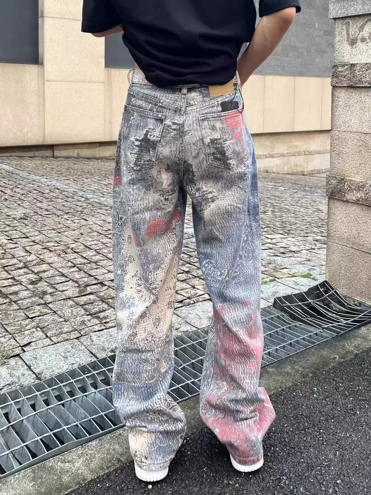 미국 틈새 디자인 센스 디지털 인쇄 스트레이트 청바지 남성과 여성 스트리트 힙합 느슨한 와이드 다리 바지