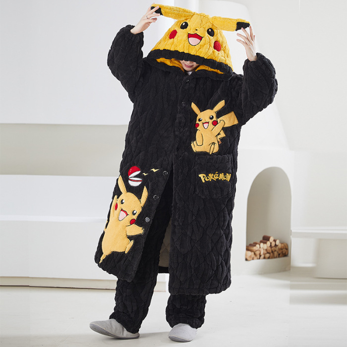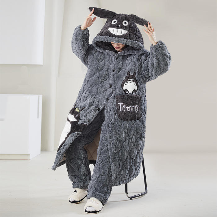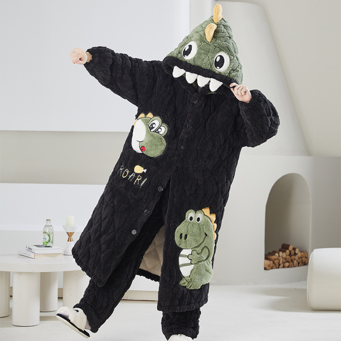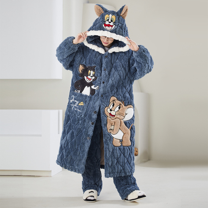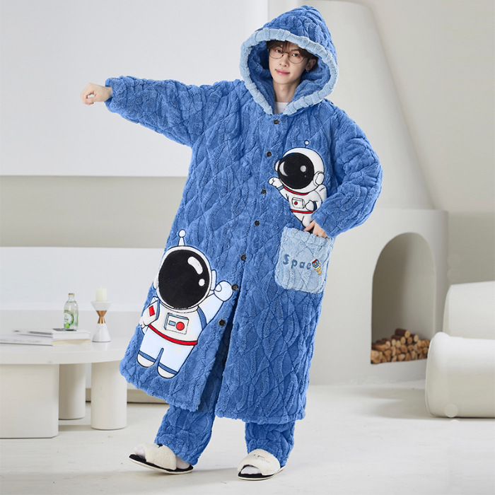 고급 3 층 퀼트 나이트가운 남자 겨울 후드 만화 기모 따뜻한 청소년 홈 의류 세트