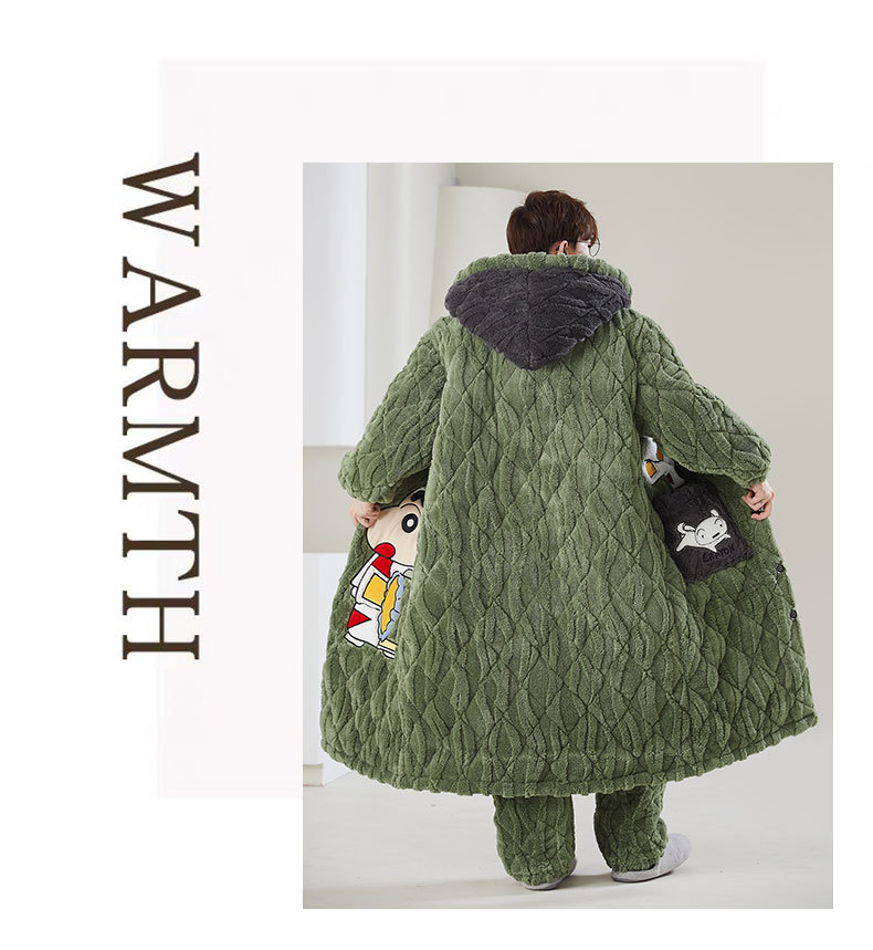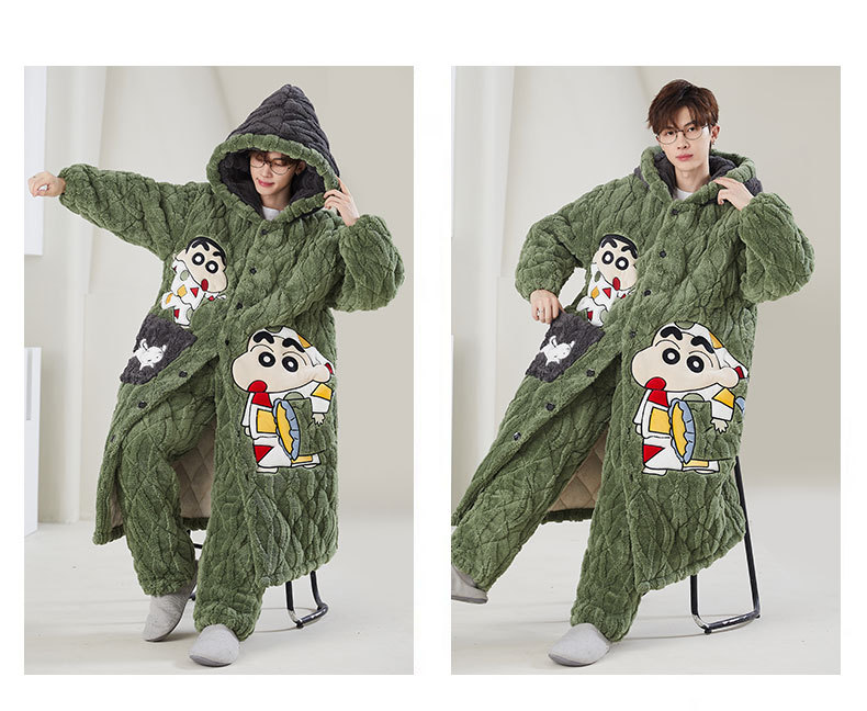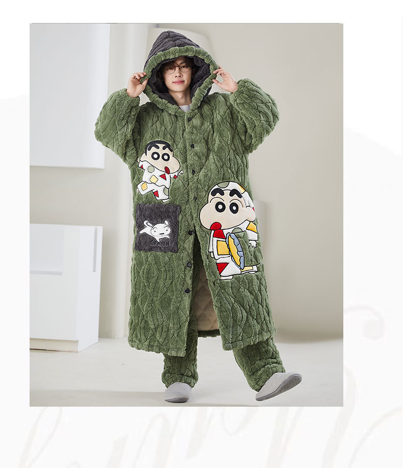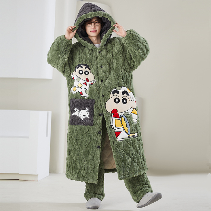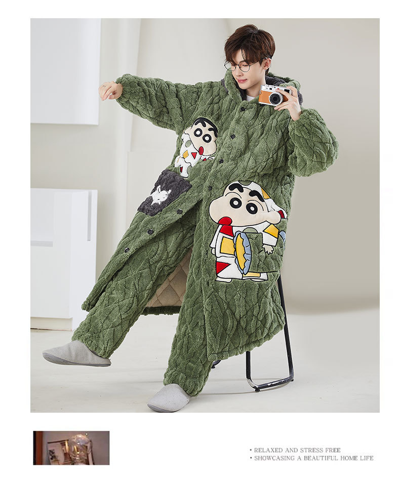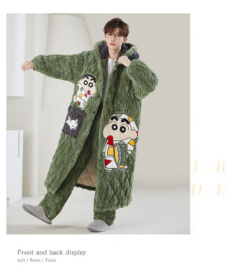 고급 3 층 퀼트 나이트가운 남자 겨울 후드 만화 기모 따뜻한 청소년 홈 의류 세트스토어 가기