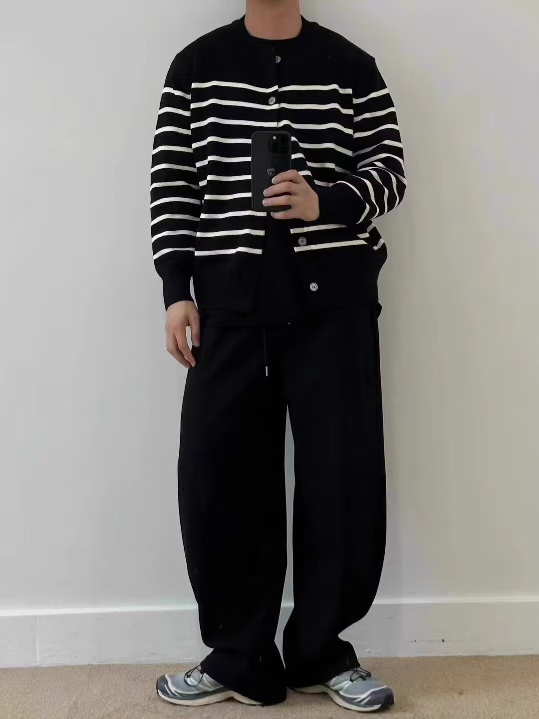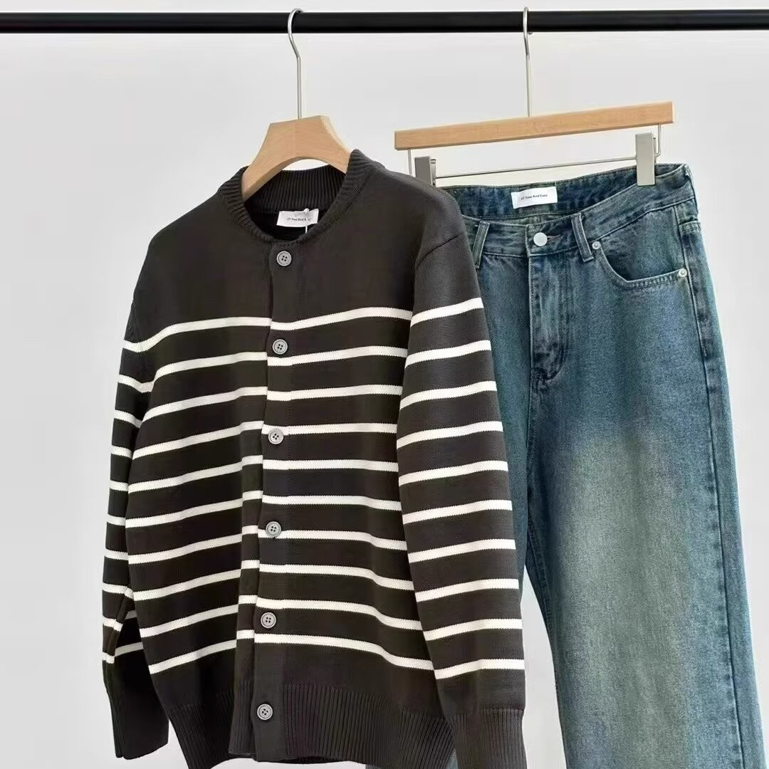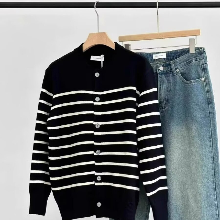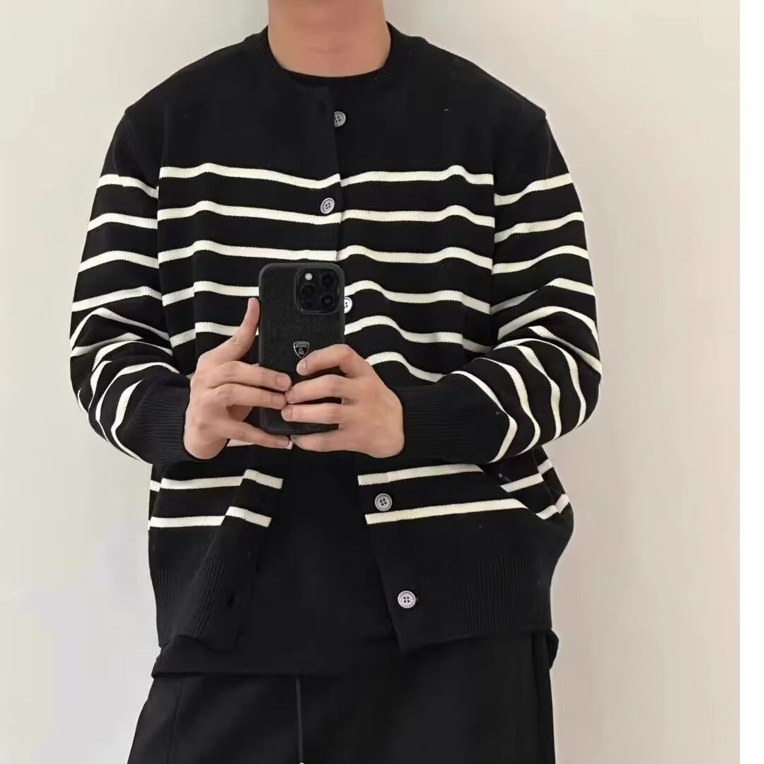 가을과 겨울 새로운 배럴 칼라 디자인 간단한 클래식 줄무늬 캐주얼 니트 카디건 남자 스웨터 재킷스토어 가기