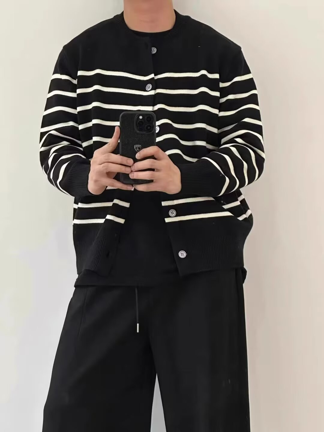 가을과 겨울 새로운 배럴 칼라 디자인 간단한 클래식 줄무늬 캐주얼 니트 카디건 남자 스웨터 재킷