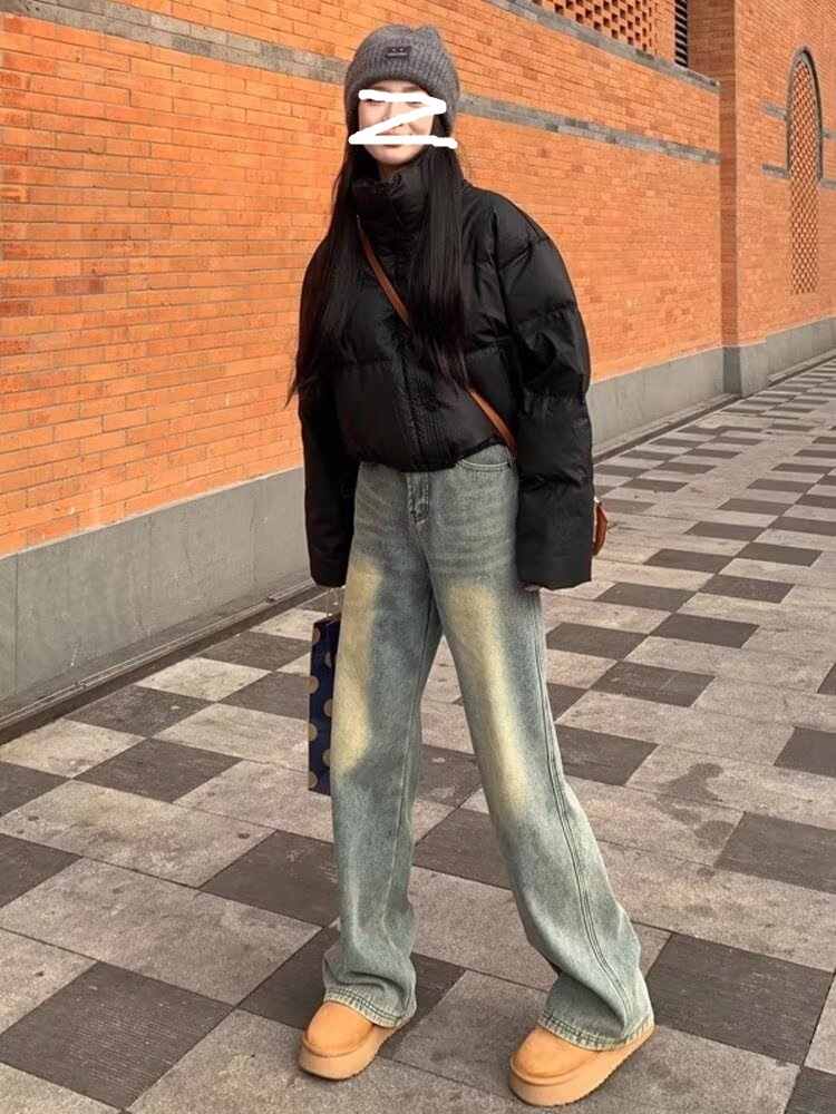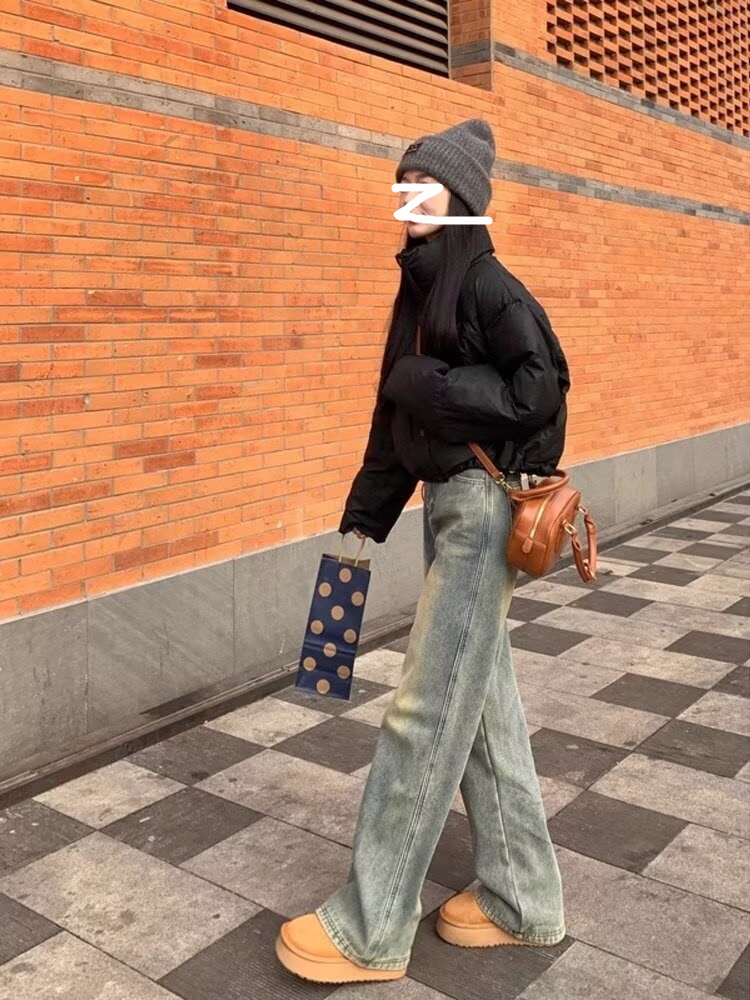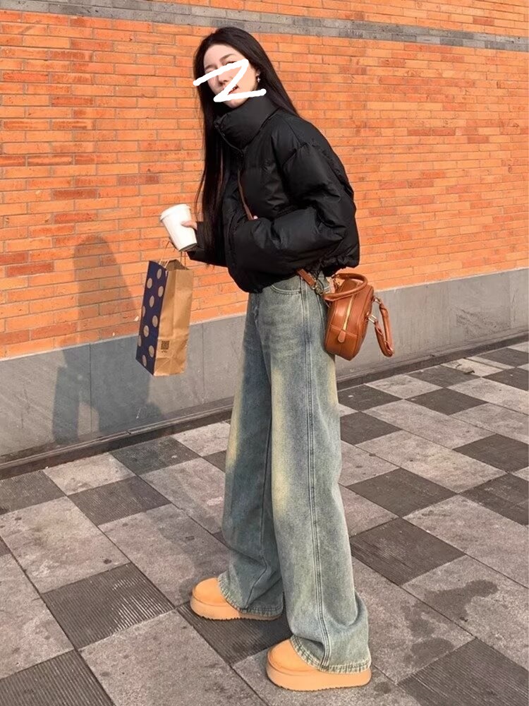 가을 2024 새로운 빈티지 세탁 오래 된 높은 허리 슬리밍 캐주얼 와이드 레그 팬츠 여성을위한 모든 매치 스트레이트 청바지스토어 가기