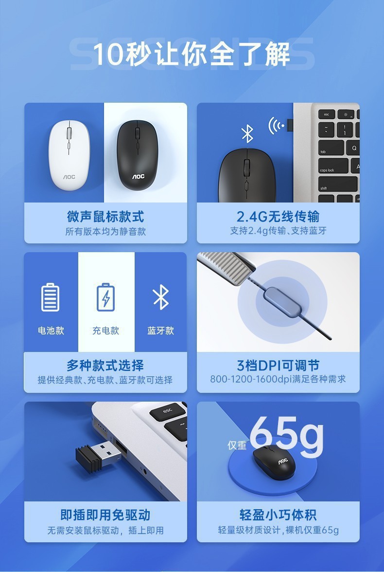TPV AOC 컴퓨터 MS313 블루투스 무선 충전 듀얼 모드 마우스 노트북 MS311 2.4G 무선 마우스스토어 가기