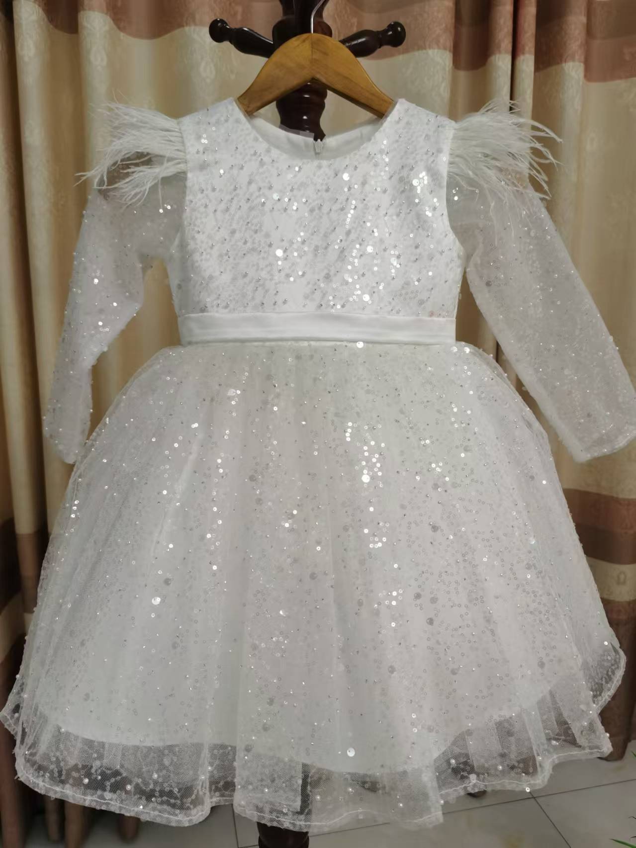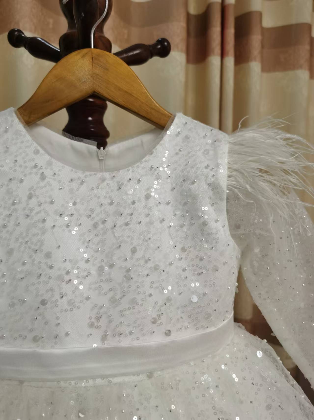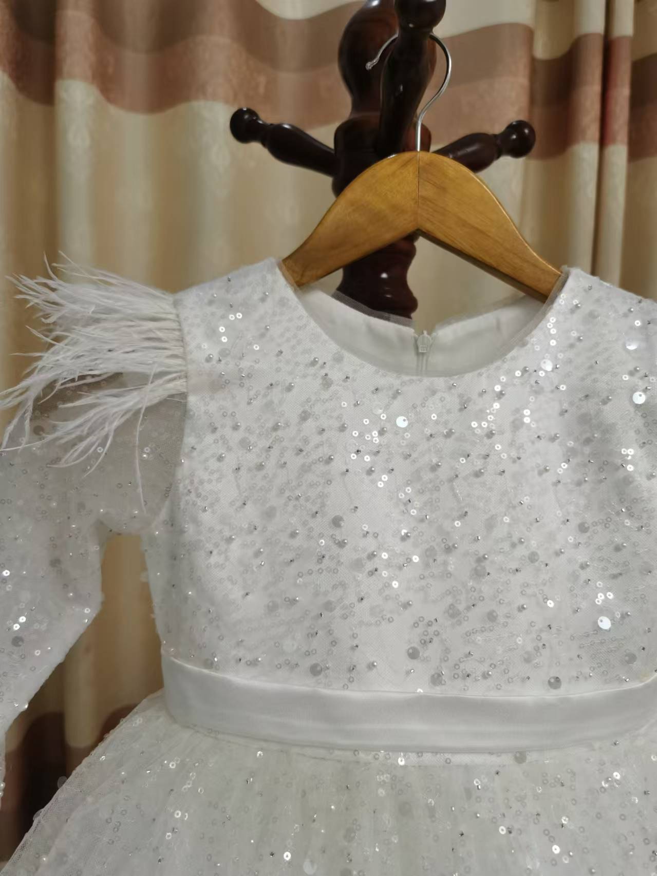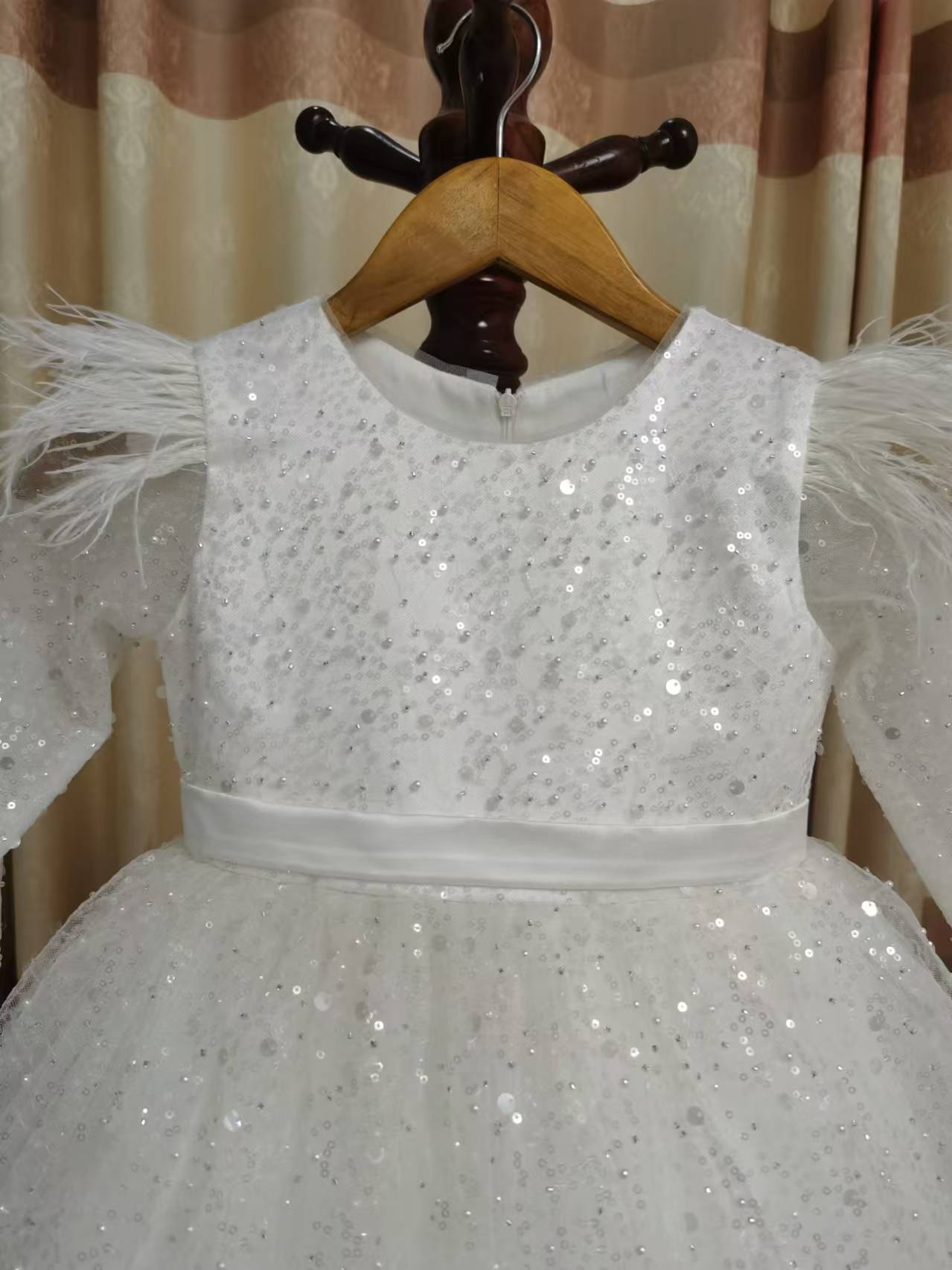 소녀 화이트 푹신한 베일 원피스 긴팔 깃털 저녁 원피스 서양식 스팽글 소녀 꽃 소녀 어린이 생일 공연