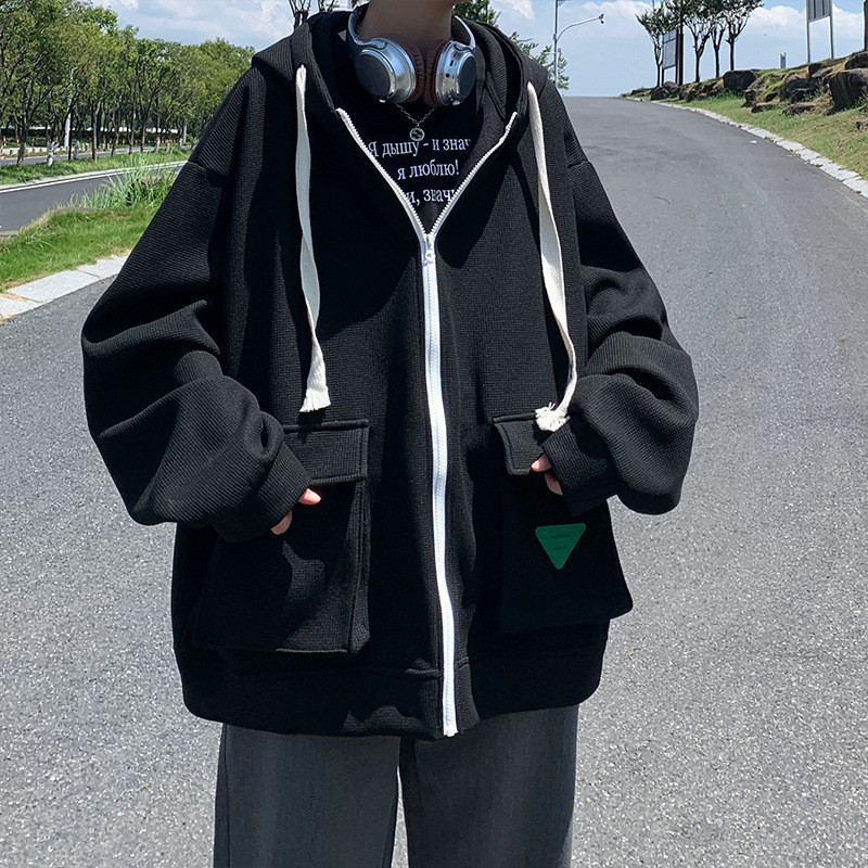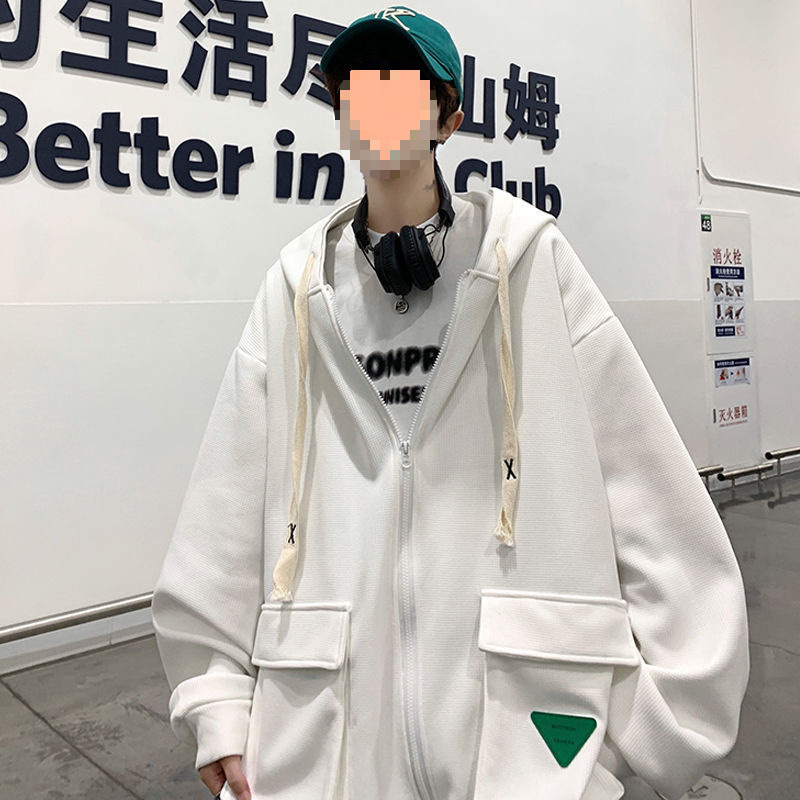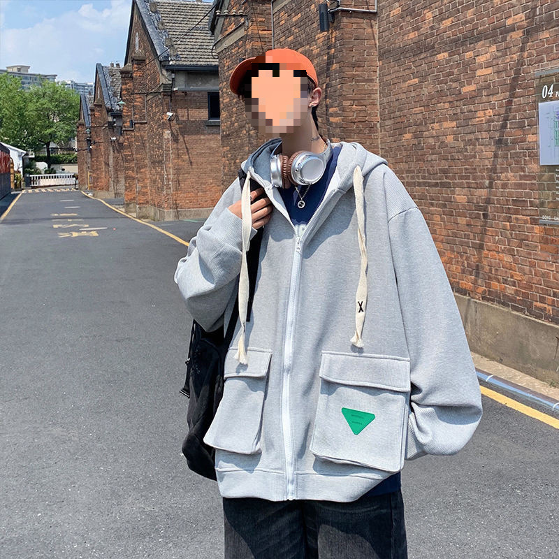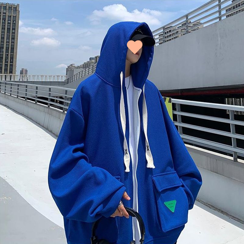 클라인 블루 무거운 가을 와플리 스웨터 오버 사이즈 루즈 후드 카디건 재킷 남성 Ins 패션 브랜드스토어 가기
