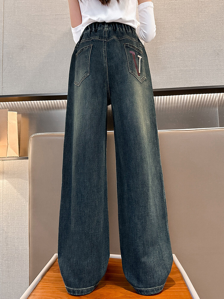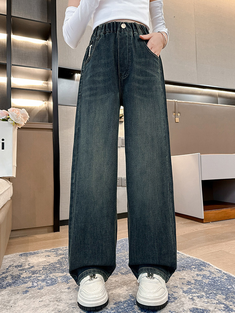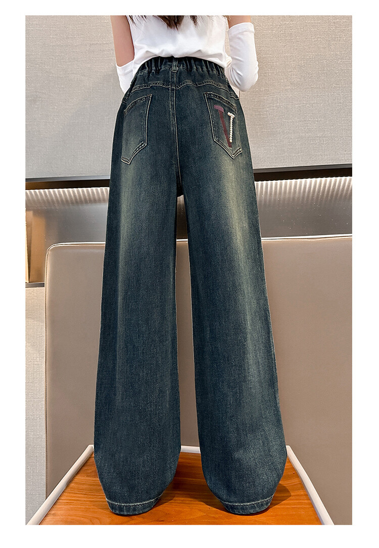 소녀 캐주얼 청바지 가을과 겨울 2024 새로운 서양식 바지 큰 어린이 스트레이트 기모 두꺼운 넓은 다리 바지