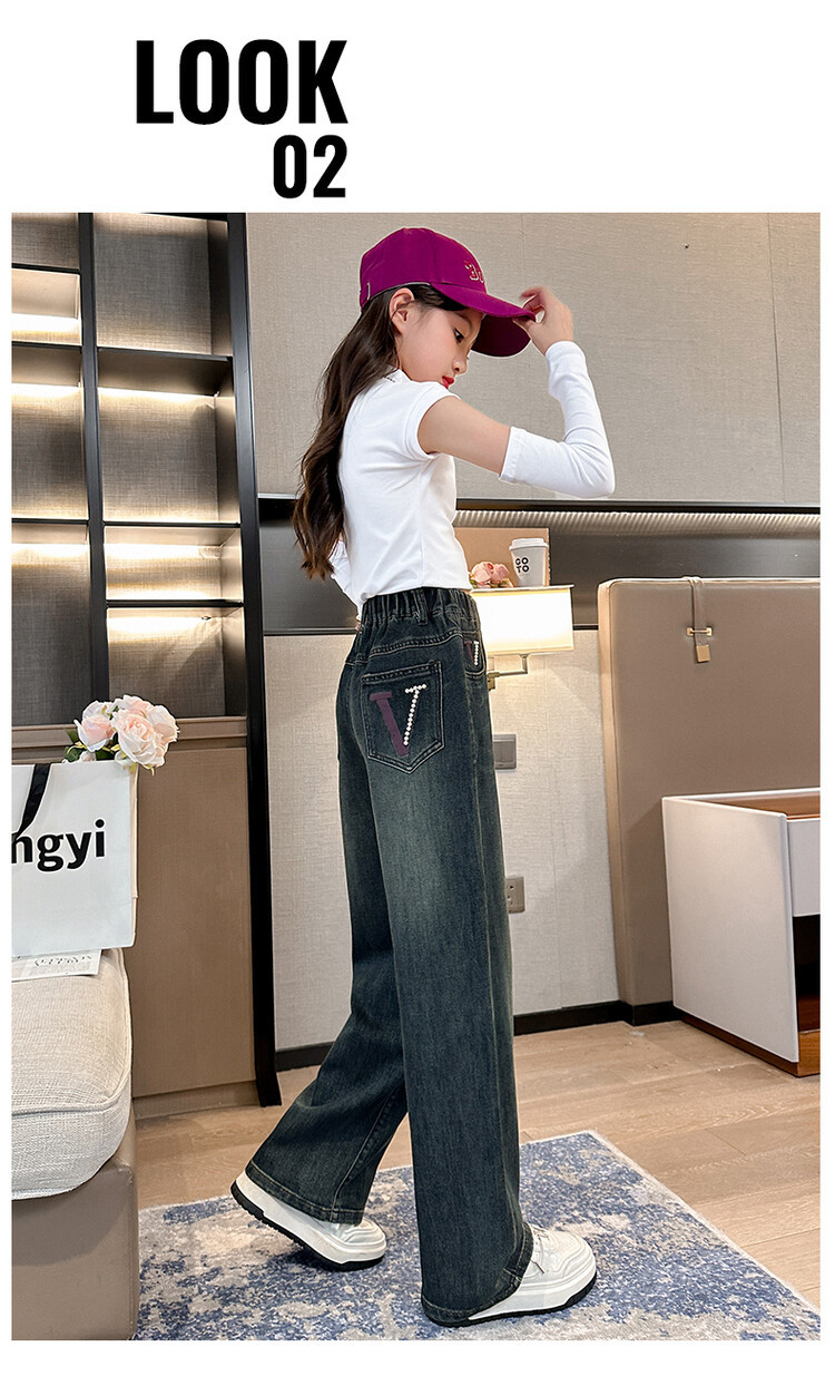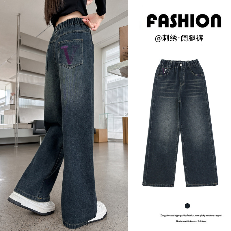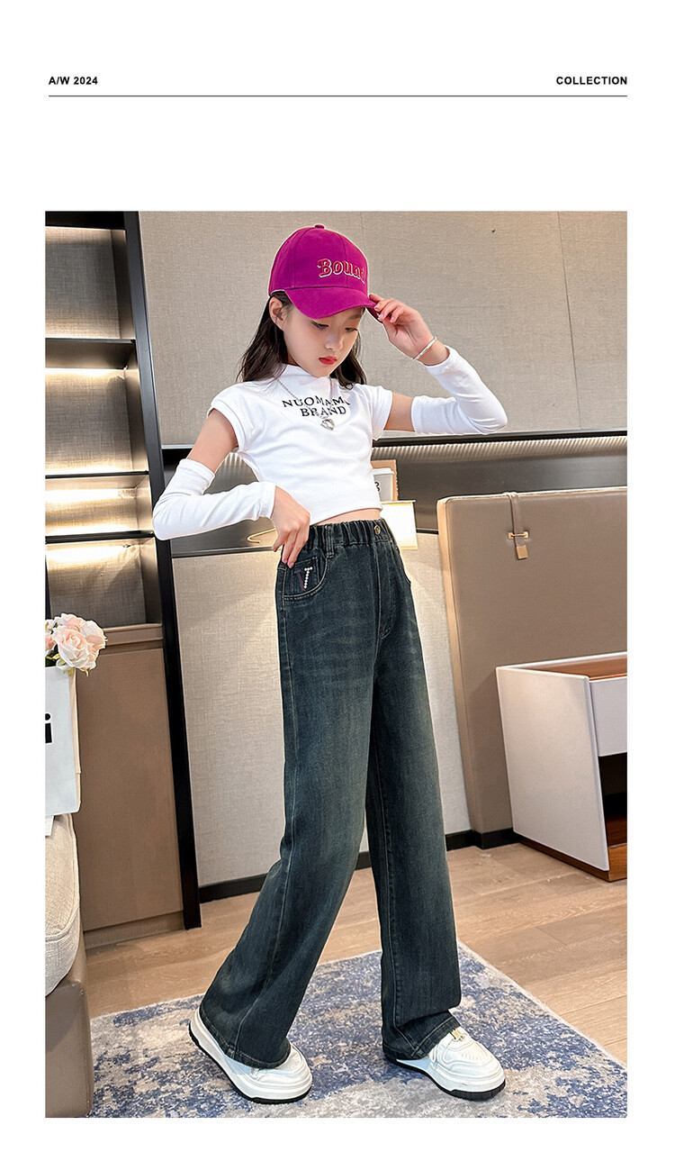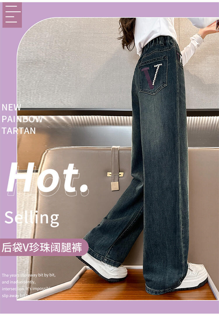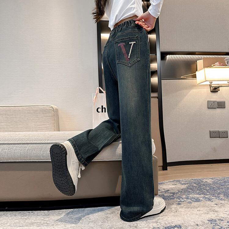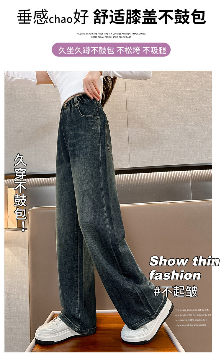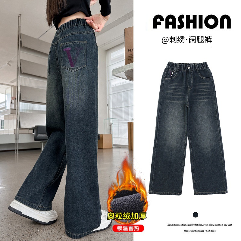 소녀 캐주얼 청바지 가을과 겨울 2024 새로운 서양식 바지 큰 어린이 스트레이트 기모 두꺼운 넓은 다리 바지스토어 가기