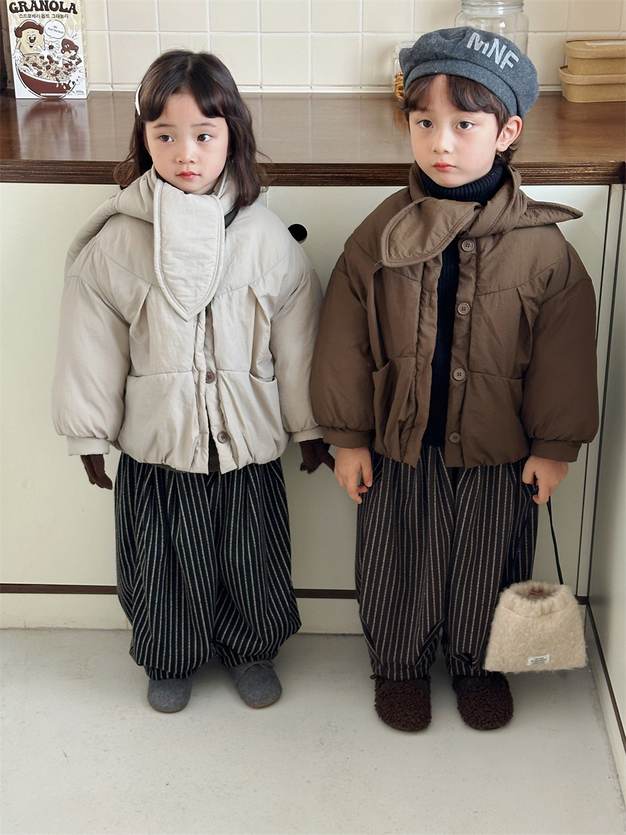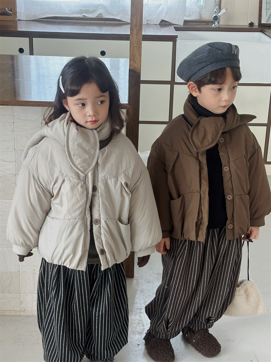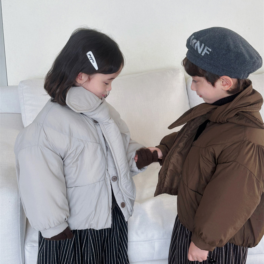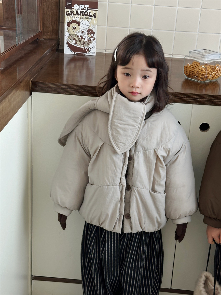 JiaYe 어린이 제품 2025년 겨울 신상품 스카프 면 재킷 남녀 아기용 두꺼운 패딩 코트