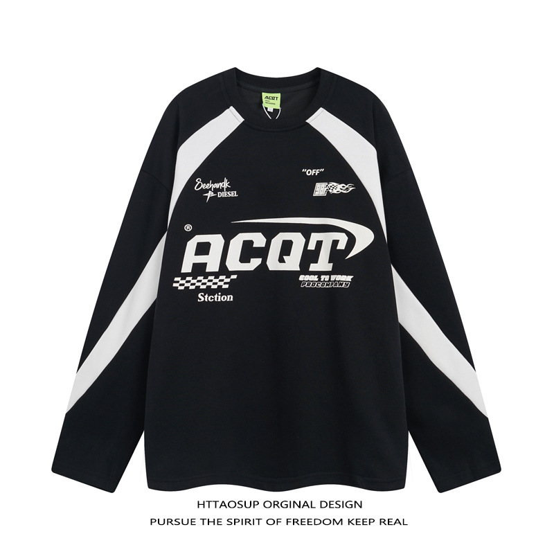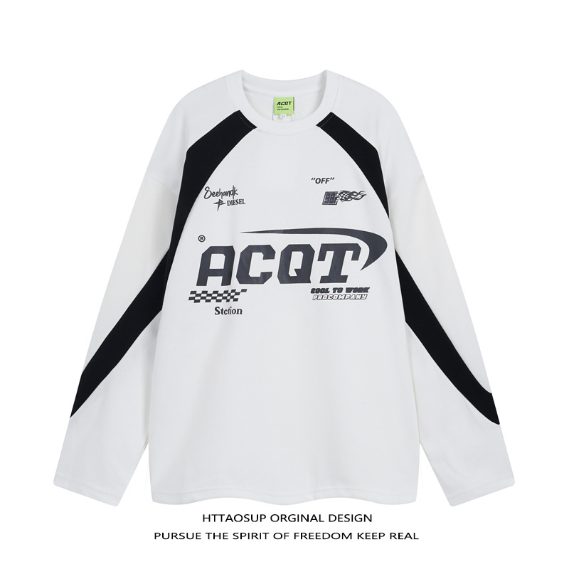 하이 스트리트 디자인의 컬러 배색 프린트 라운드넥 스웨트셔츠, 남녀공용 아메리칸 스타일 루즈핏 레이싱웨어 탑스토어 가기