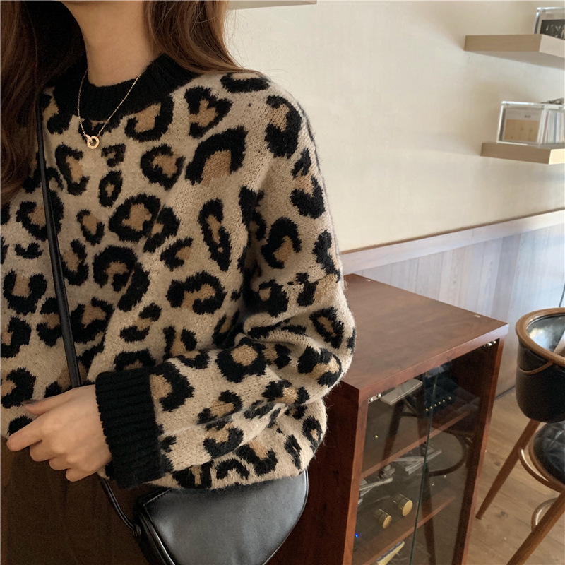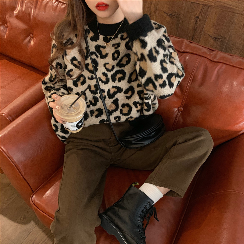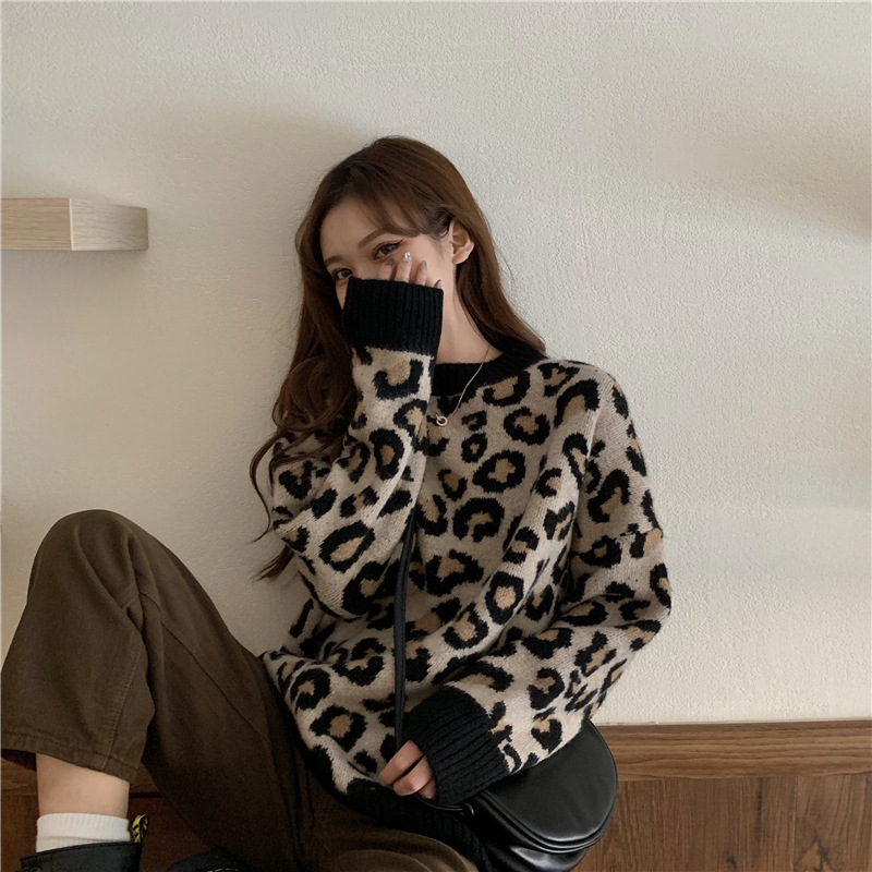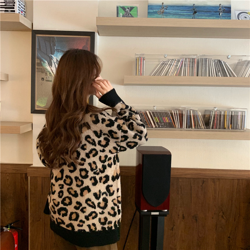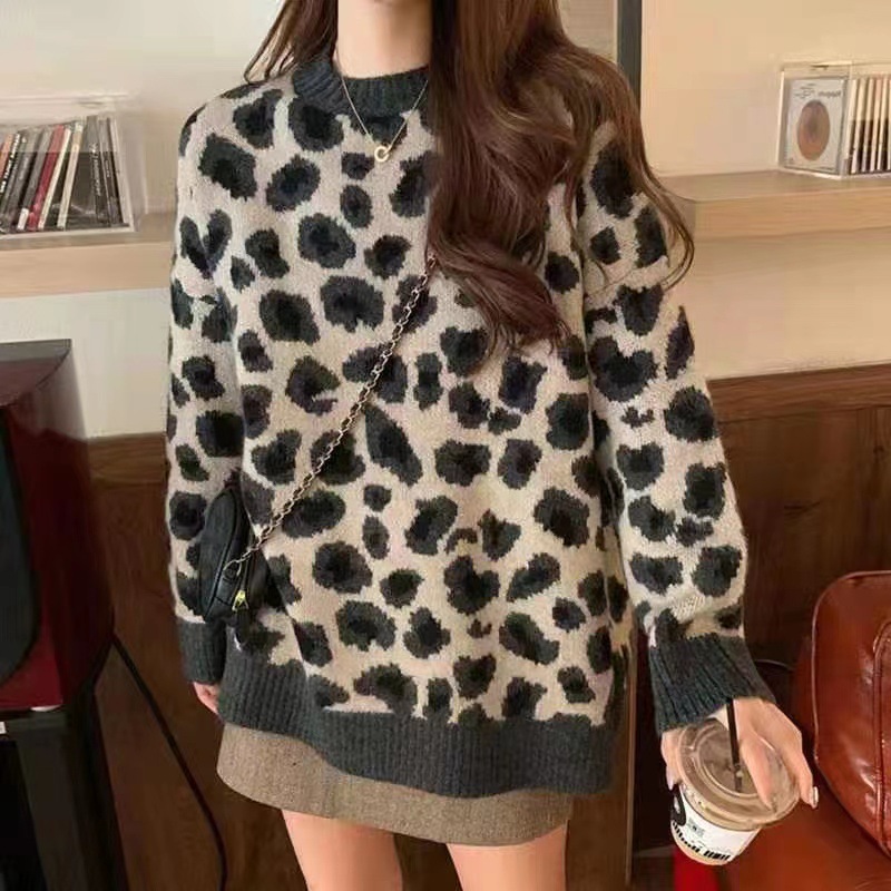 레오파드 무늬 스웨터 여성의 가을과 겨울 2024 새로운 착용 외국 스타일 풀오버 스웨터 느슨한 게으른 바람 긴 소매 탑스토어 가기
