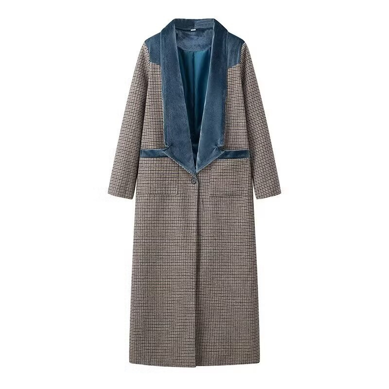 SAW AliExpress 독립 스테이션 유럽 및 미국 스타일 여성 패션 올 매치 딥 V 넥 긴 격자 무늬 울 긴 소매 코트