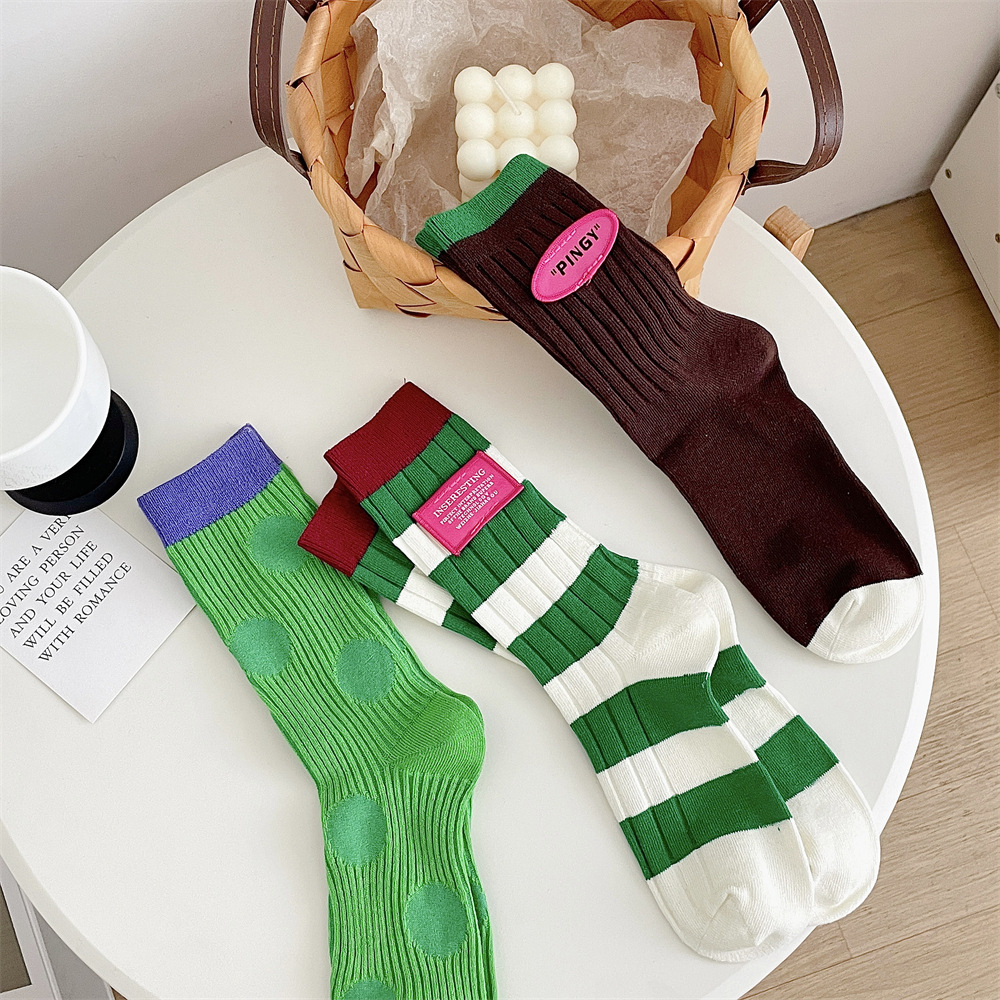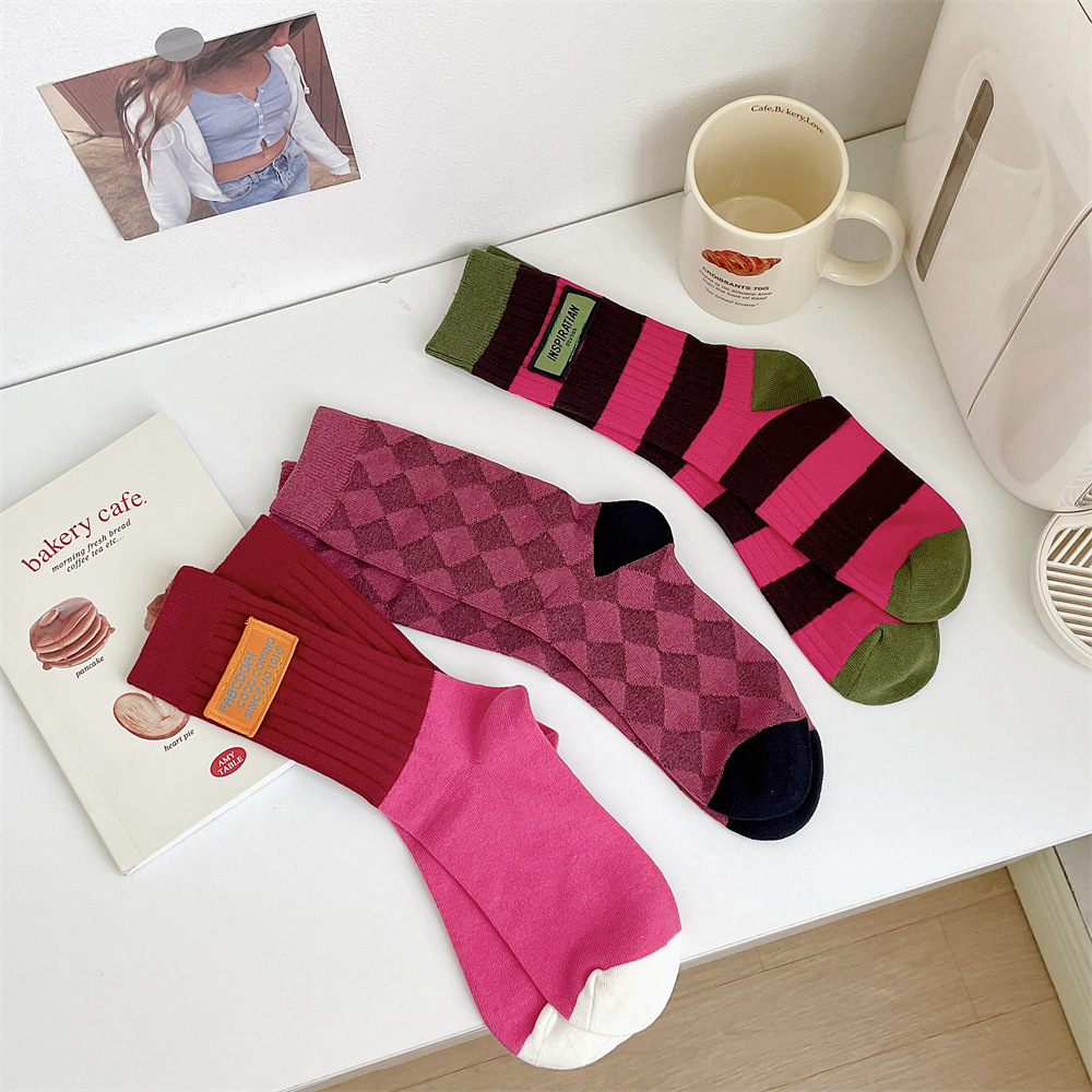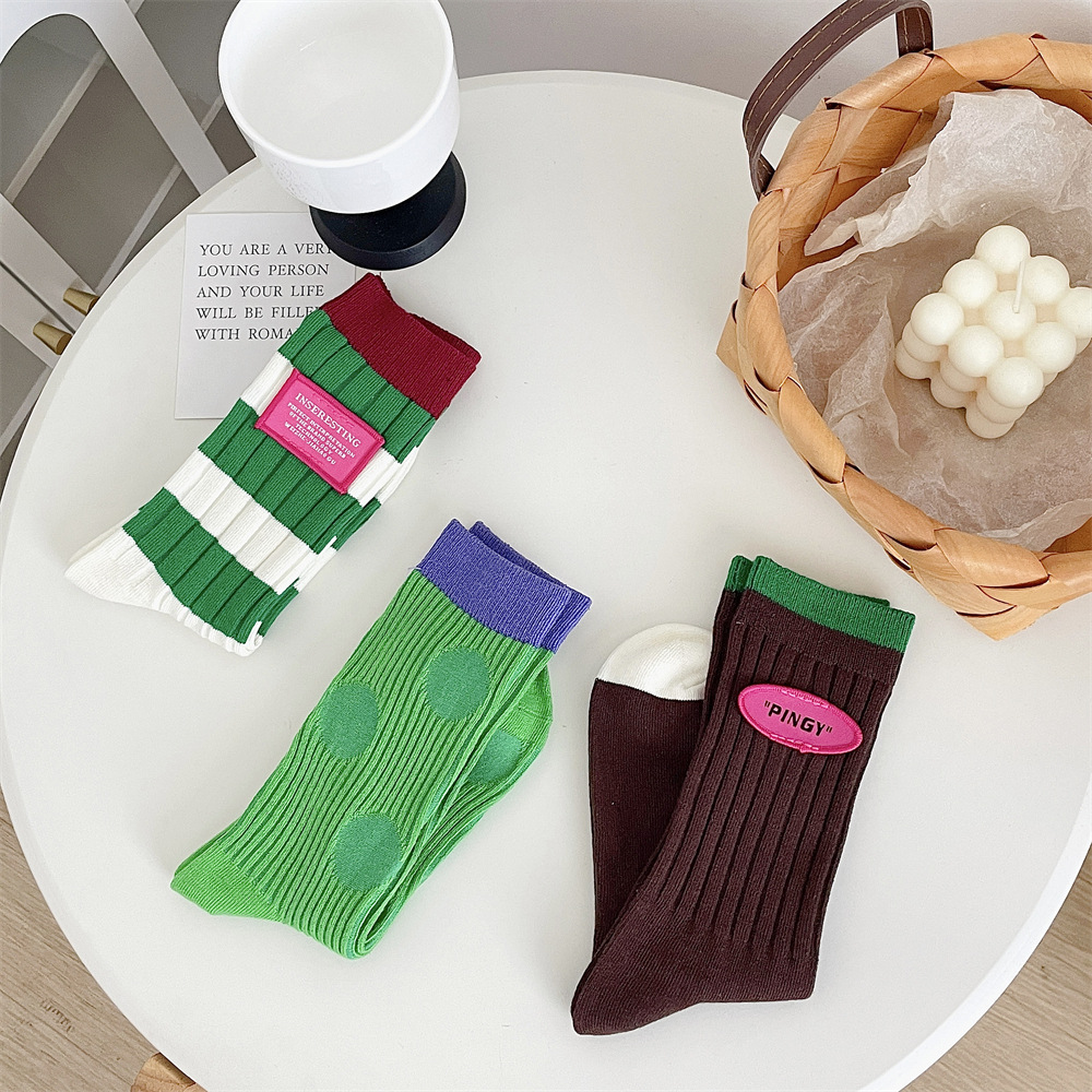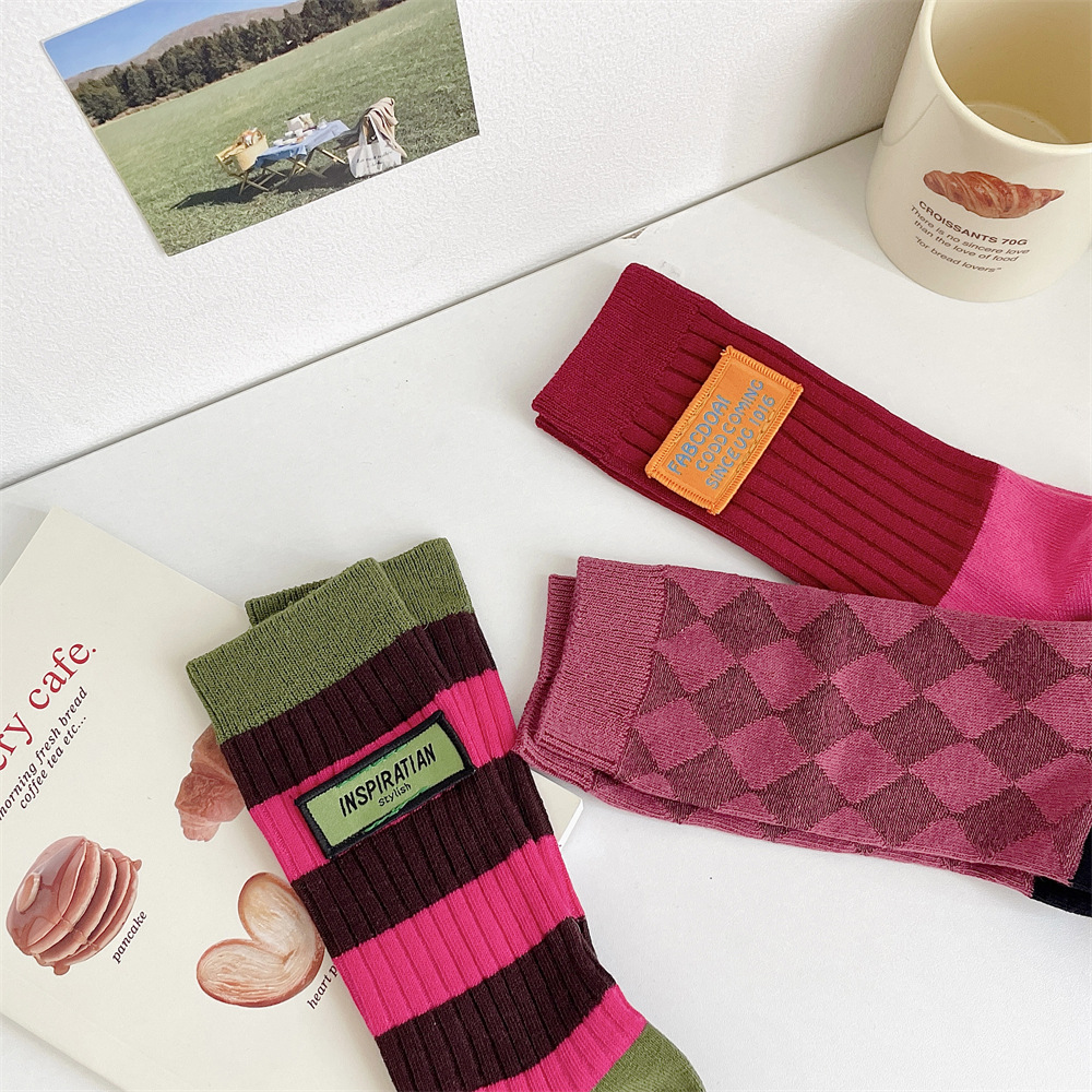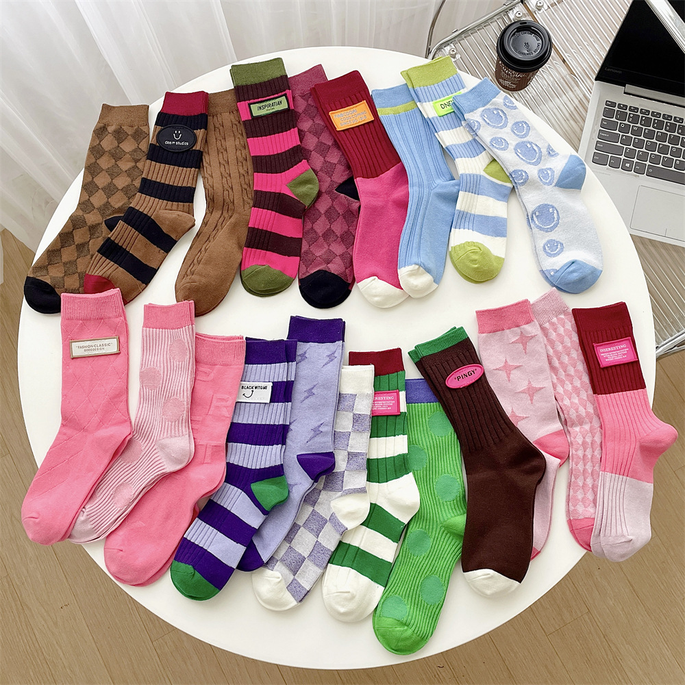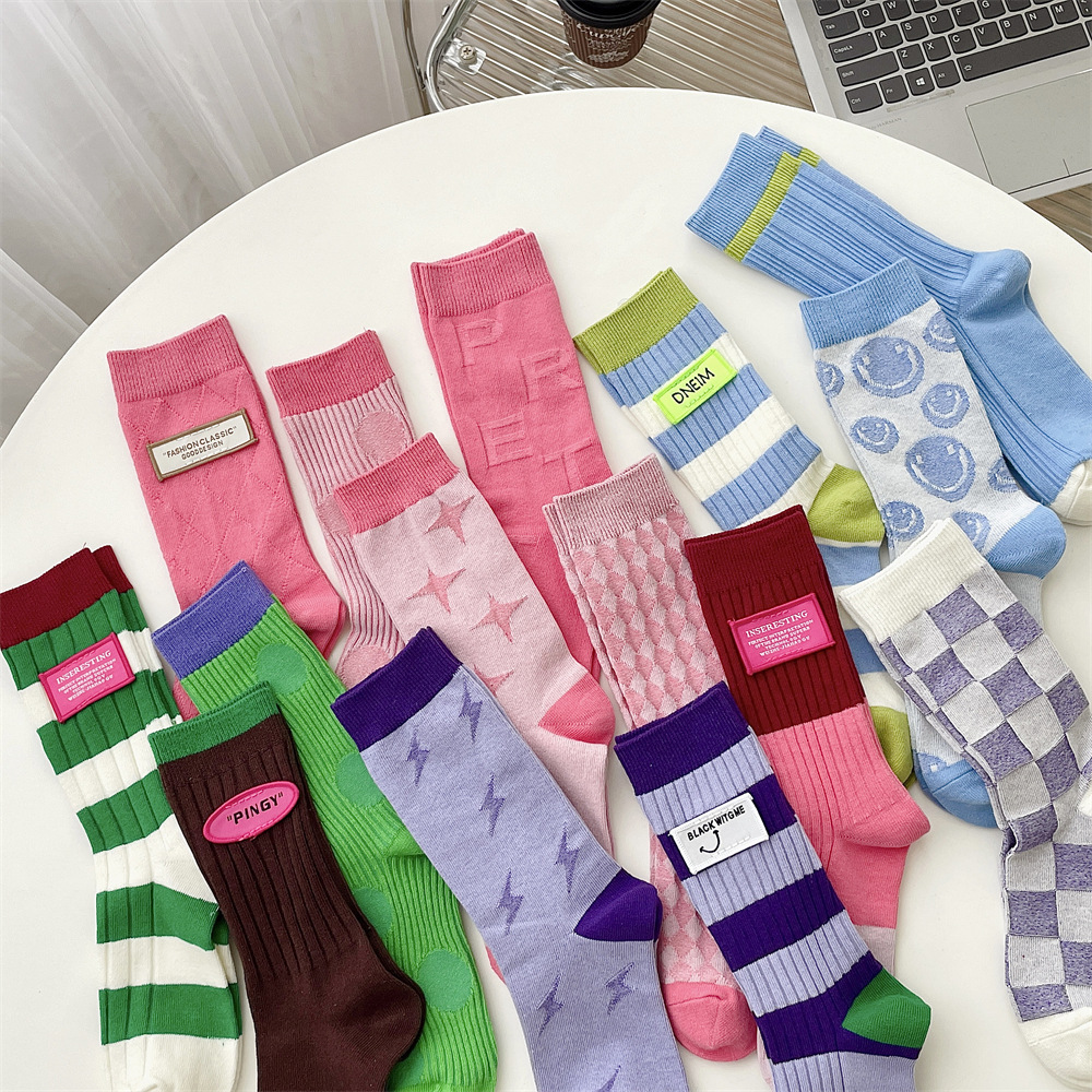 도파민 양말 여성 중간 배럴 대비 색상 Ins 일본 유행 양말 사계절 천 라벨 줄무늬 한국 스타일 스택 양말 스타킹스토어 가기