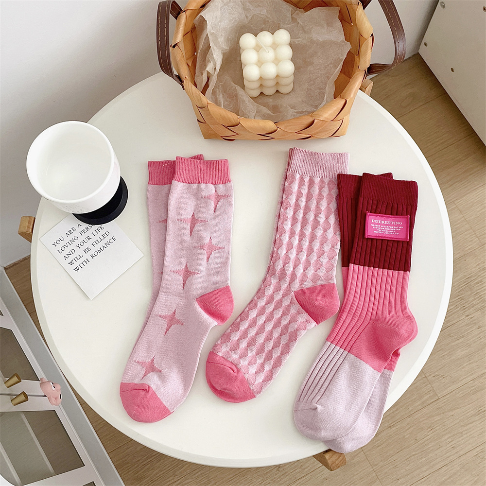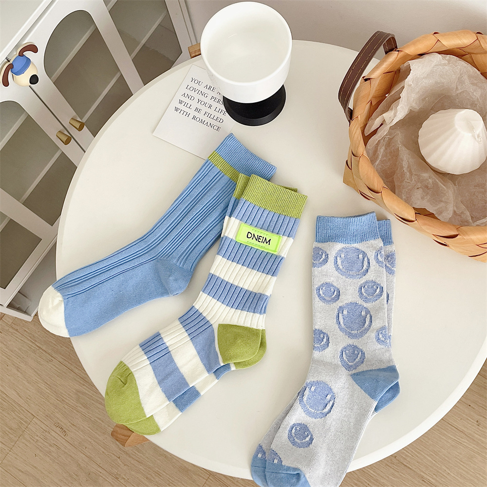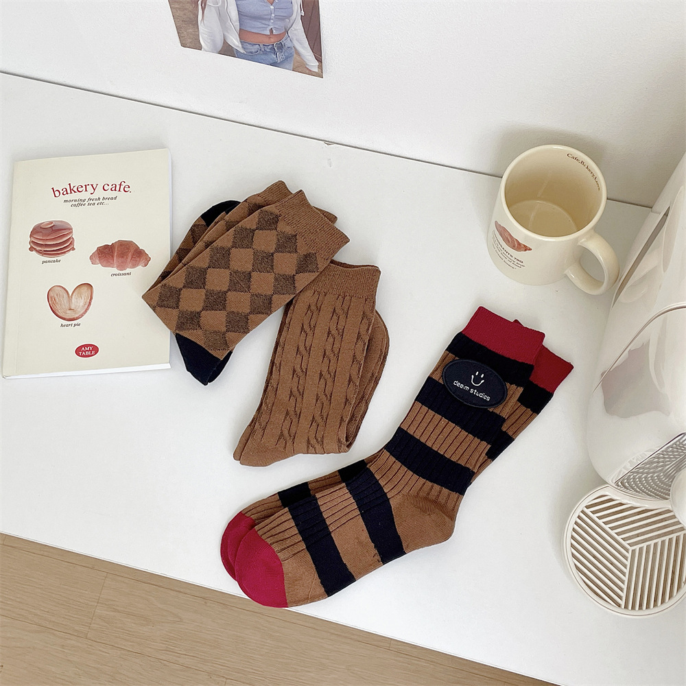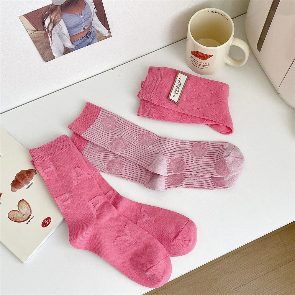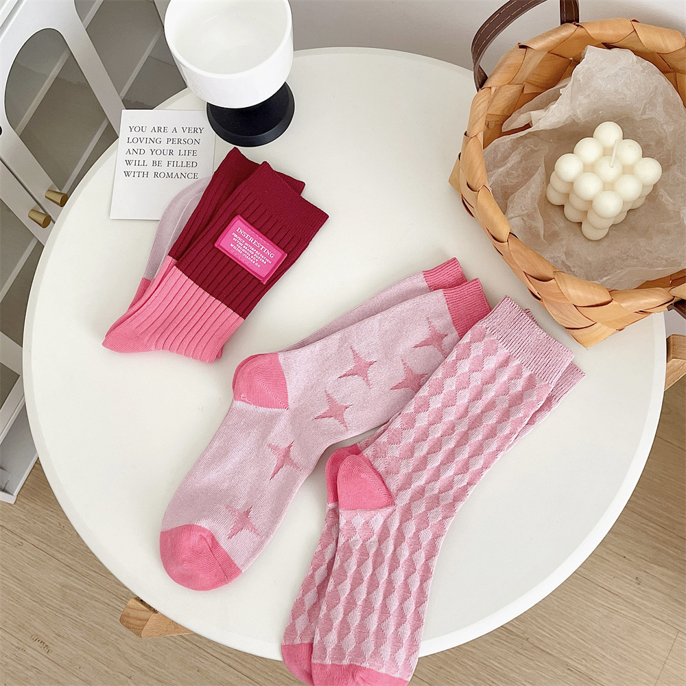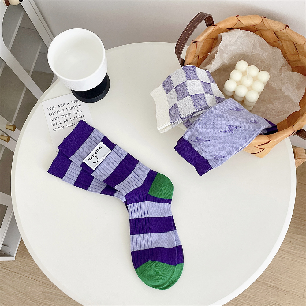 도파민 양말 여성 중간 배럴 대비 색상 Ins 일본 유행 양말 사계절 천 라벨 줄무늬 한국 스타일 스택 양말 스타킹스토어 가기