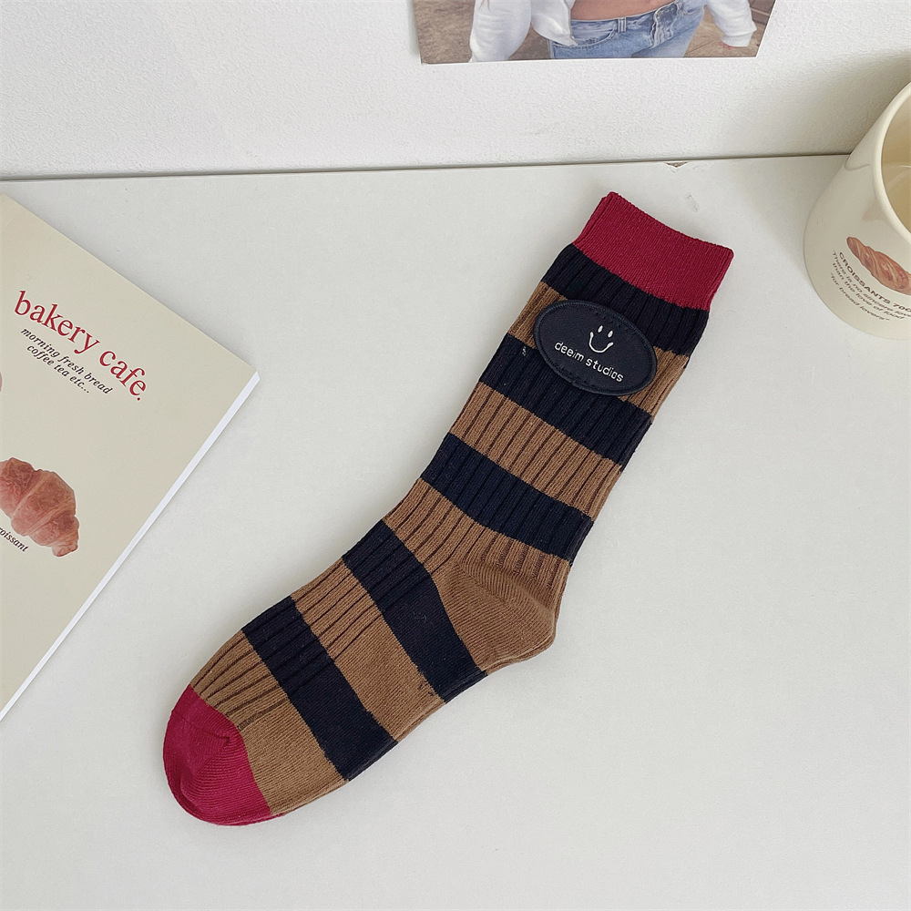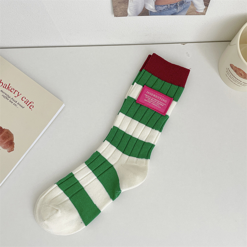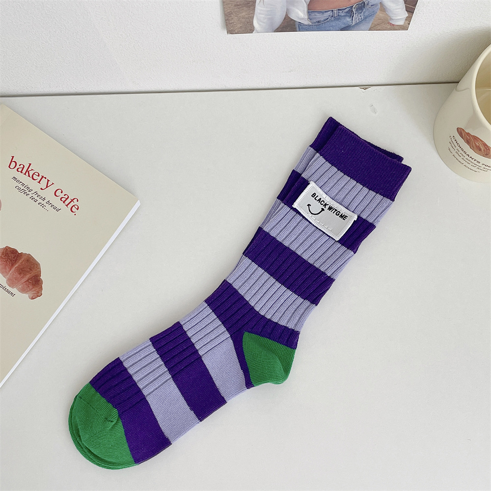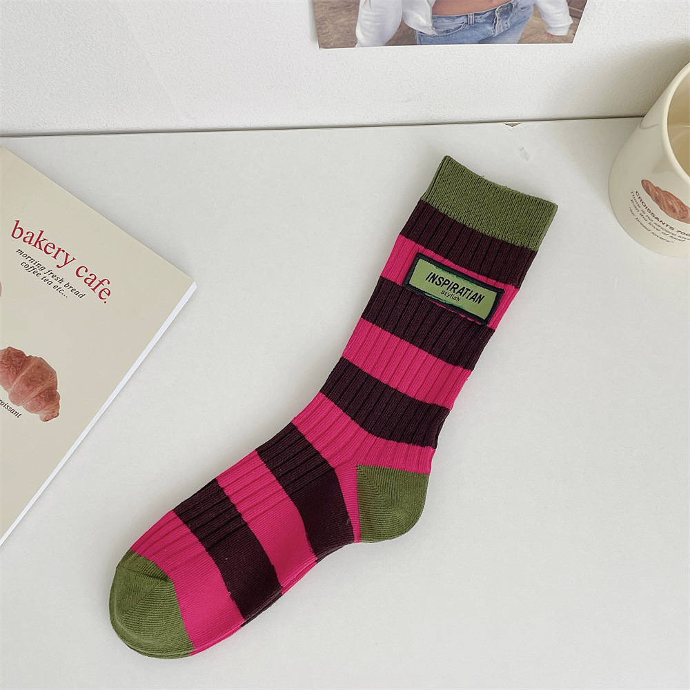 도파민 양말 여성 중간 배럴 대비 색상 Ins 일본 유행 양말 사계절 천 라벨 줄무늬 한국 스타일 스택 양말 스타킹