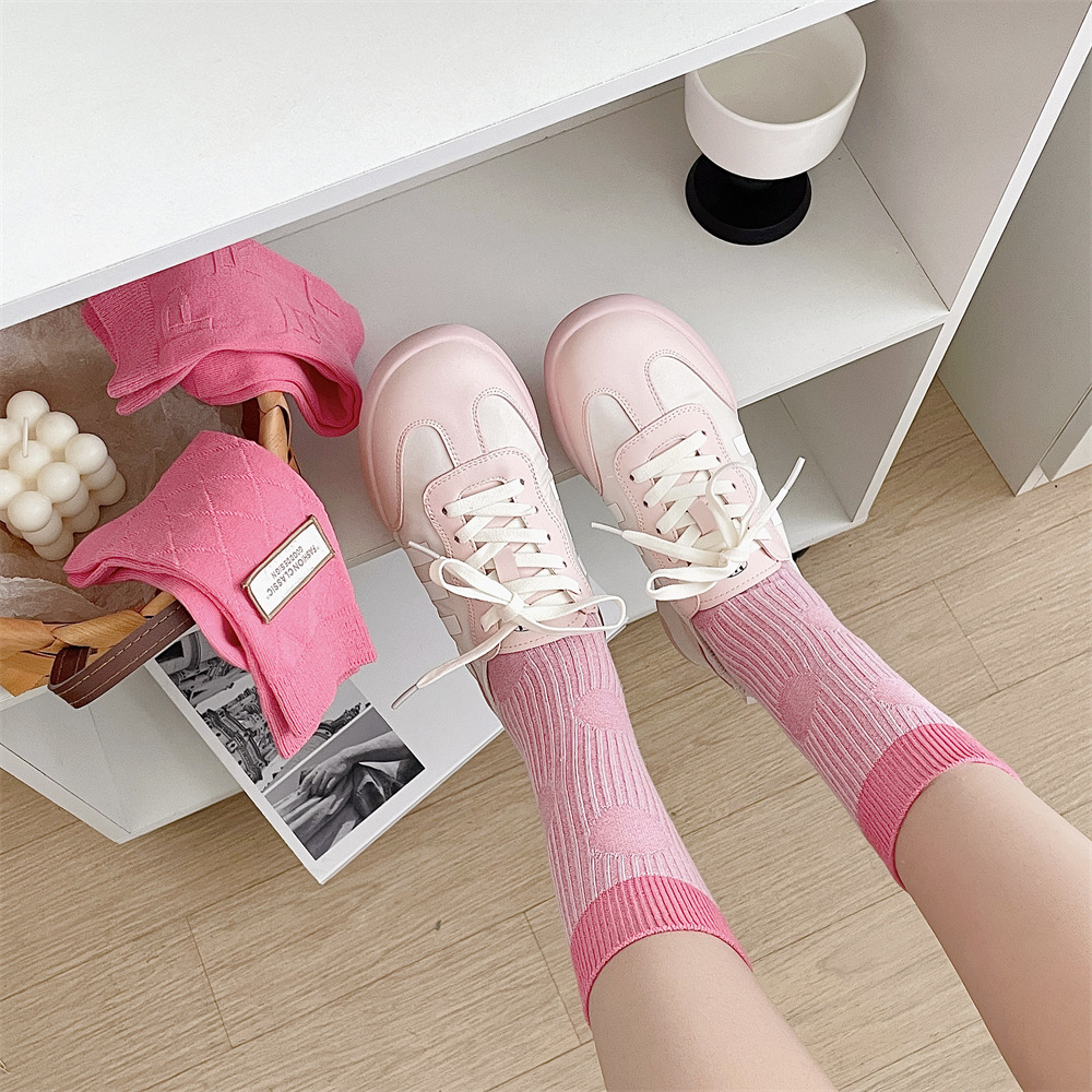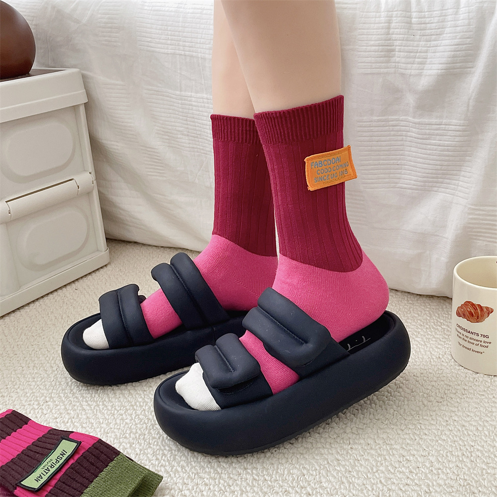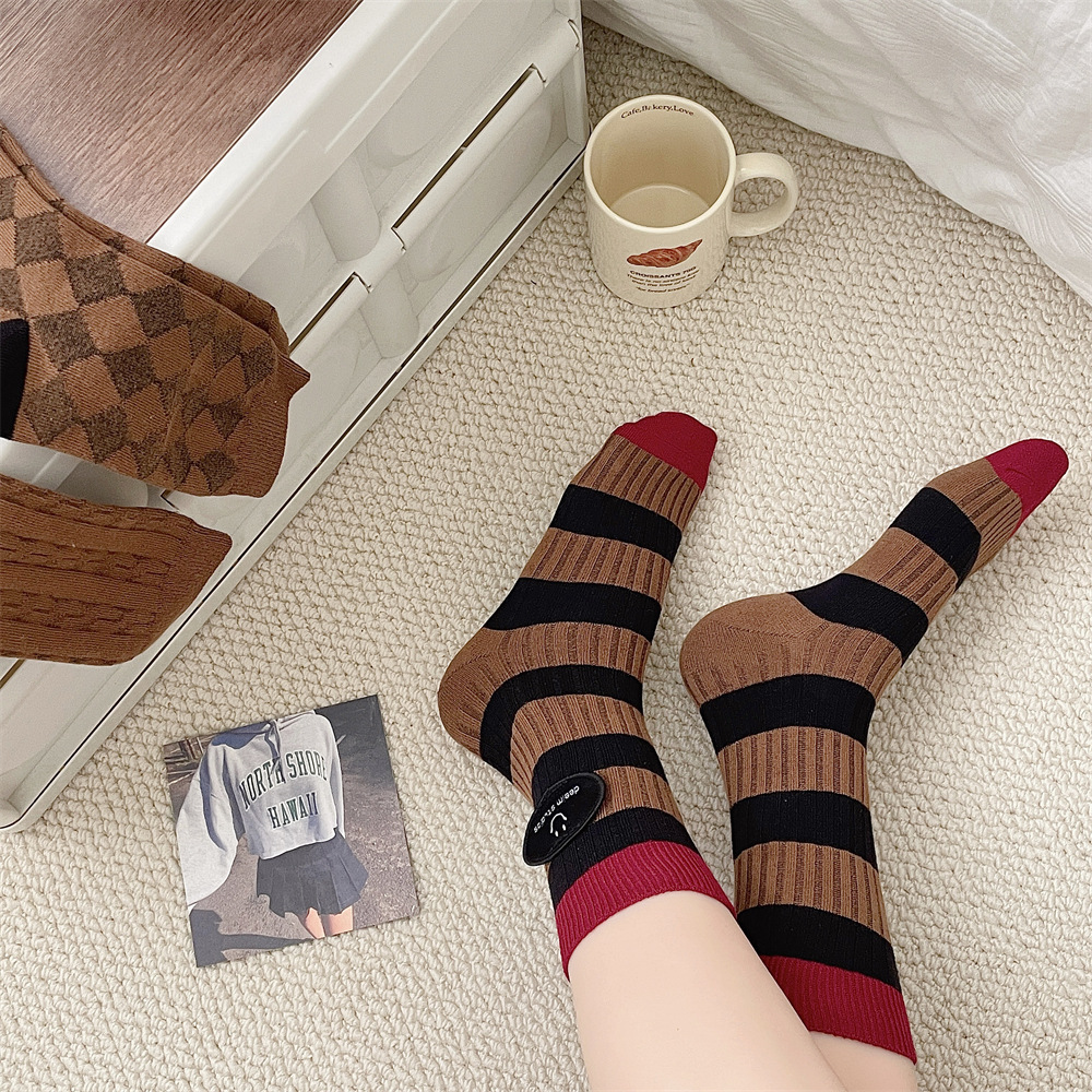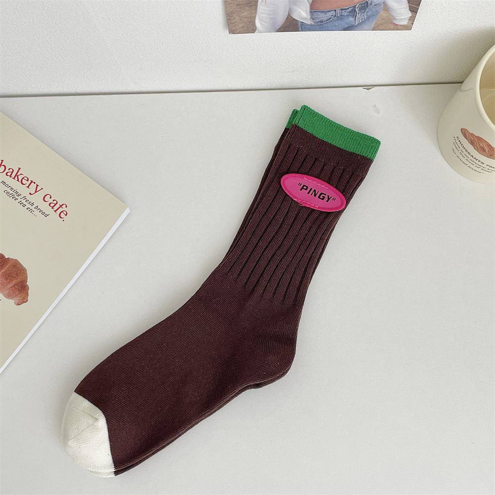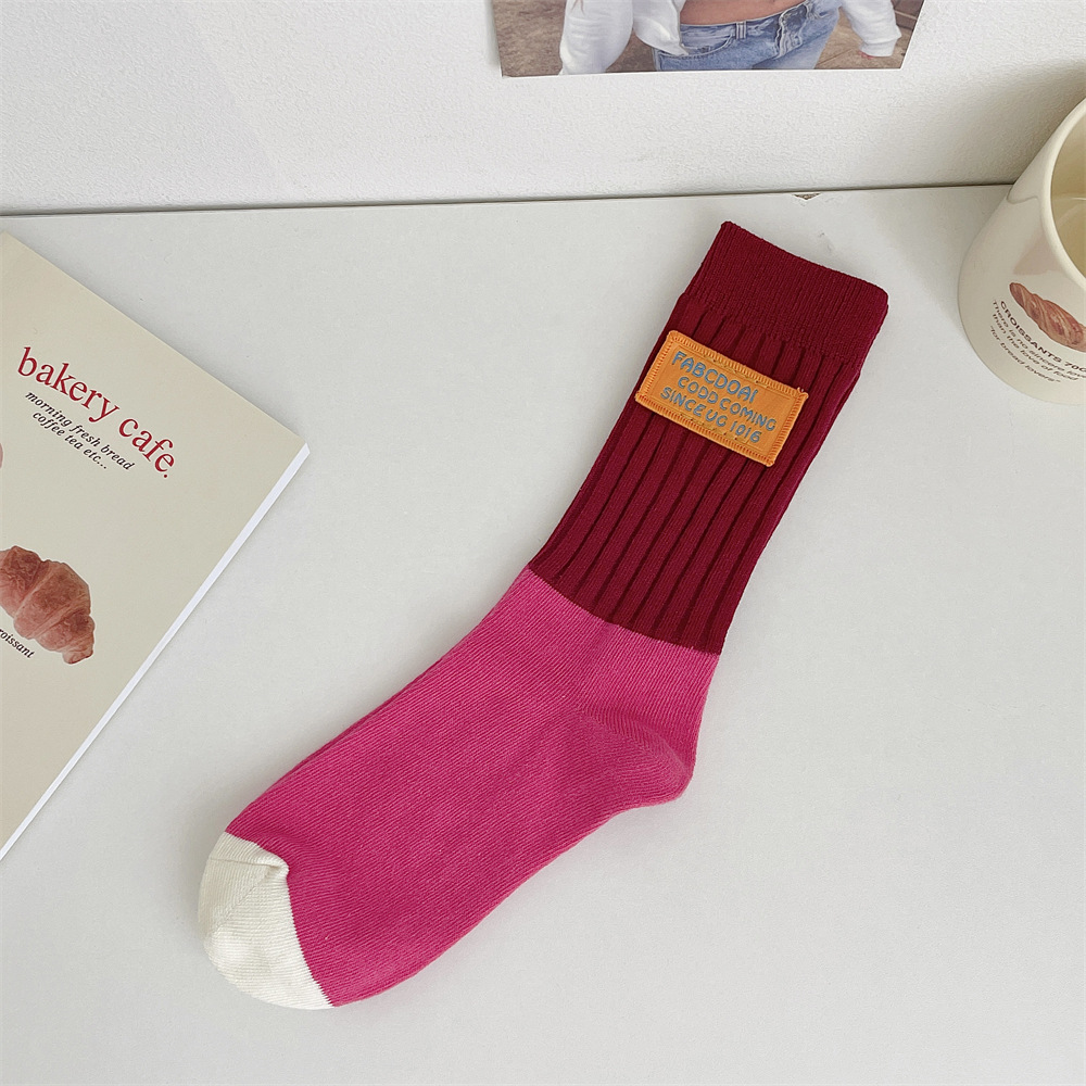 도파민 양말 여성 중간 배럴 대비 색상 Ins 일본 유행 양말 사계절 천 라벨 줄무늬 한국 스타일 스택 양말 스타킹
