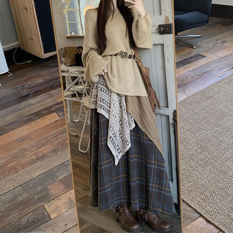 빈티지 디자인 센스 긴팔 어깨 불규칙한 니트웨어 세트 여성의 가을 게으른 스타일 높은 허리 스커트 두 조각