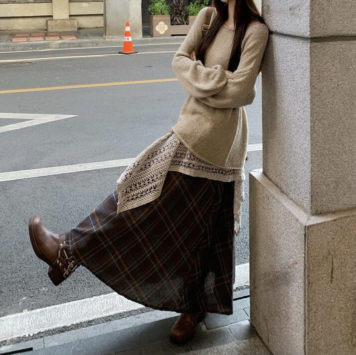빈티지 디자인 센스 긴팔 어깨 불규칙한 니트웨어 세트 여성의 가을 게으른 스타일 높은 허리 스커트 두 조각스토어 가기