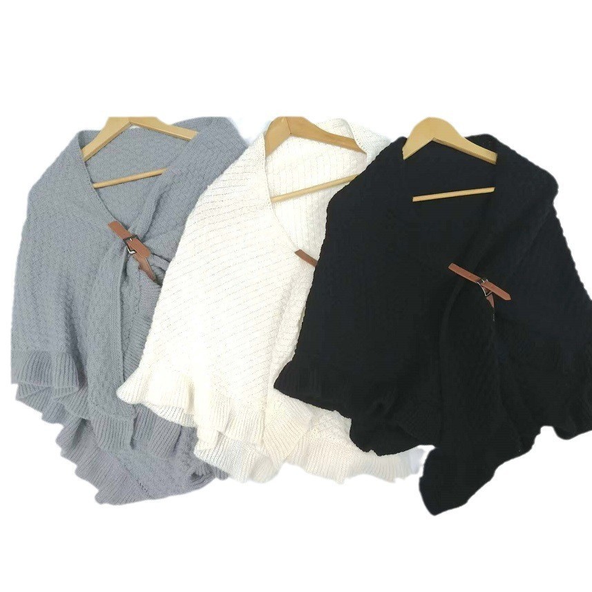 한국 스타일 삼각형 PU 가죽 버클 니트 러플 목도리 따뜻한 장식 스카프 목도리 외부 착용