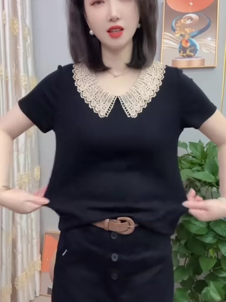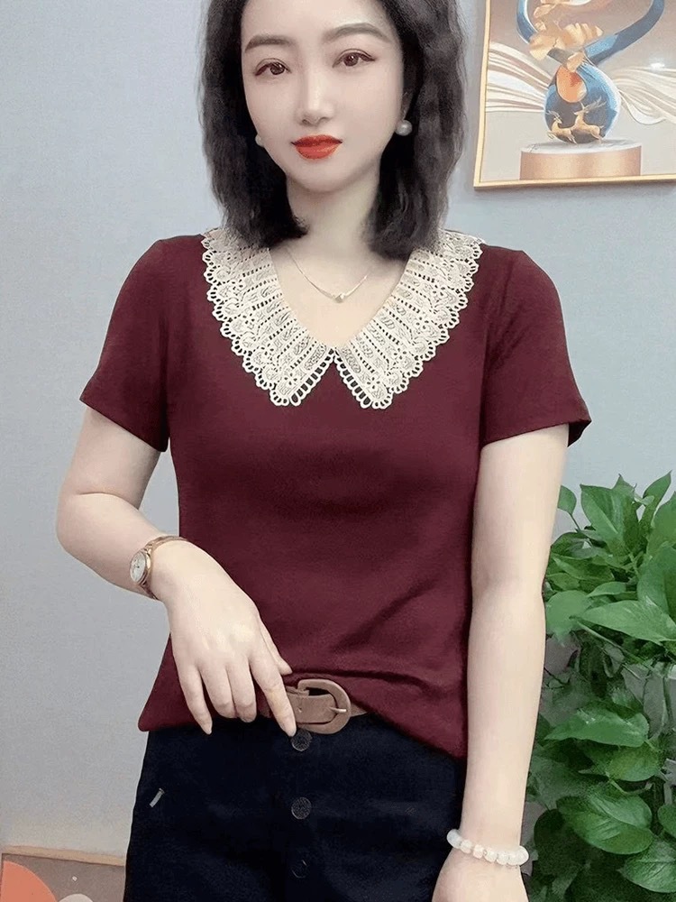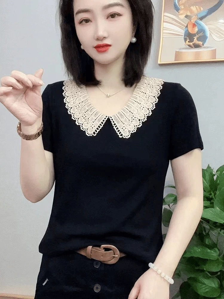 여름 슬리밍 반팔 티셔츠 여성용 레이스 칼라 솔리드 컬러 세련된 올 매치 뉴 에이지 감소 우아한 패션 여성 셔츠
