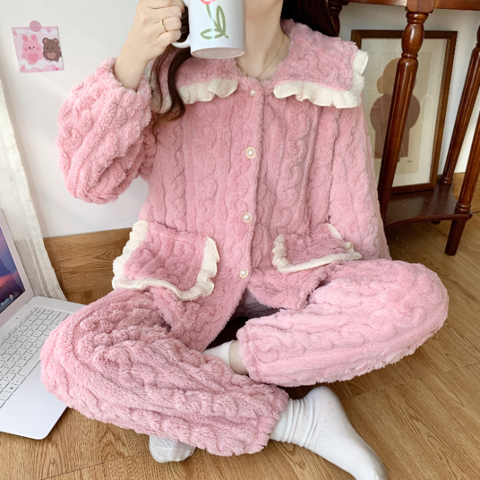 2024 겨울 새 기모 두꺼운 공주 스타일 옷깃 달콤한 카디건 파자마 홈 의류 세트