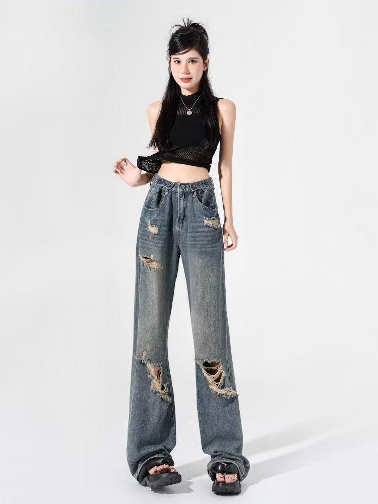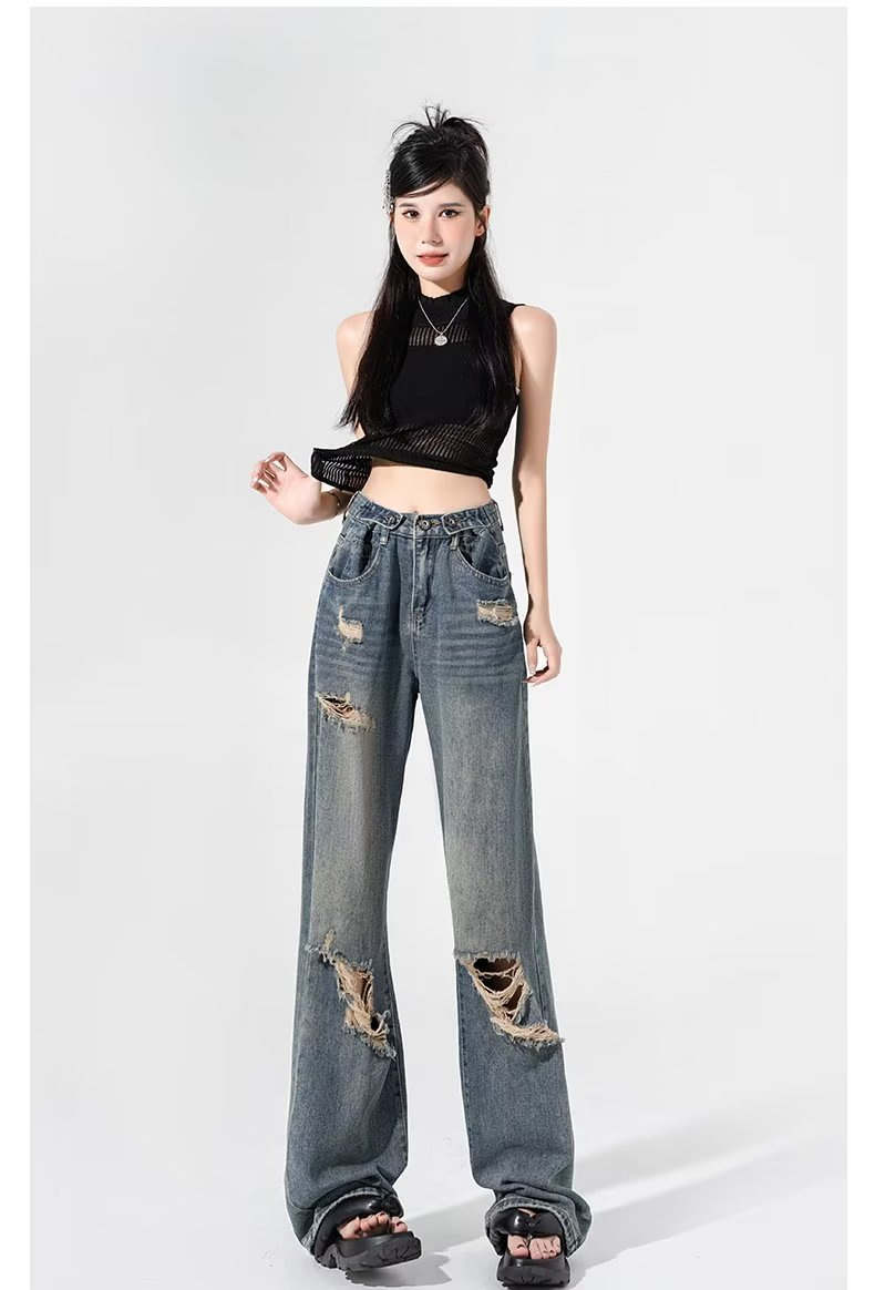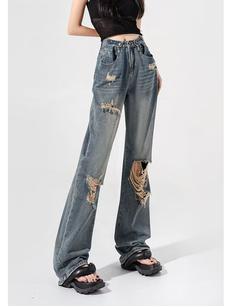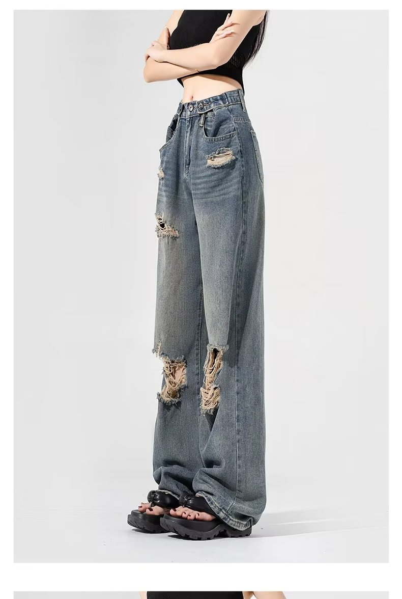 2024 새로운 찢어진 스트레이트 청바지 여성의 가을과 겨울 높은 허리 슬리밍 느슨한 넓은 다리 긴 바지