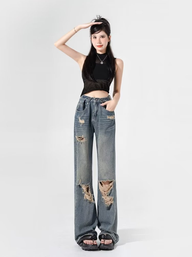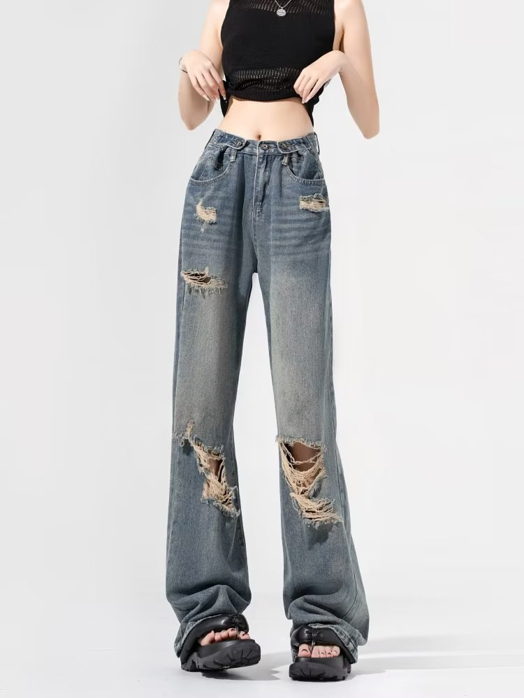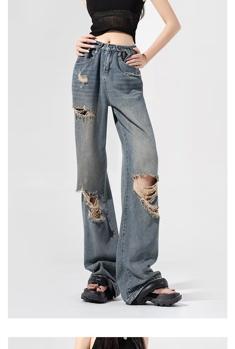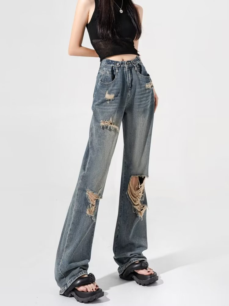 2024 새로운 찢어진 스트레이트 청바지 여성의 가을과 겨울 높은 허리 슬리밍 느슨한 넓은 다리 긴 바지