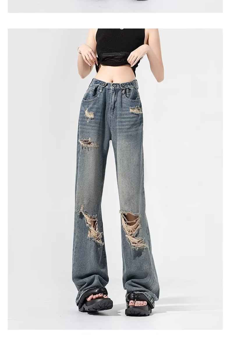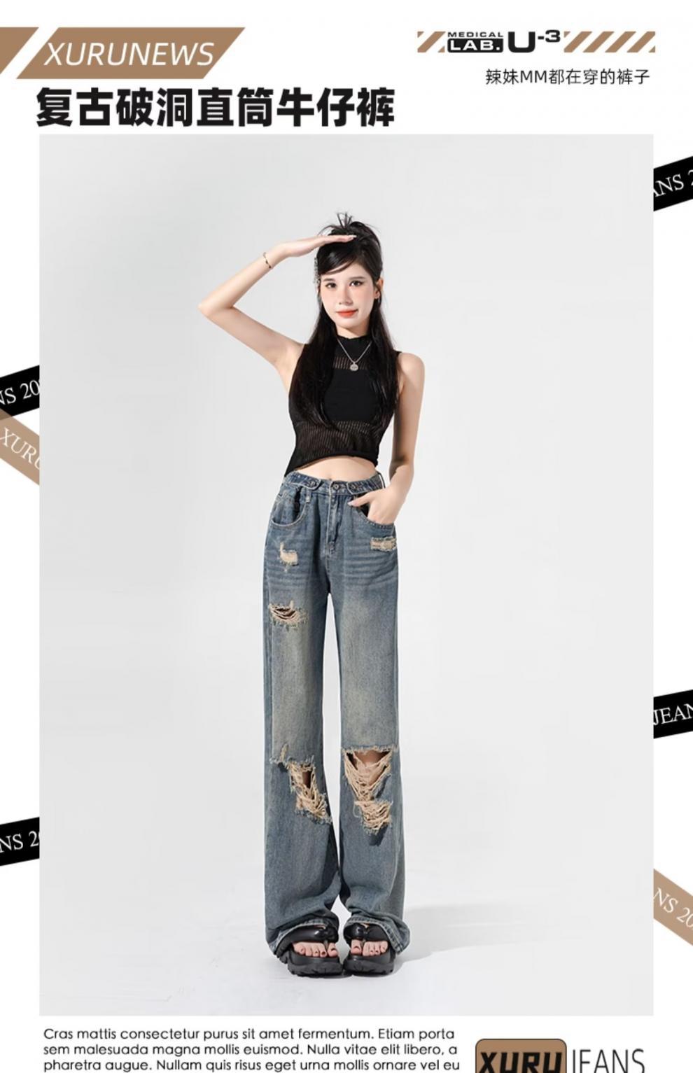 2024 새로운 찢어진 스트레이트 청바지 여성의 가을과 겨울 높은 허리 슬리밍 느슨한 넓은 다리 긴 바지스토어 가기