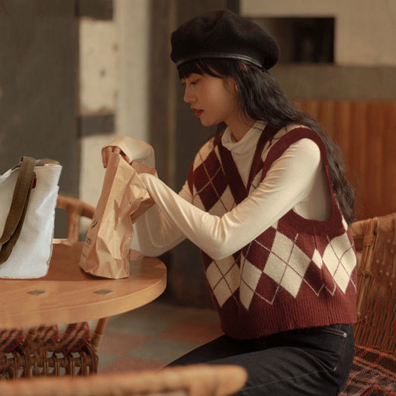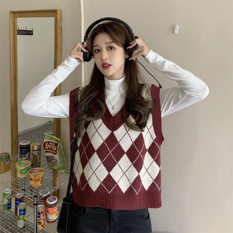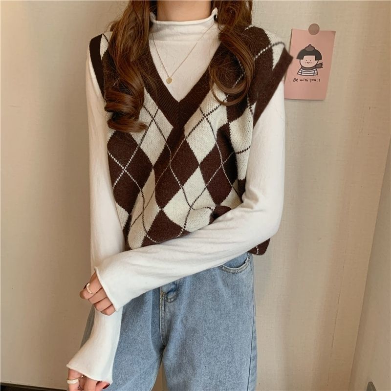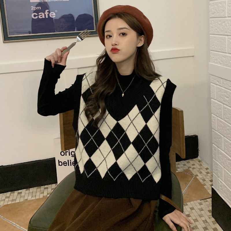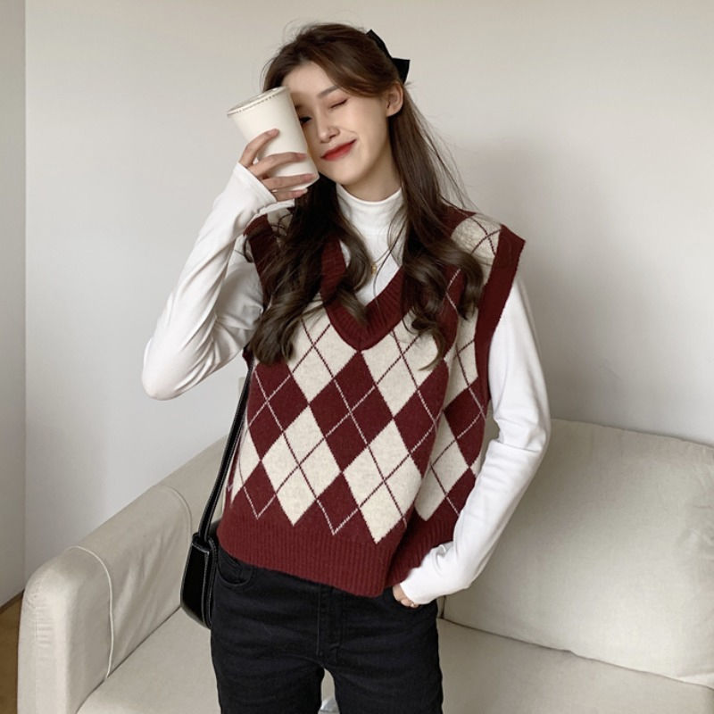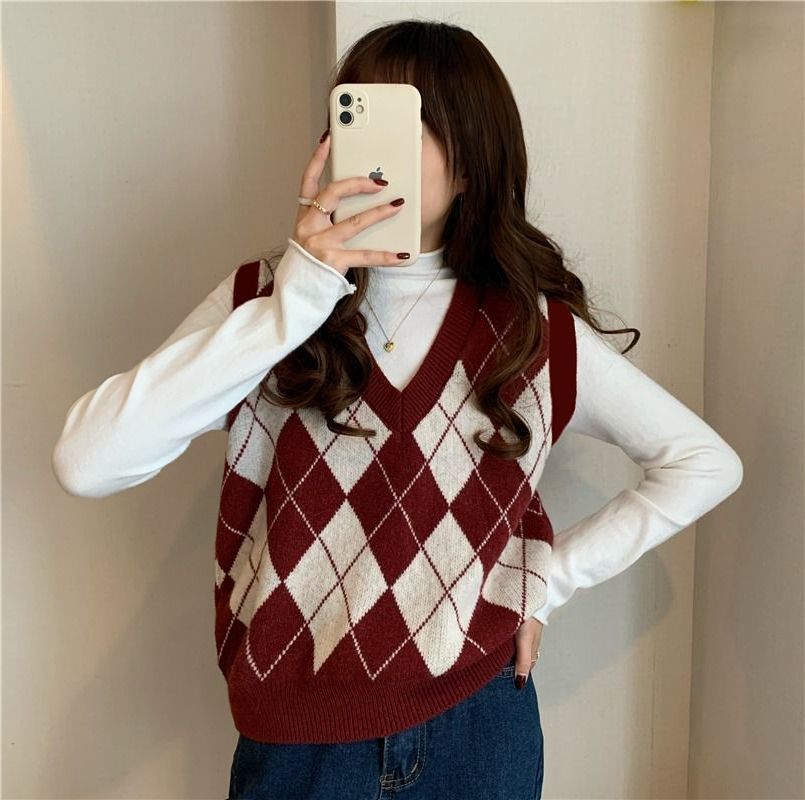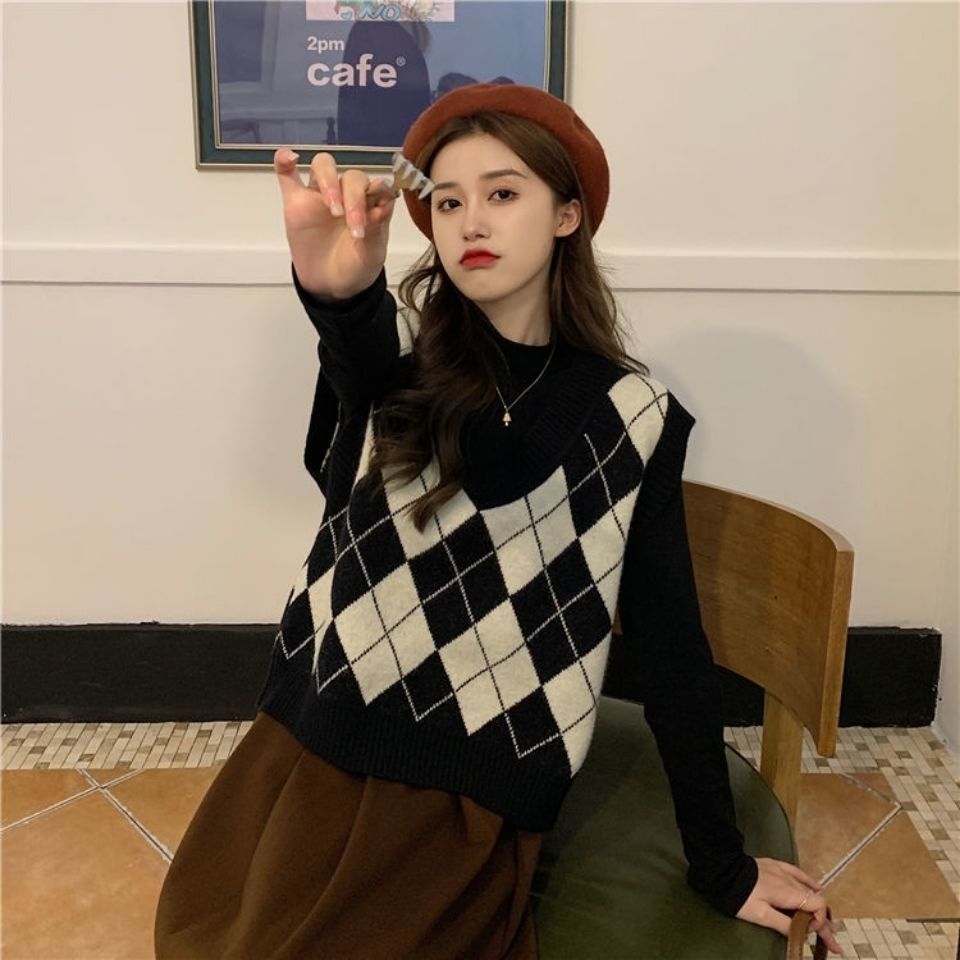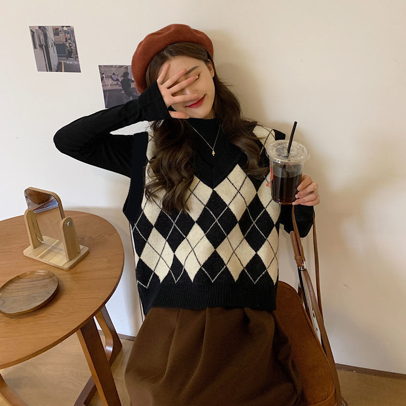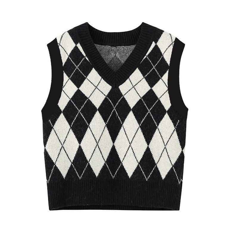 빈티지 마름모꼴 니트 조끼 여자 아우터웨어 새로운 도착 2024 봄 한국 스웨터 조끼 재킷 루즈 탑 올 매치스토어 가기