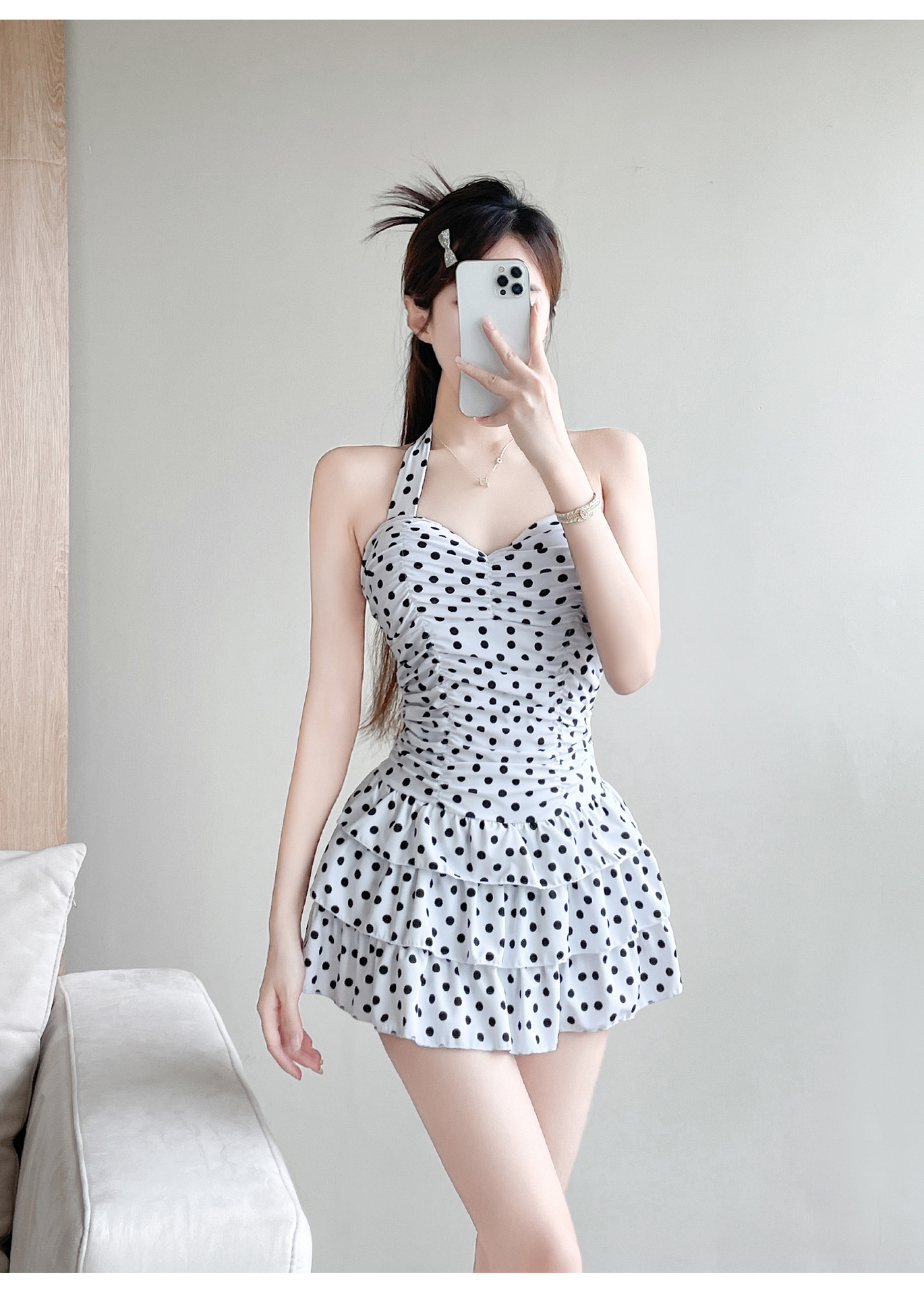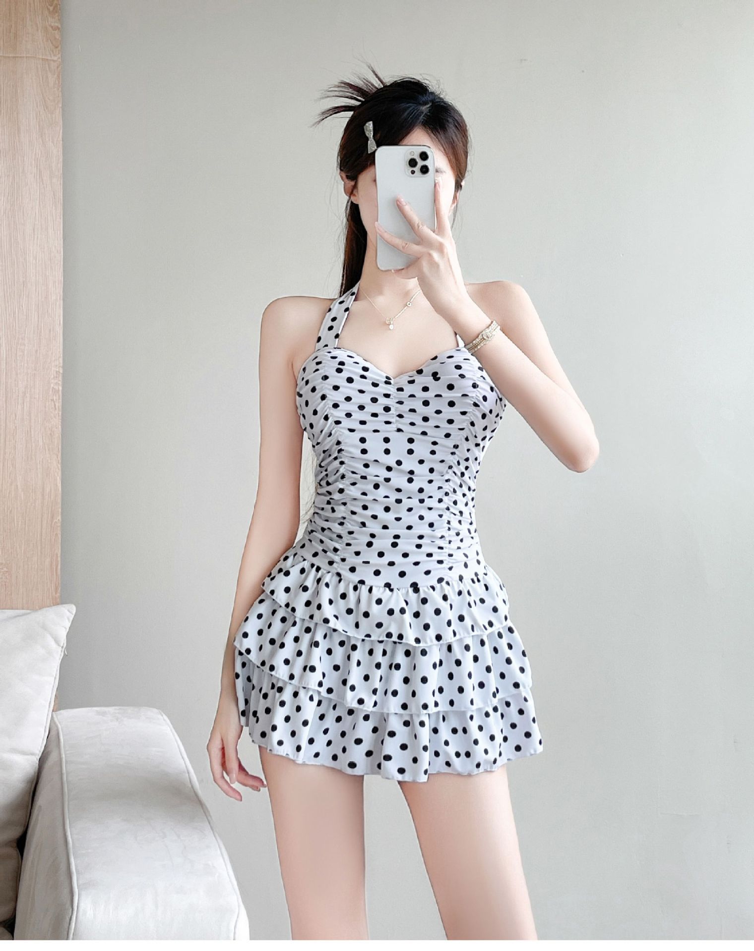 2024 새로운 스타일 슬림 스커트 설문 조사 도트 통통한 소녀 수영복 여성의 보수적 인 슬림 룩 살을 덮고있는 섹시한 크기 가슴 모임스토어 가기