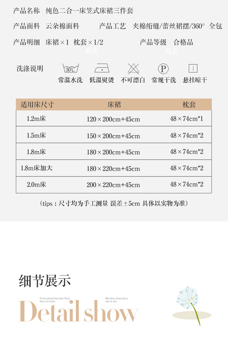 • 2.0m 침대 [싱글 침대 스커트 200x220cm + 퀼팅 베갯잇 한 쌍]