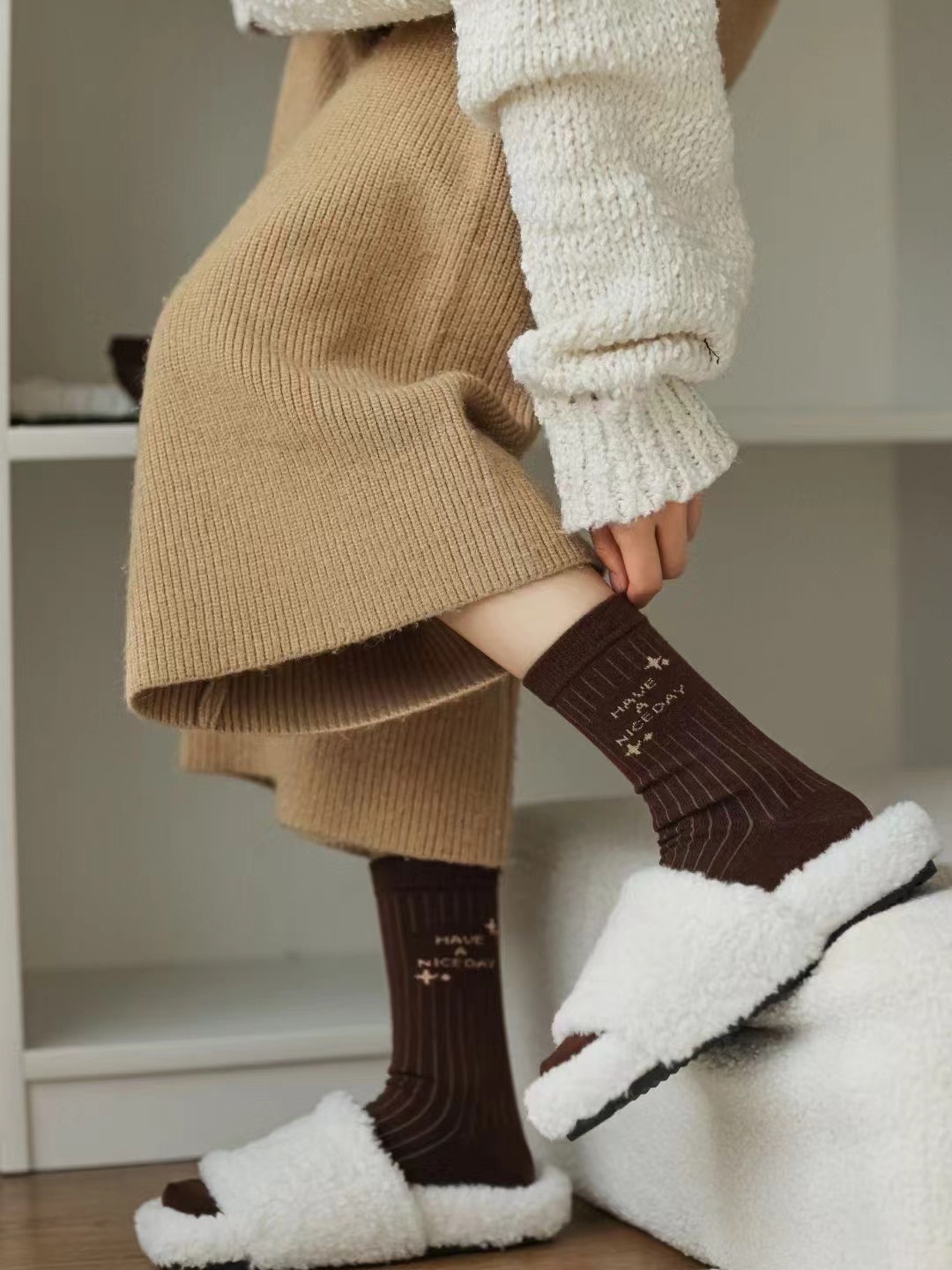 가을과 겨울 다크 브라운 부드럽고 섬세한 캐시미어 양말 여성 한국 스타일 활 중간 더미 양말 귀여운 만화 편지 더미 양말스토어 가기