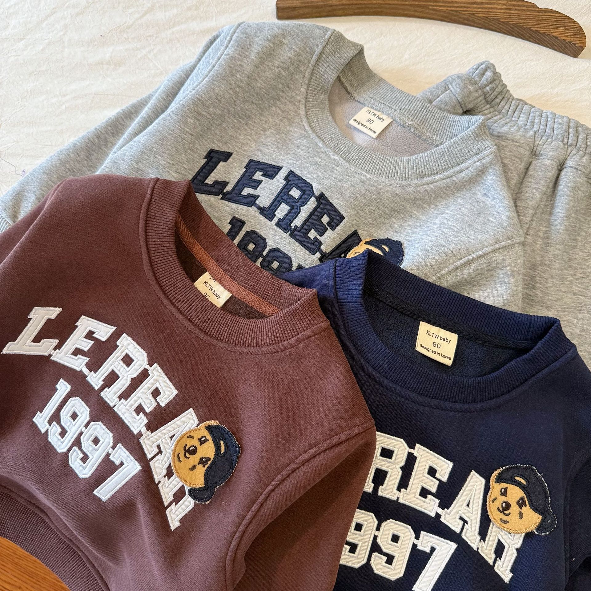 어린이 세트 2024 소년 소녀를위한 아기 기모 스웨터 편지 풀오버 곰 스웨터 바지 어린이 크루 넥 투피스 세트스토어 가기