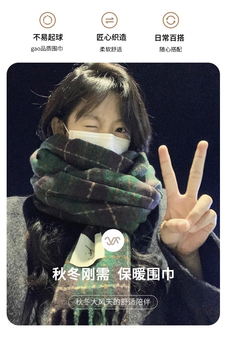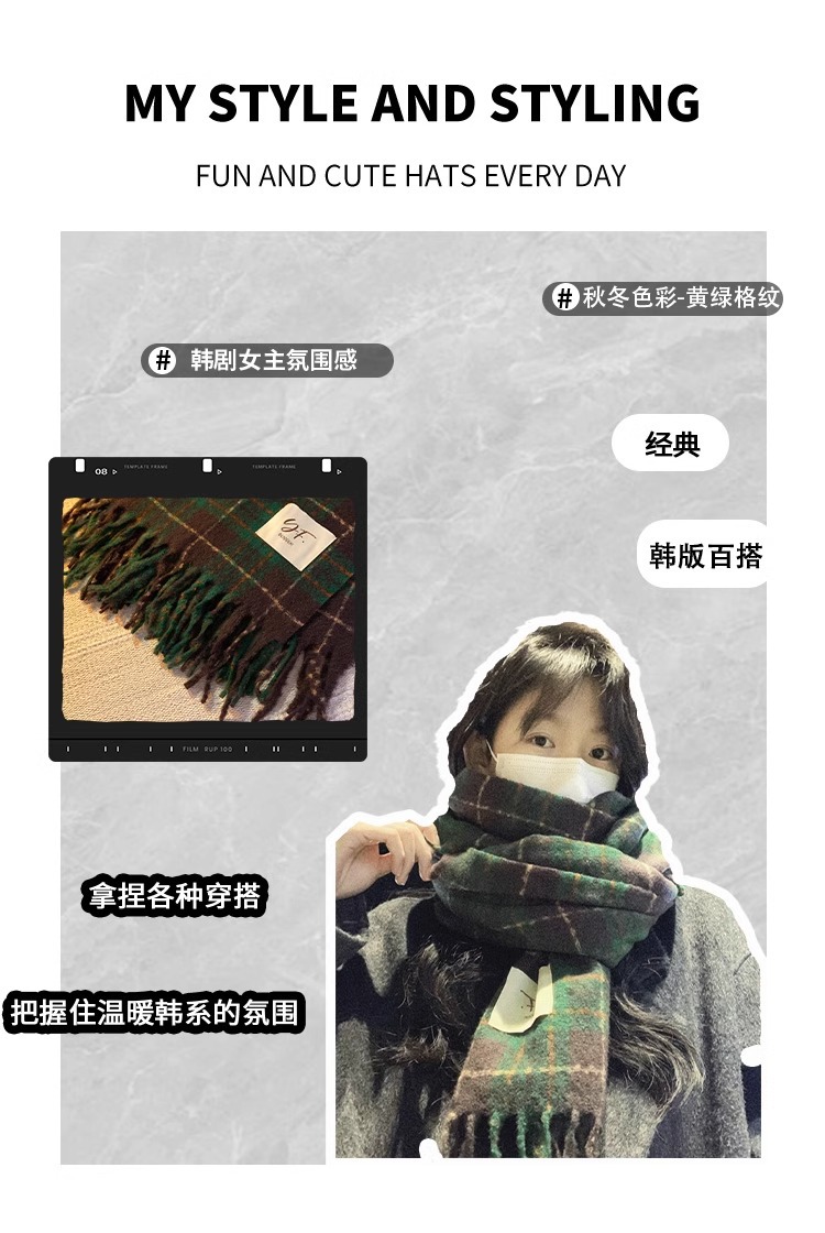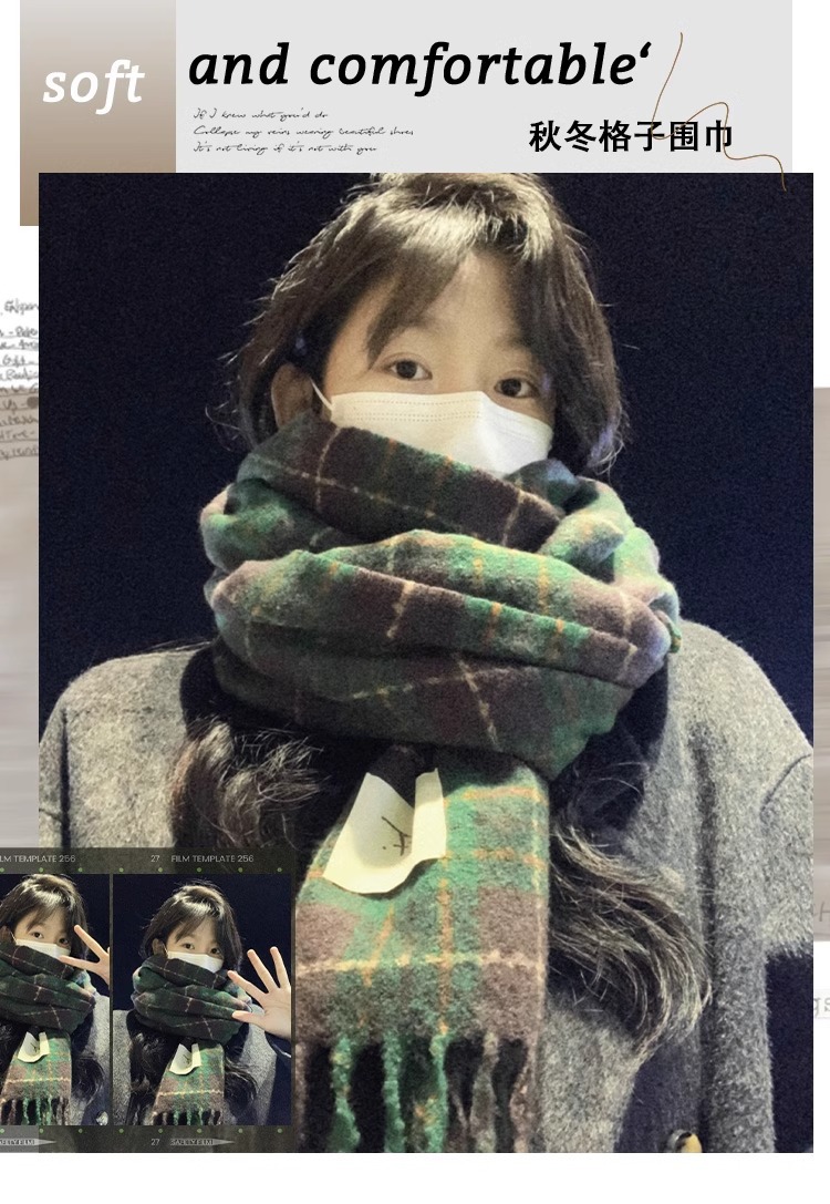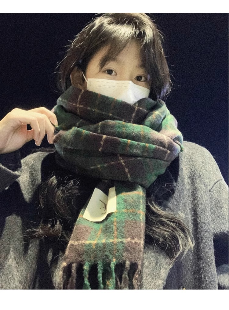 녹색 격자 무늬 니트 스카프 여성의 가을과 겨울 2024 새로운 한국 복고풍 두꺼운 따뜻한 분위기 스카프스토어 가기