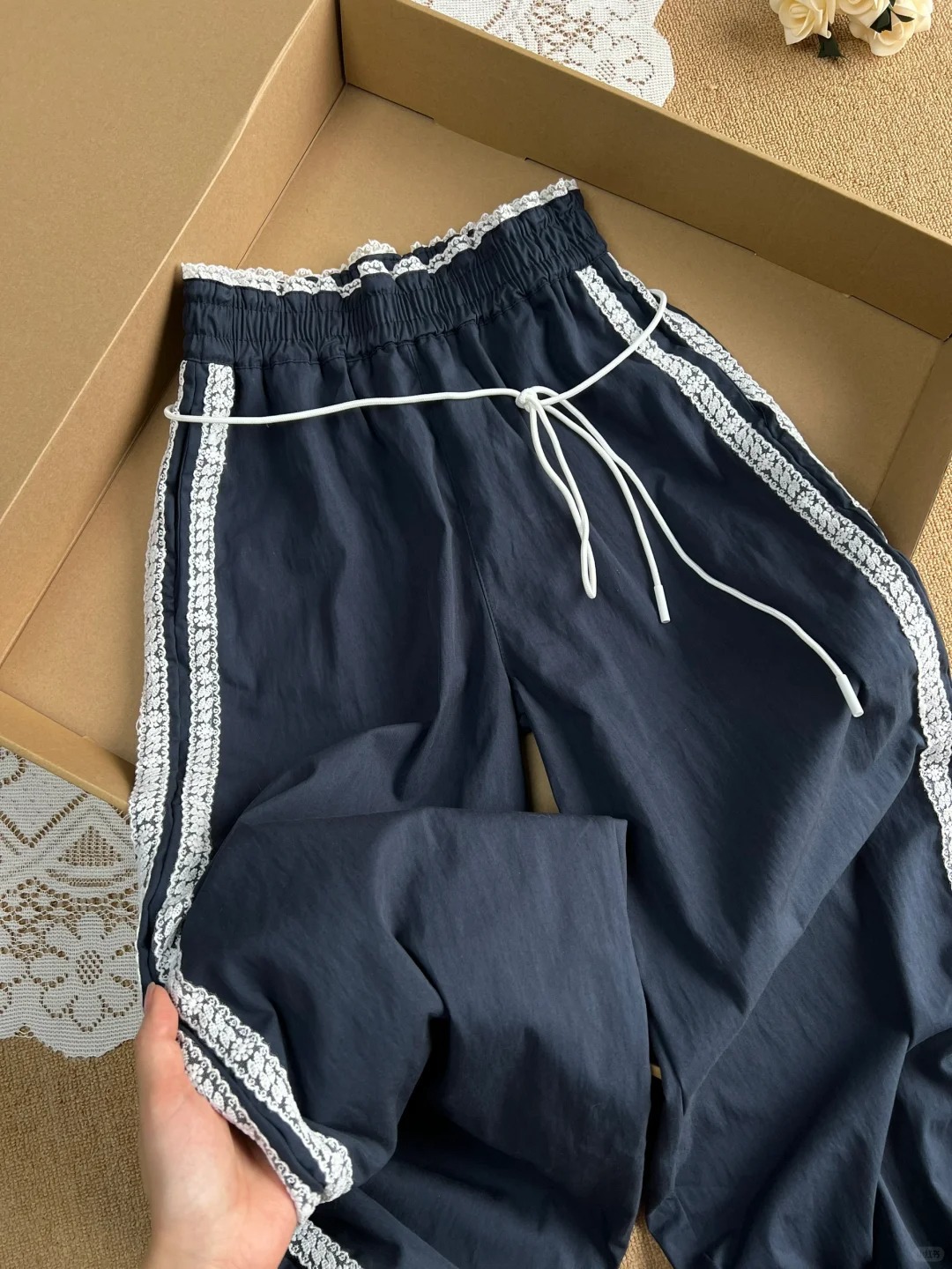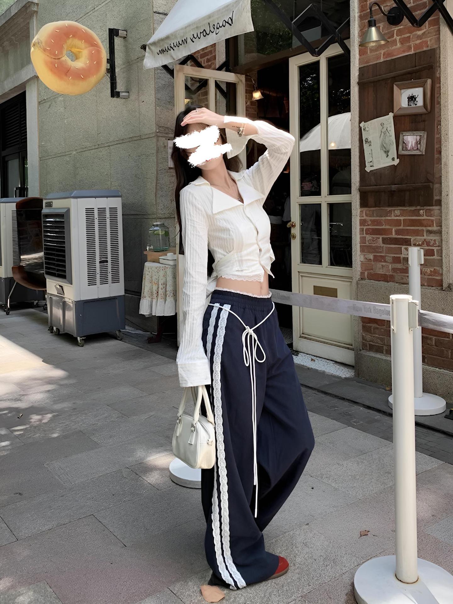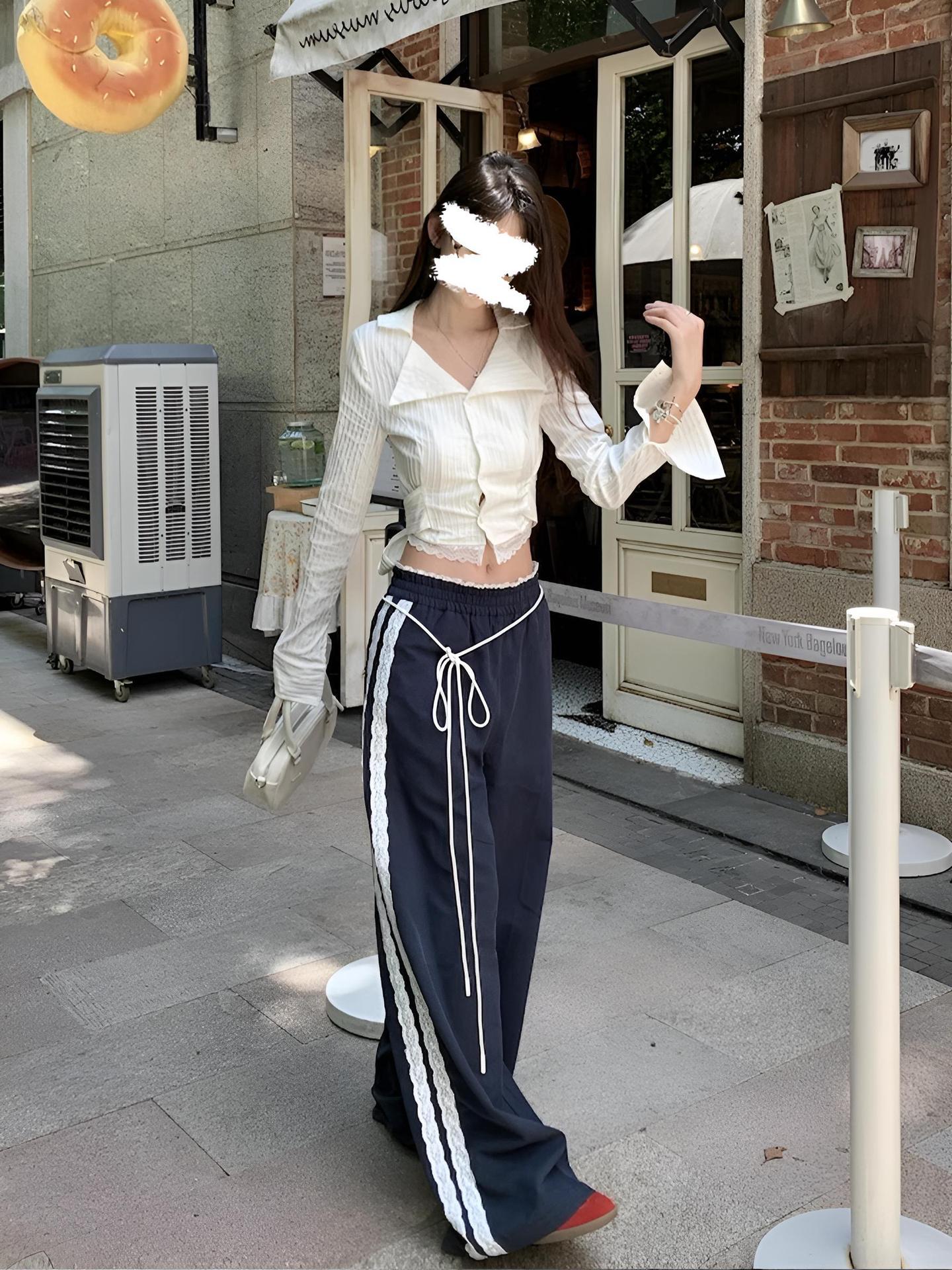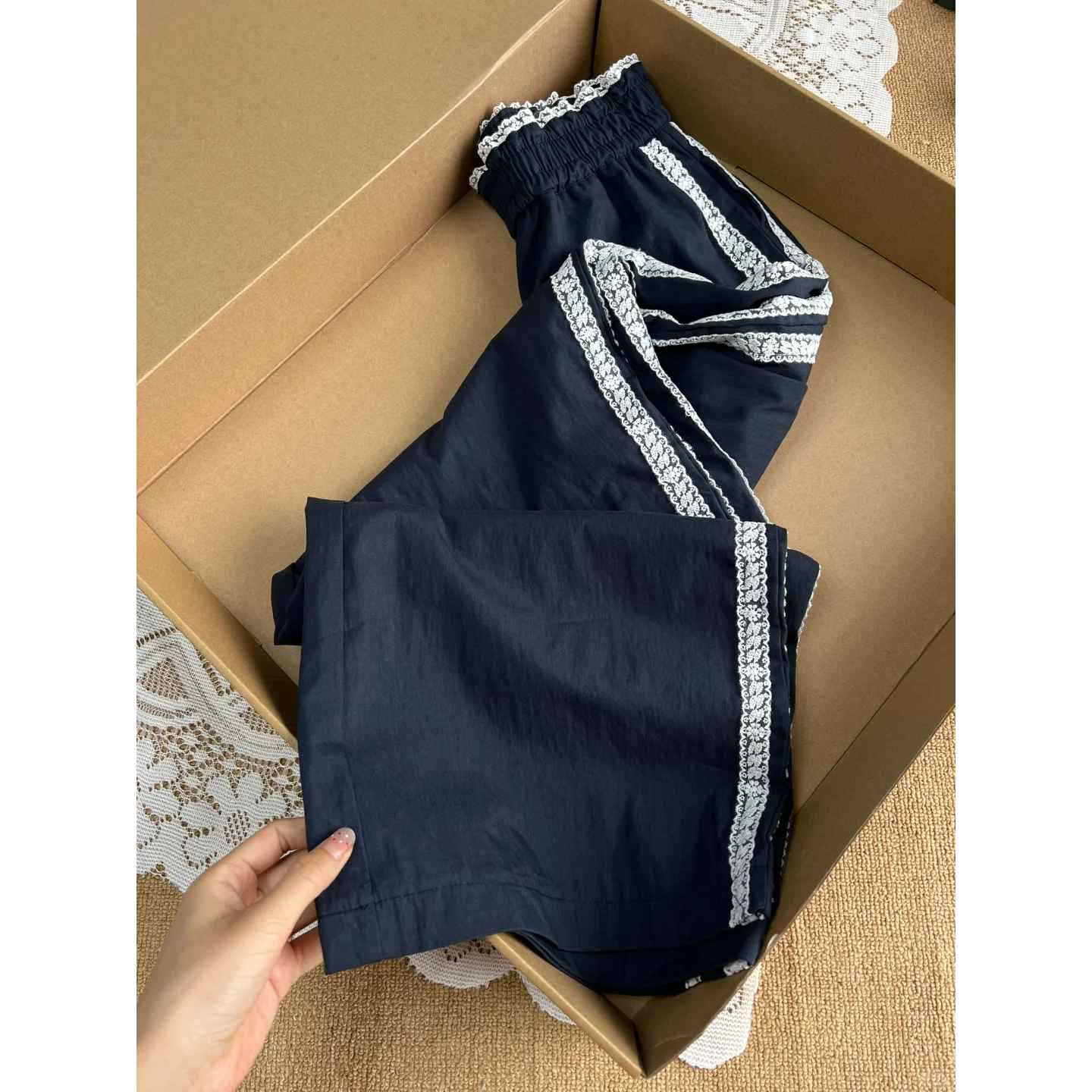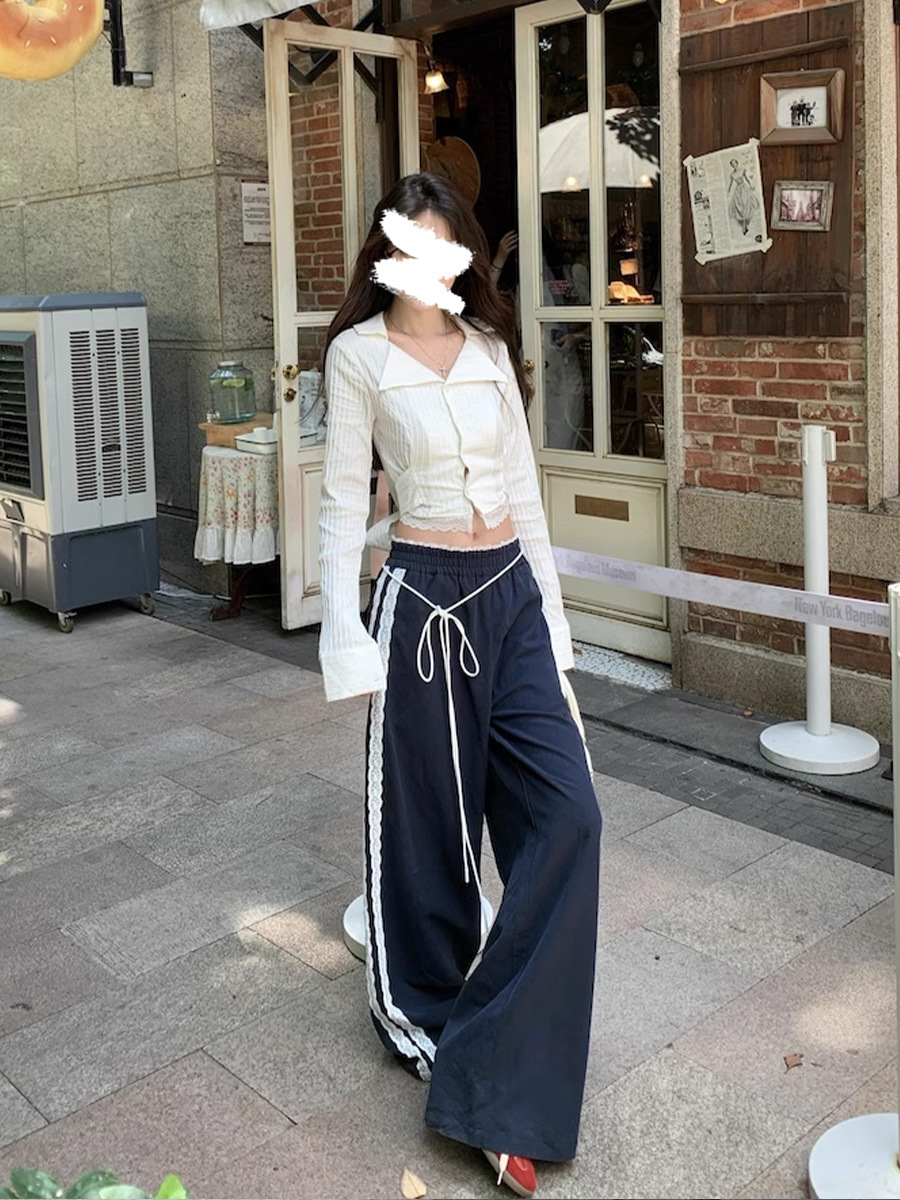 티베트 블루 레이스 바느질 디자인 센스 캐주얼 바지 여성의 봄과 가을 새로운 틈새 느슨한 올매치 스트레이트 바지