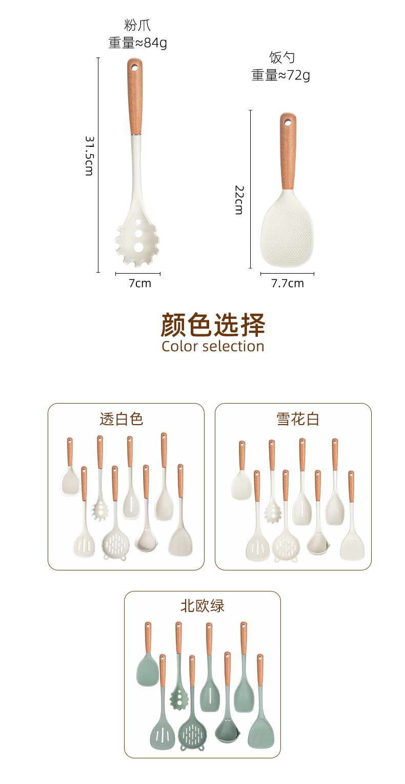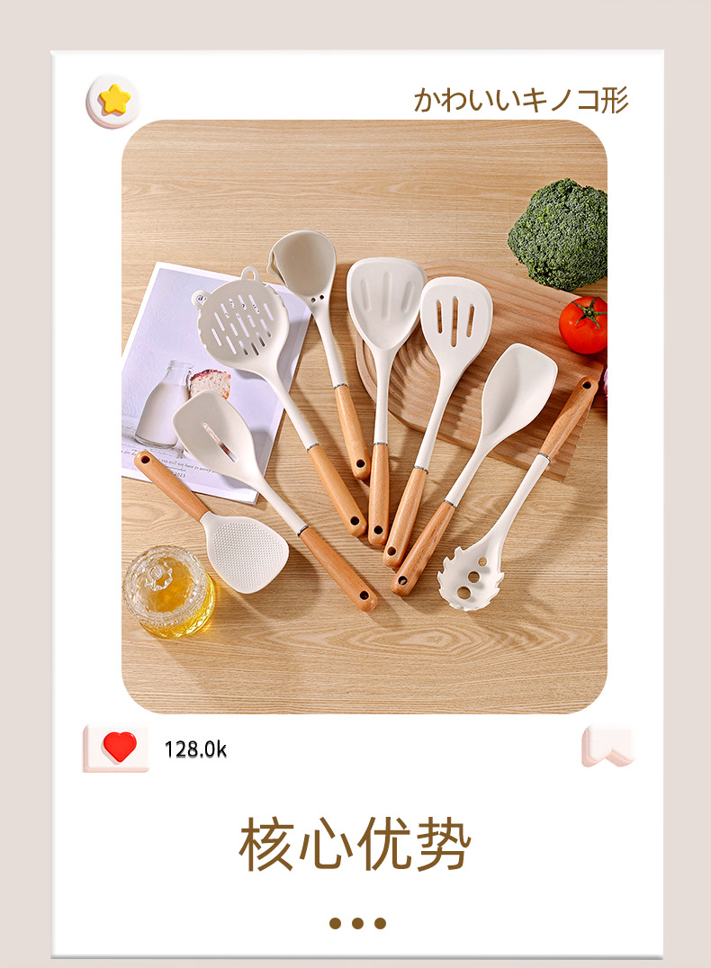 2024 새로운 너도밤 손잡이 실리콘 주방용품 세트 주방 비 스틱 웍 삽 수프 스푼 가정용 실리콘 삽스토어 가기