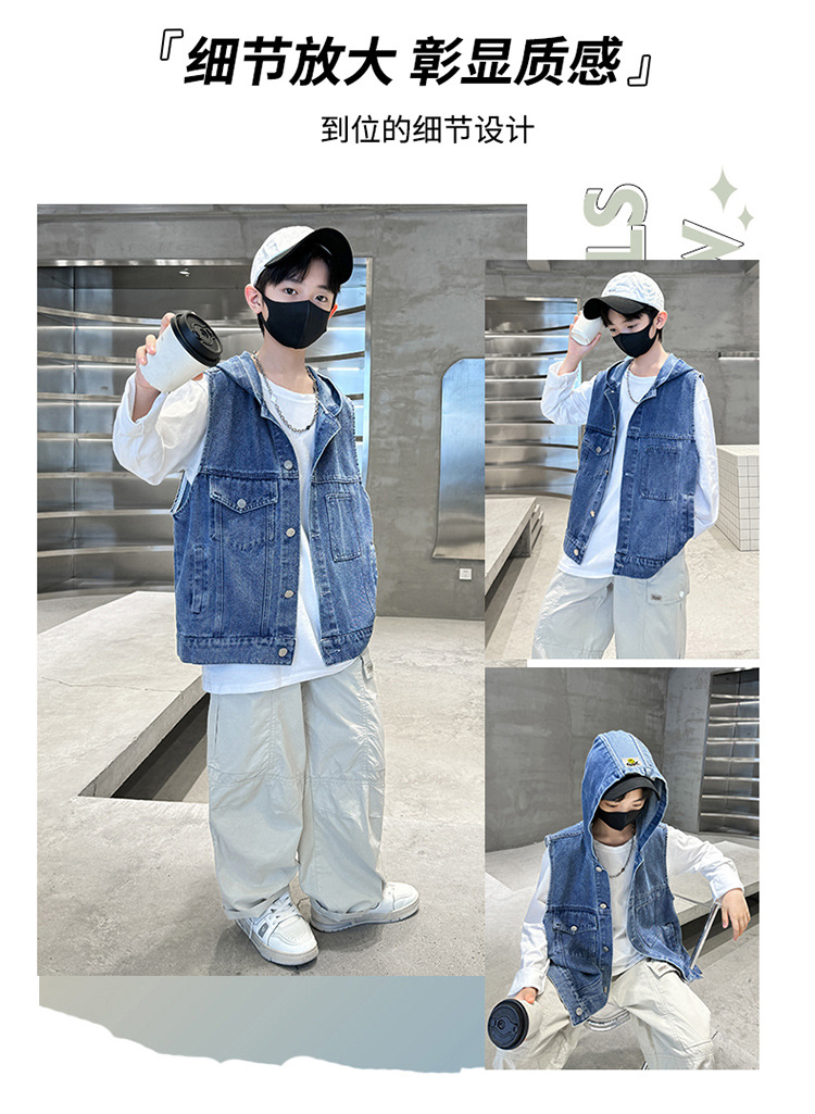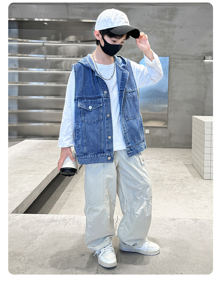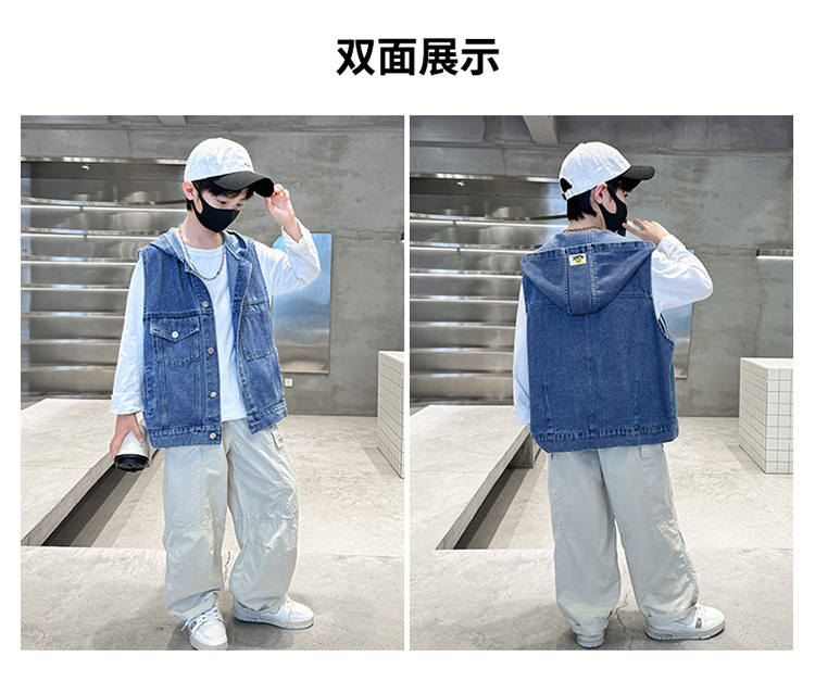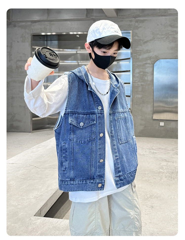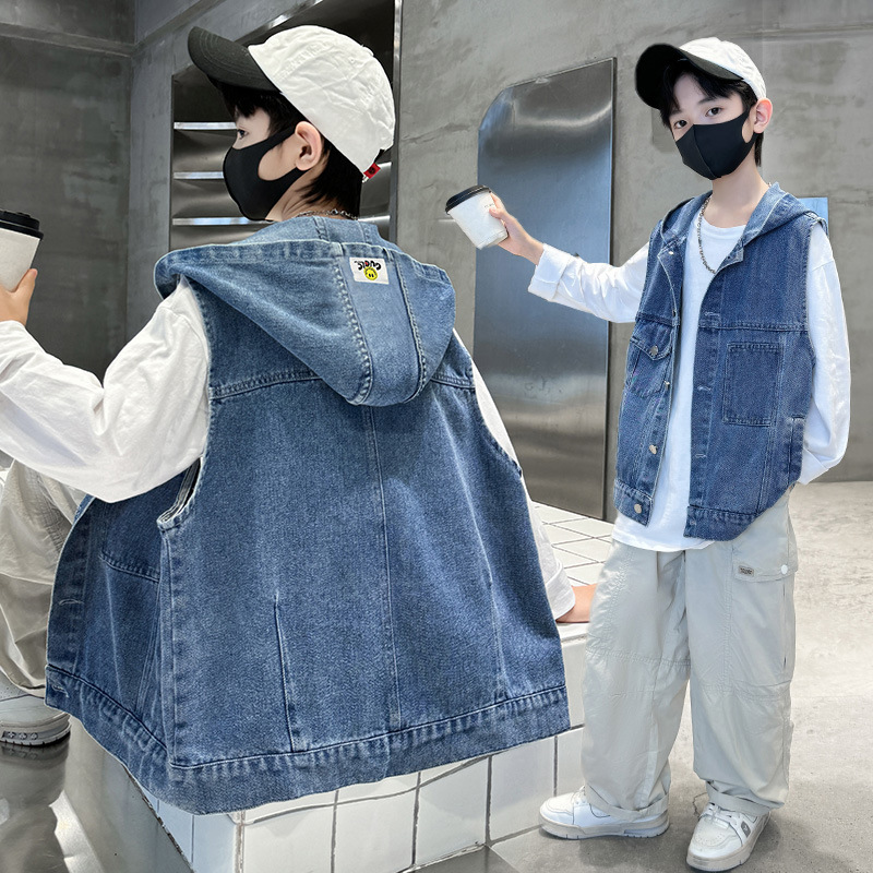 어린이 후드 조끼 소년 가을 2024 새로운 어린이 봄과 가을 데님 어깨 착용 가을 소년 탑스토어 가기