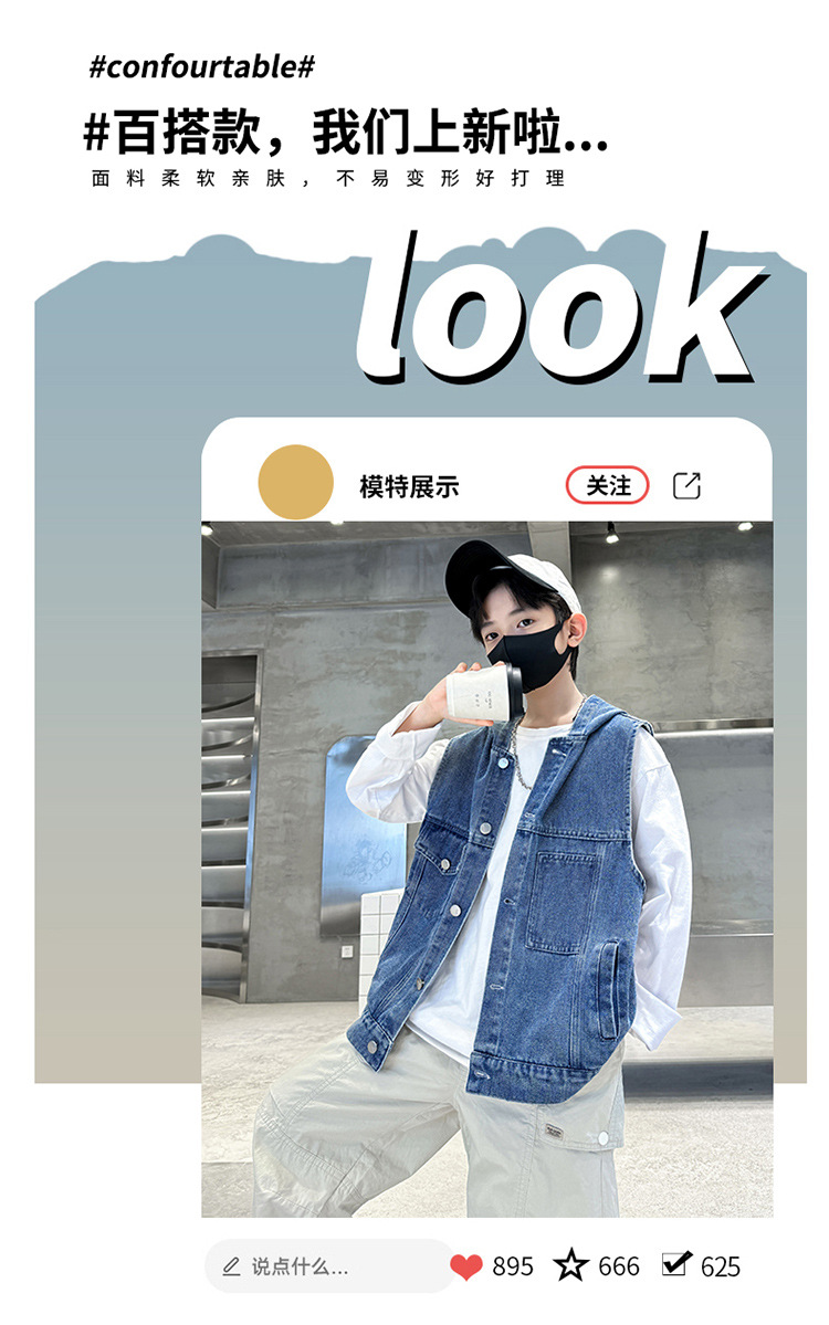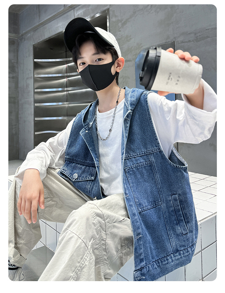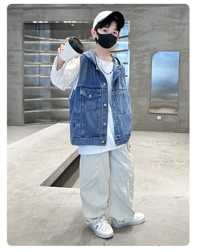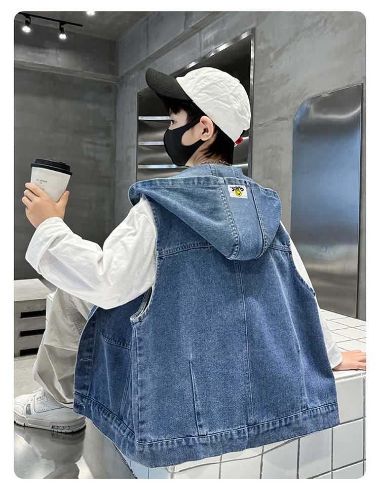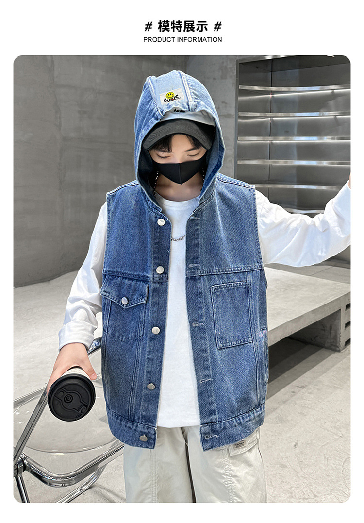 어린이 후드 조끼 소년 가을 2024 새로운 어린이 봄과 가을 데님 어깨 착용 가을 소년 탑스토어 가기