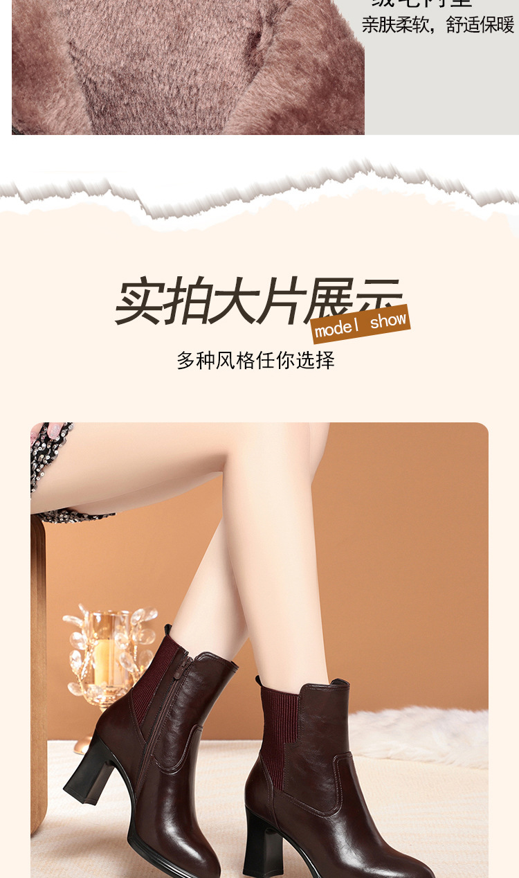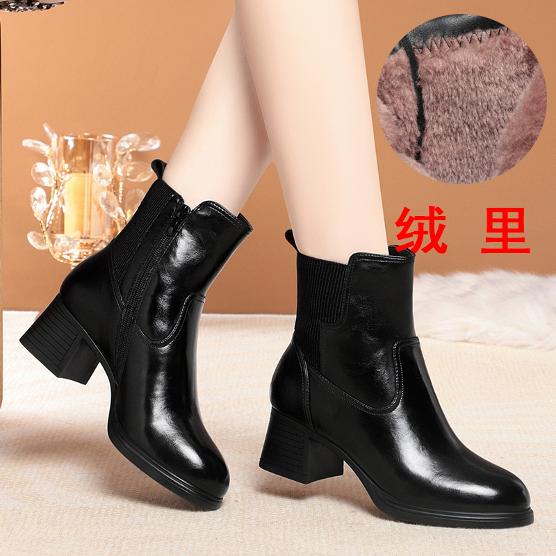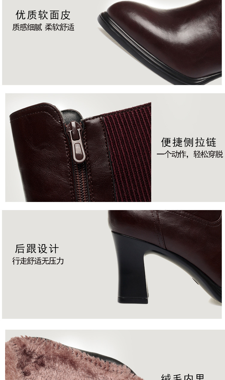 하이힐 쇼트 부츠 여성용 기모 신발 가죽 두꺼운 굽의 어머니면 신발 조커 캣워크 부츠
