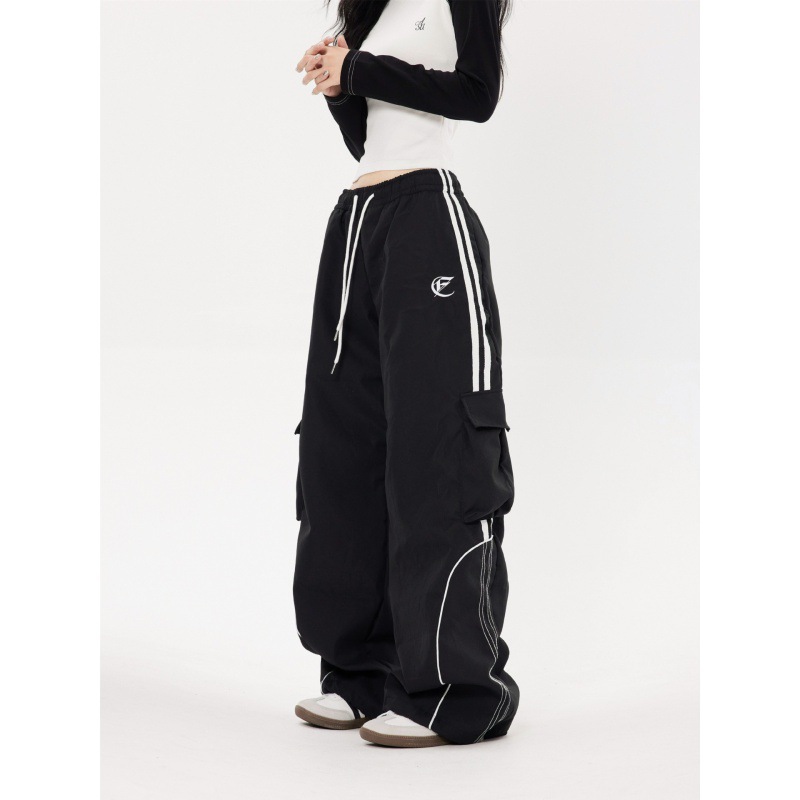 미국식 하이 스트리트 탄성 허리 줄무늬 캐주얼 바지 남성과 여성의 새로운 느슨한 스트레이트 레그 스포츠 댄스 와이드 레그 바지스토어 가기