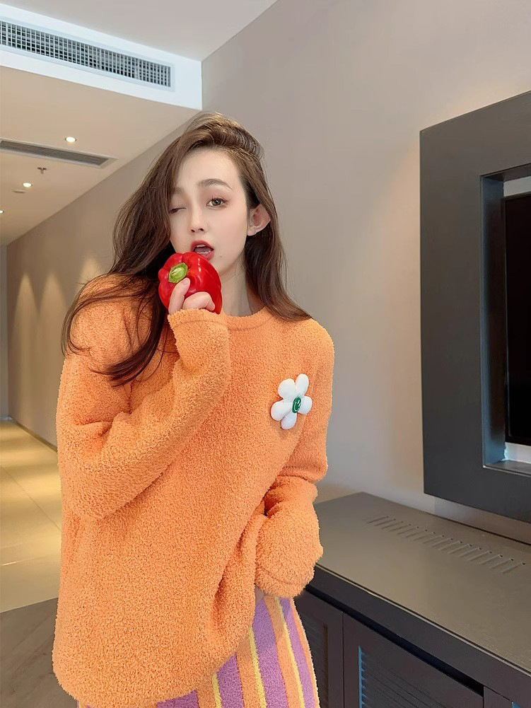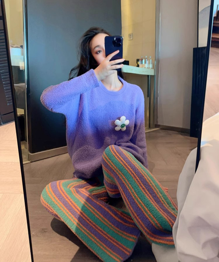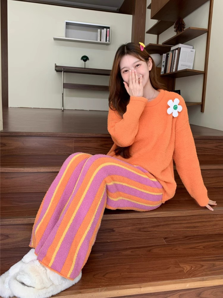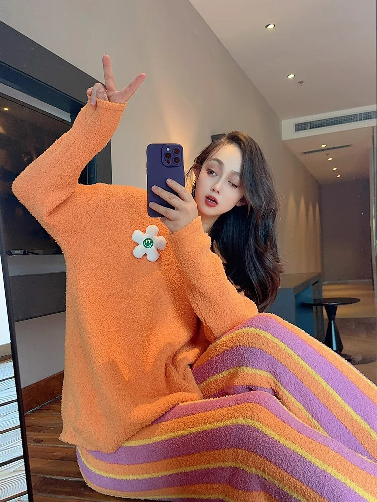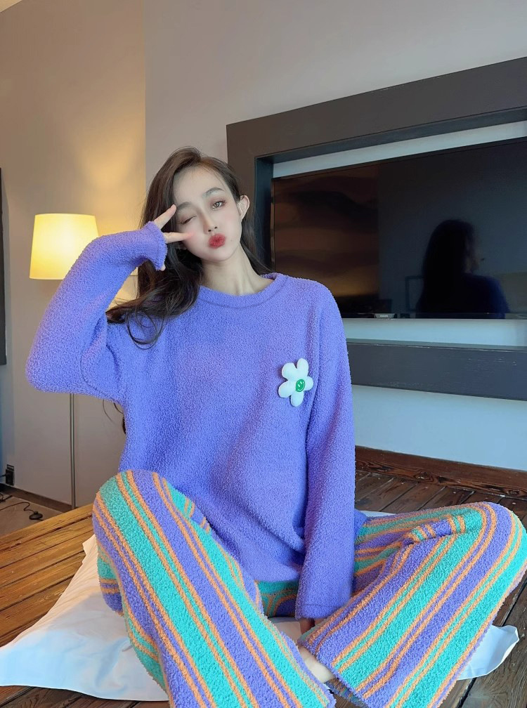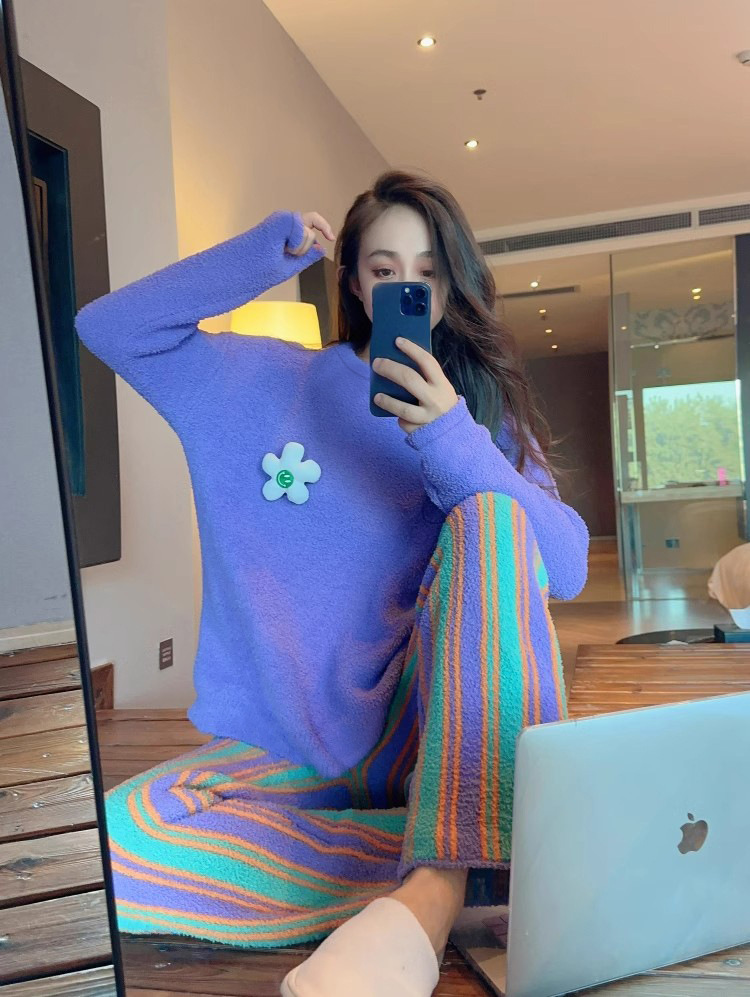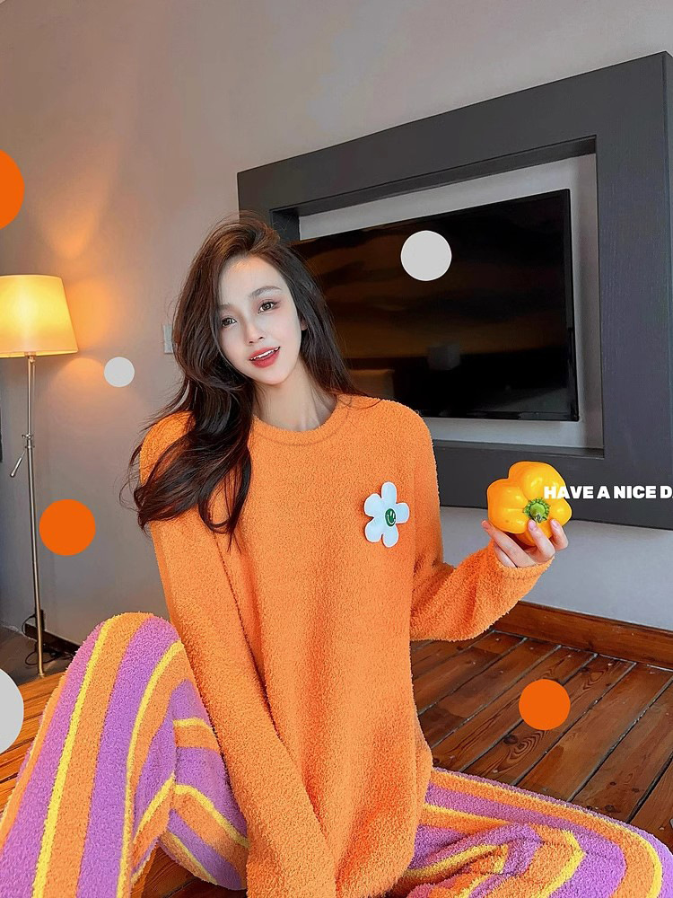 새로운 스타일의 심플한 하프 벨벳 홈웨어 세트, 가을 겨울 스타일, 부드럽고 달콤하며 캐주얼한 여성용 긴팔 잠옷스토어 가기