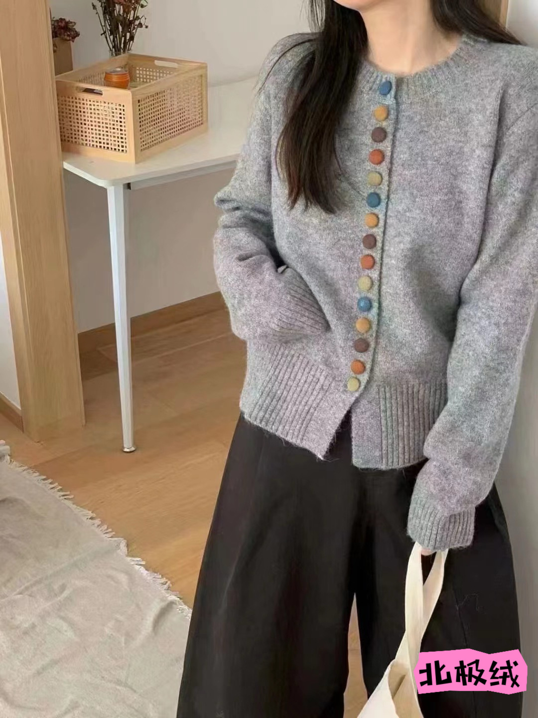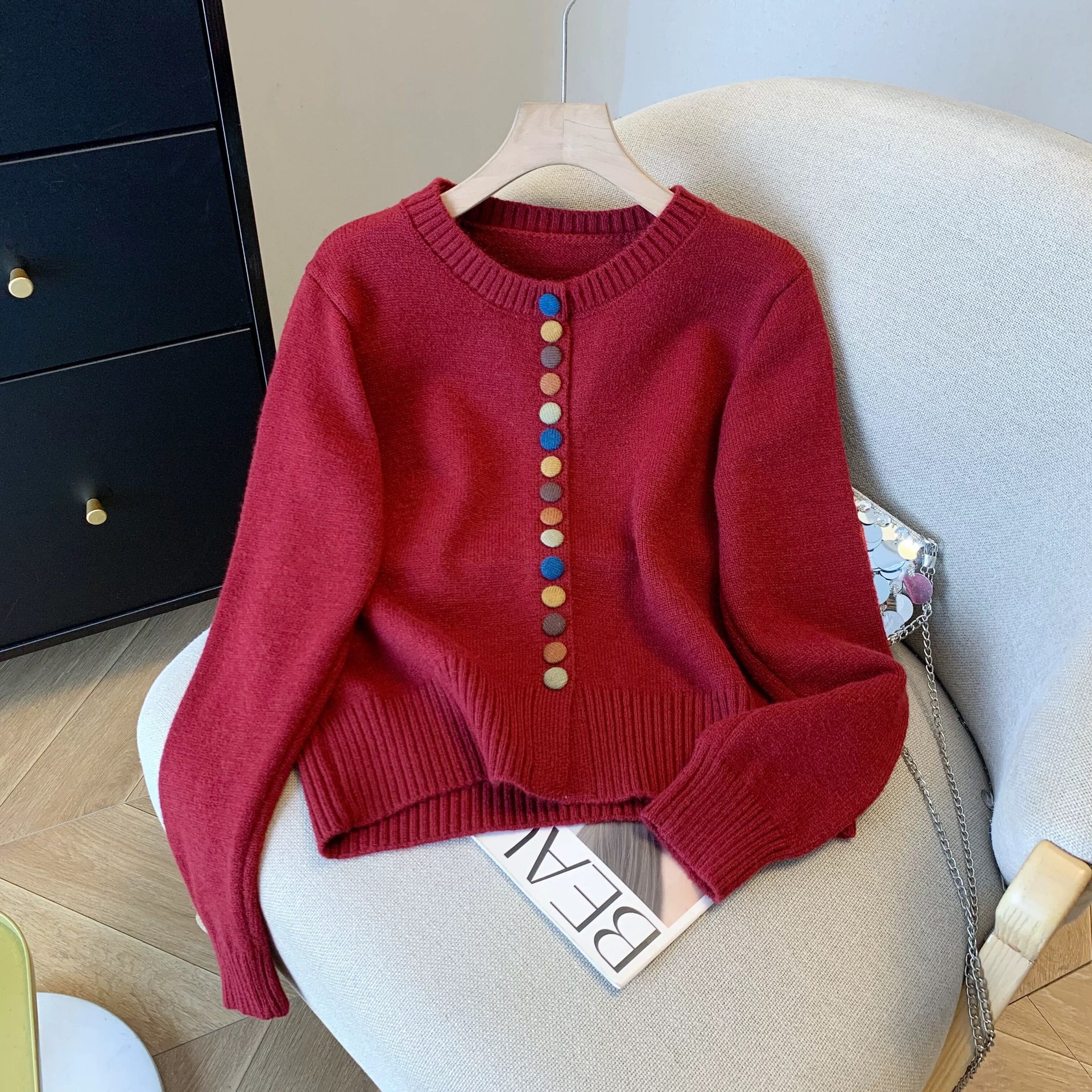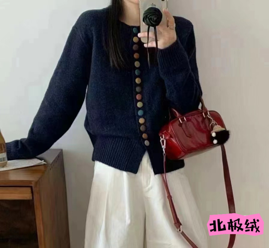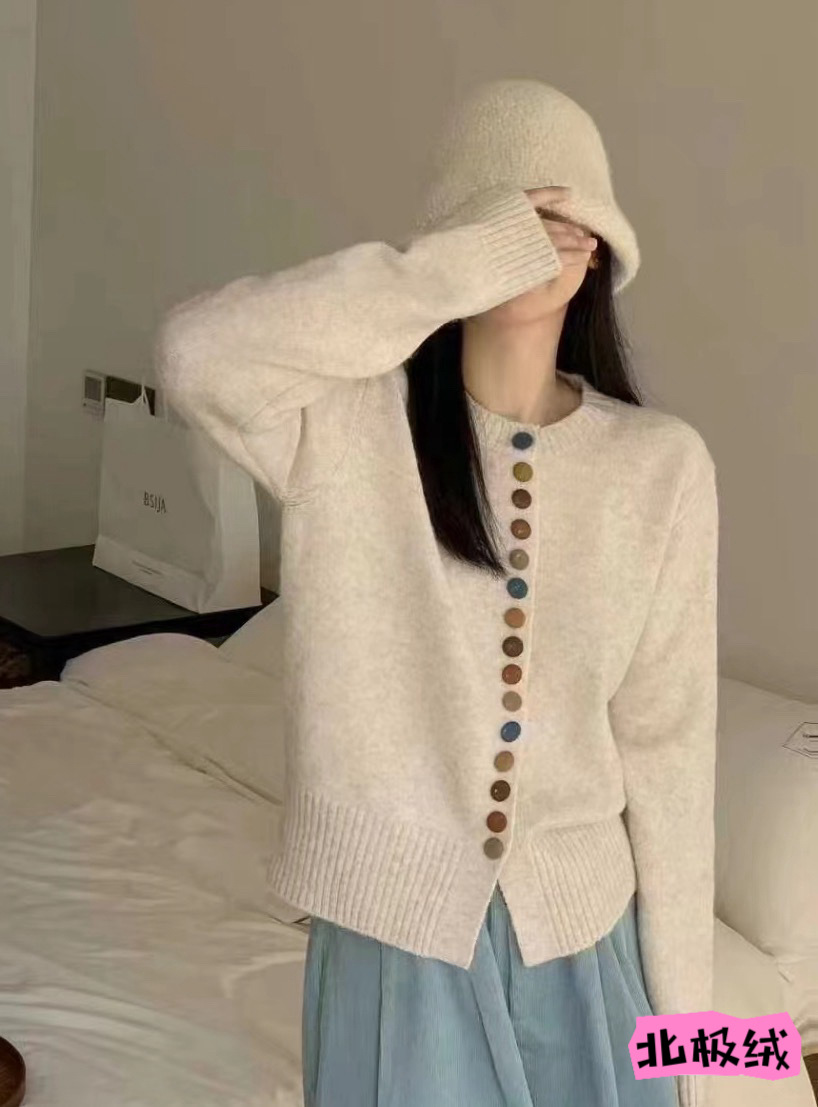한국 스타일 간단한 컬러 버튼 니트 카디건 여성의 2024 년 가을과 겨울 새로운 느슨한 짧은 하이 엔드 스웨터 탑스토어 가기