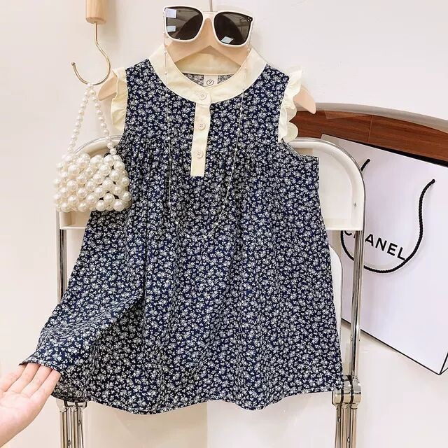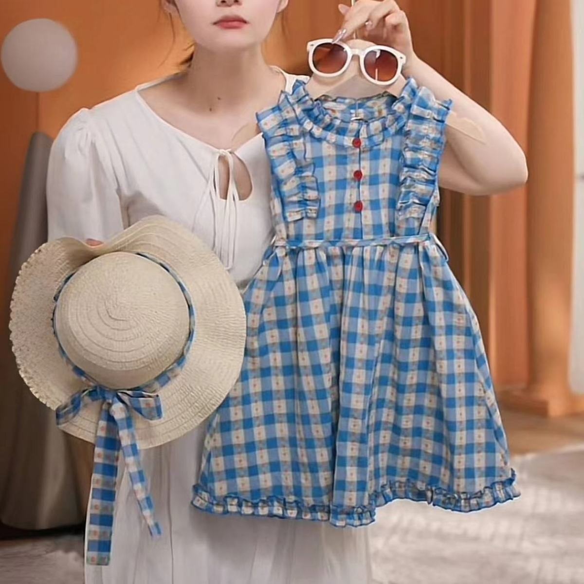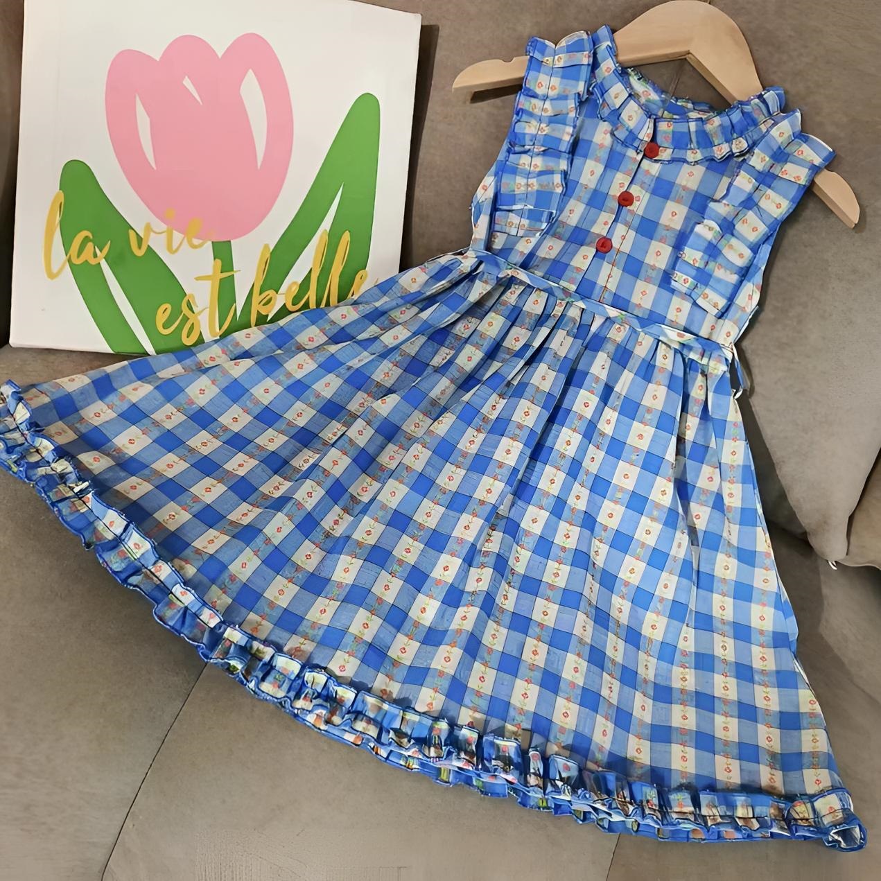 한국 스타일 플라잉 슬리브 소녀 격자 무늬 원피스 소녀 아기의 세련된 폴로 베스 포프 원피스 세련된 공주 원피스스토어 가기