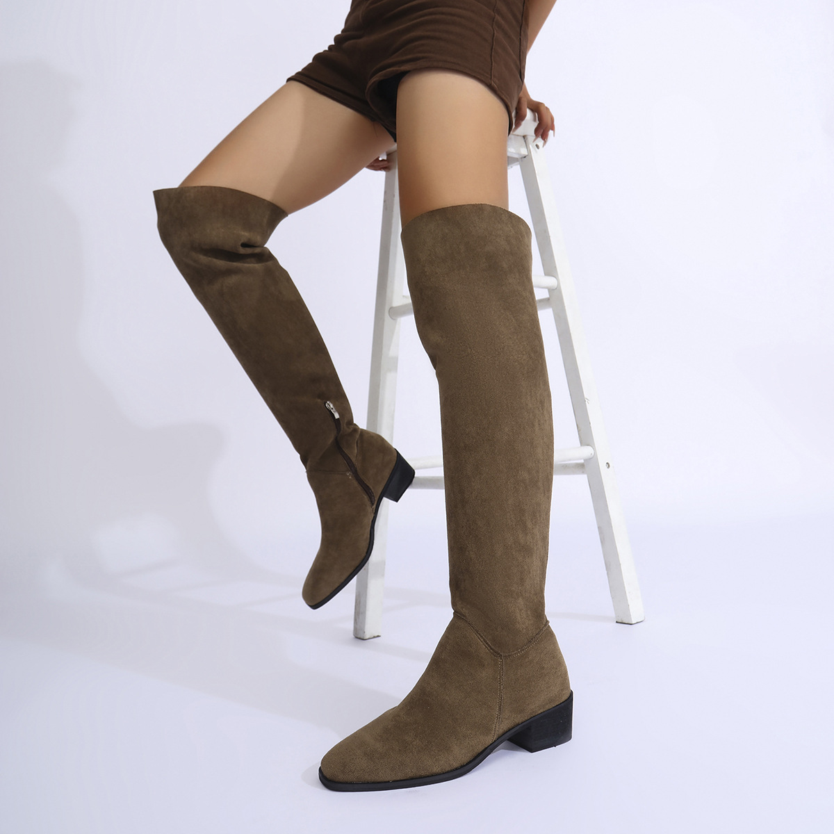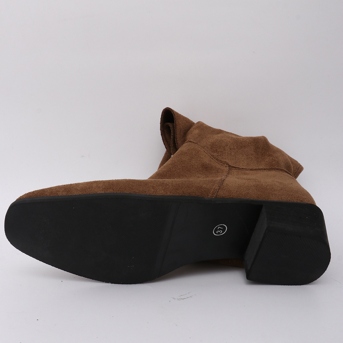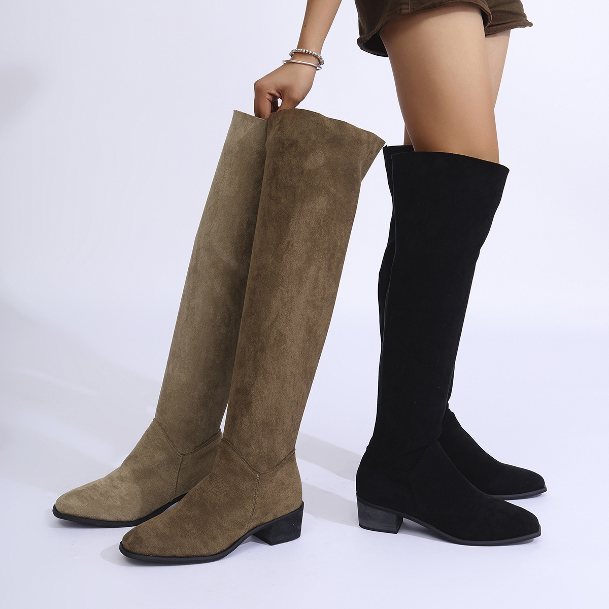 국경을 넘는 플러스 사이즈 2024 년 무릎 위 스트레치 부츠 여성용 두꺼운 발 뒤꿈치 가을과 겨울 새로운 플러스 사이즈 사이드 지퍼 스웨이드 슬림 부츠