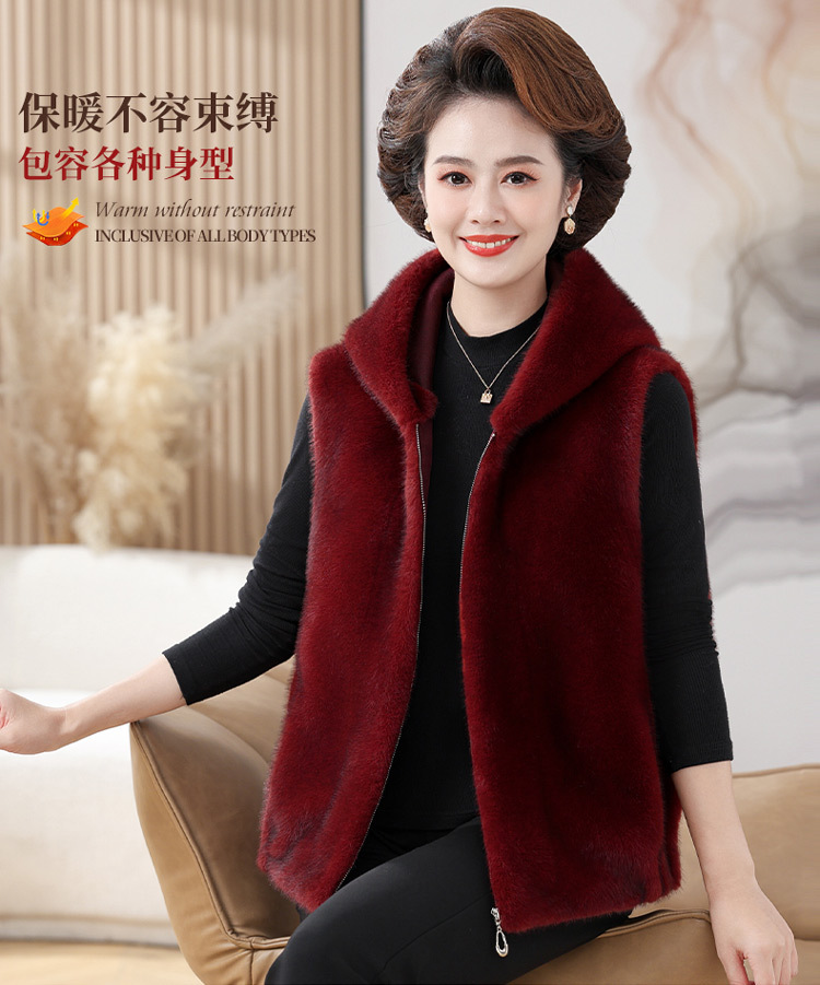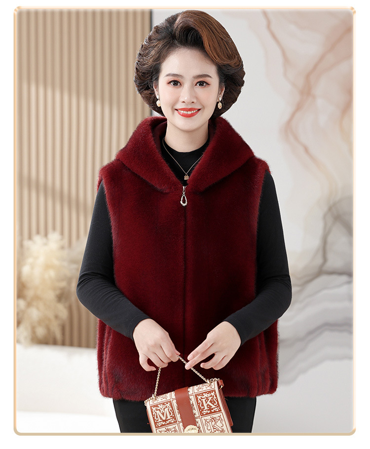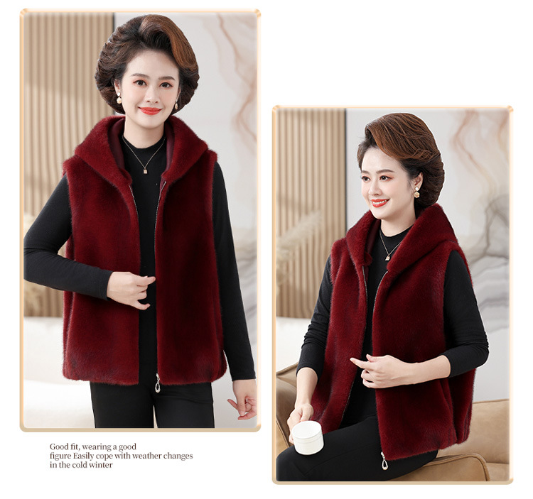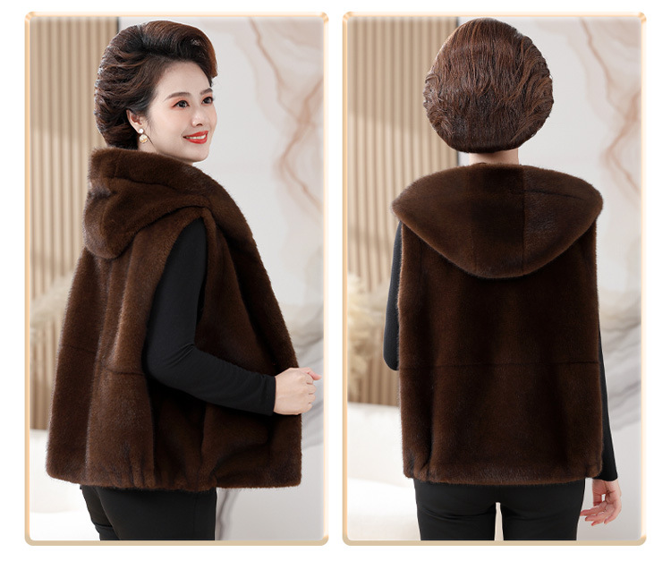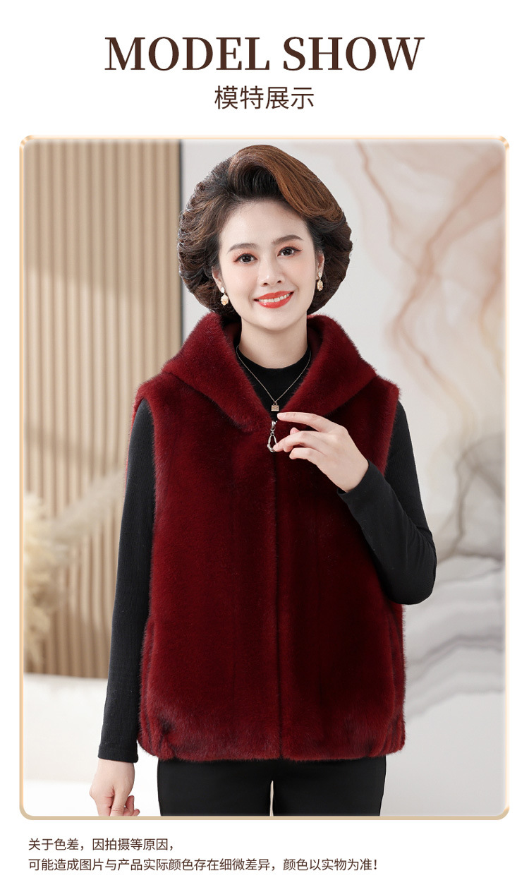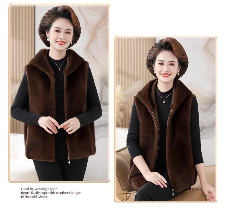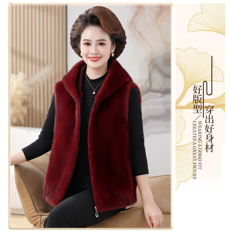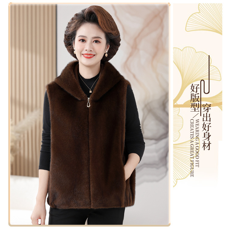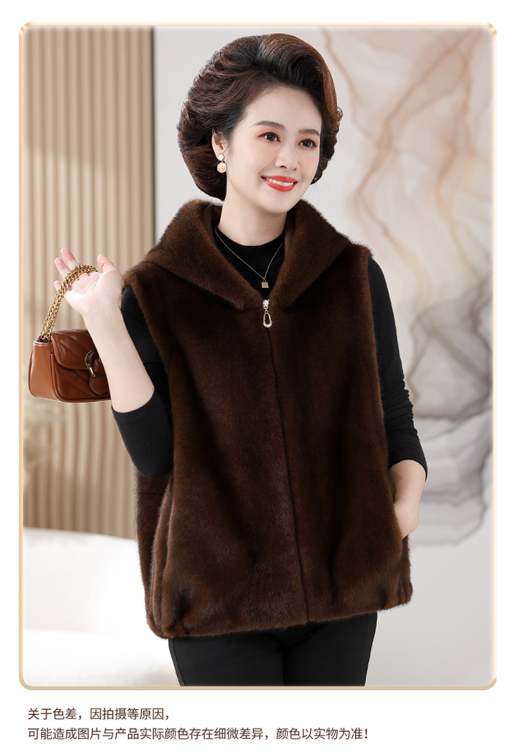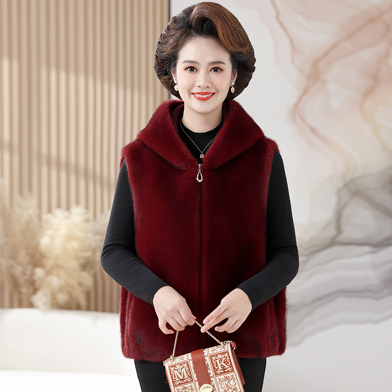 밍크 벨벳 조끼 코트 여성 2024 년 가을과 겨울 새로운 후드 조끼 중년 어머니 고귀한 모피 한 말벌
