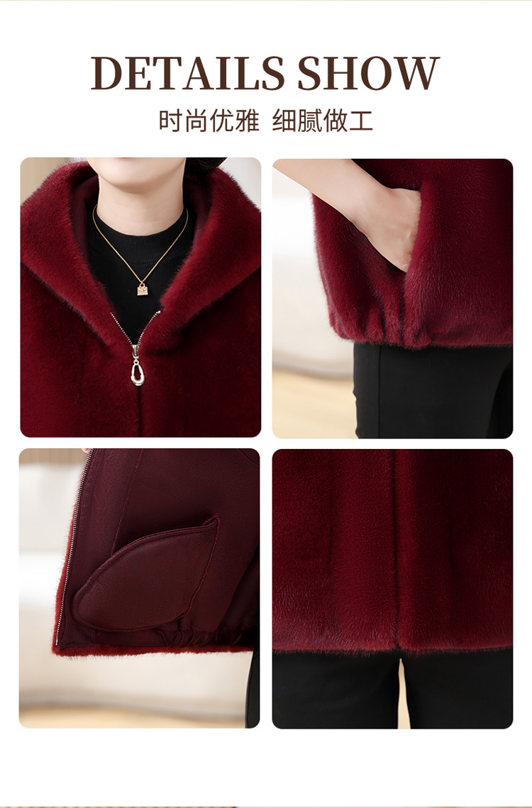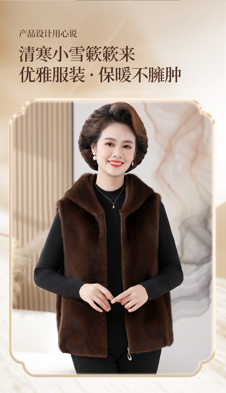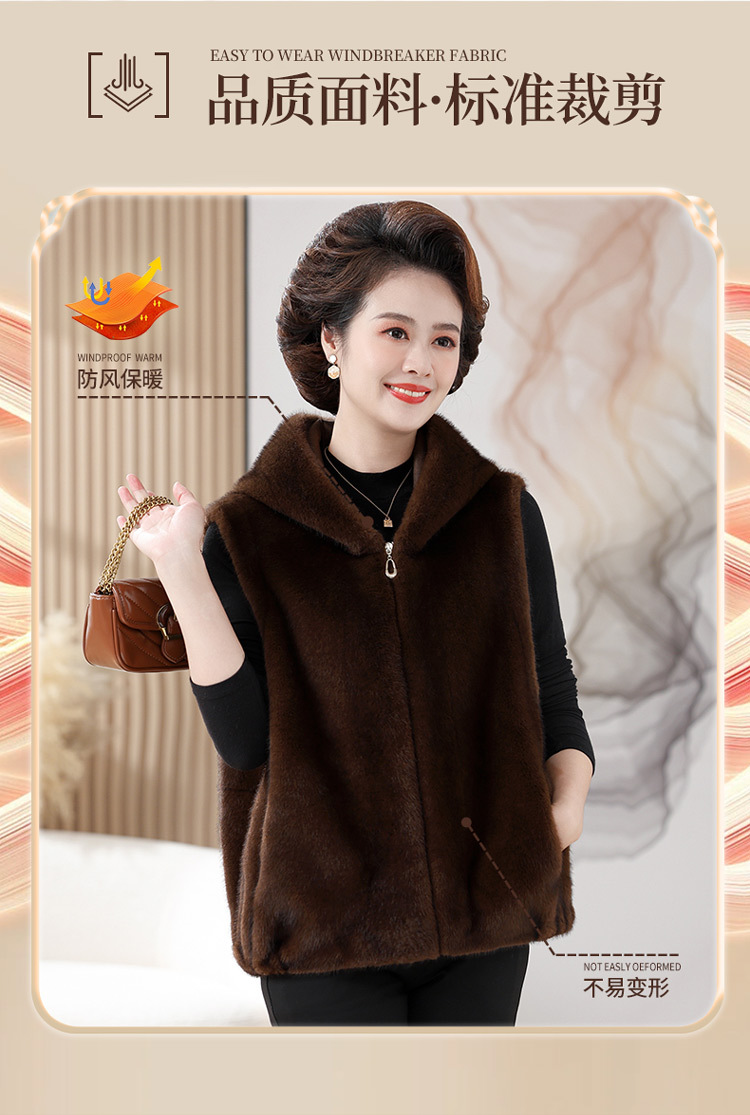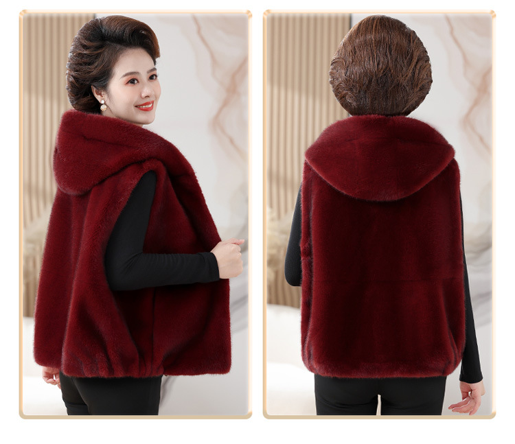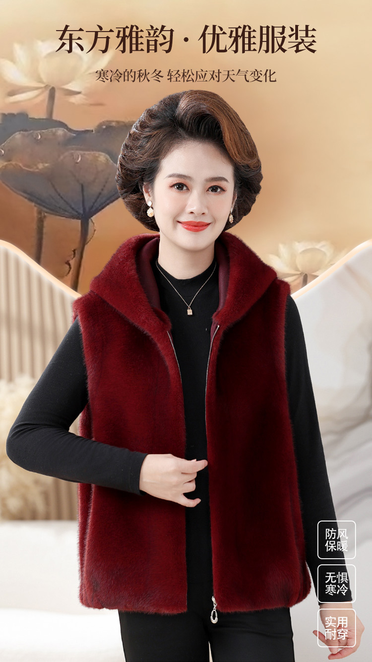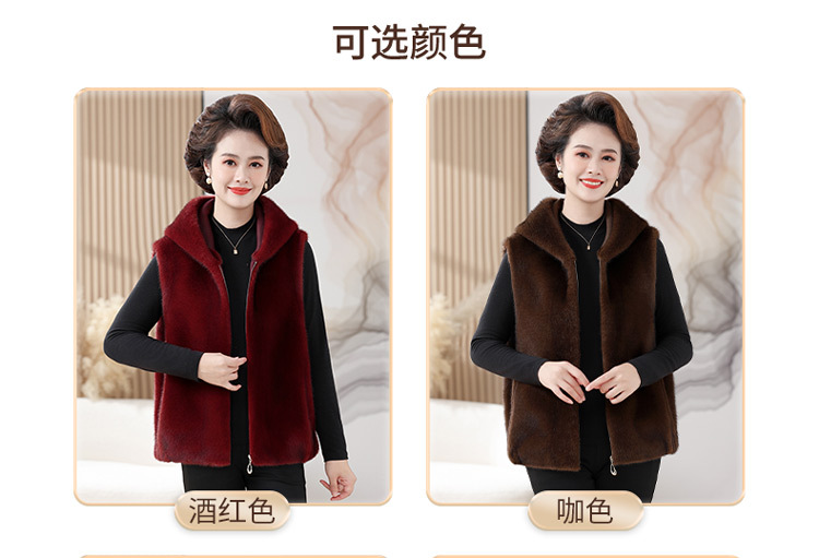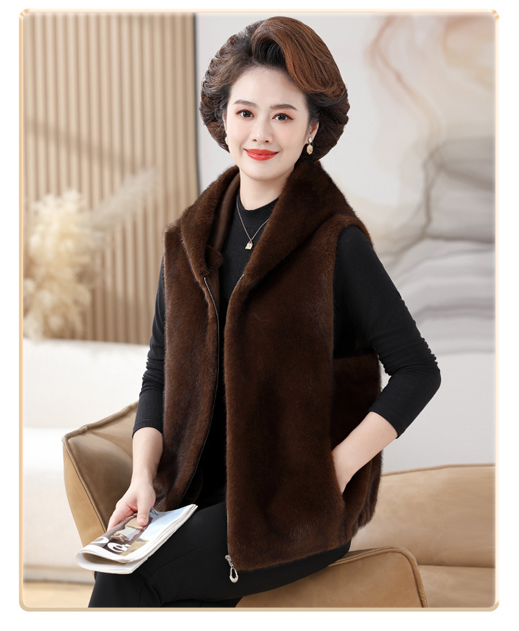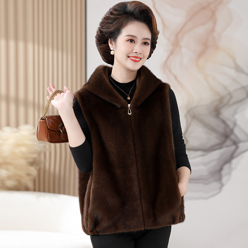 밍크 벨벳 조끼 코트 여성 2024 년 가을과 겨울 새로운 후드 조끼 중년 어머니 고귀한 모피 한 말벌