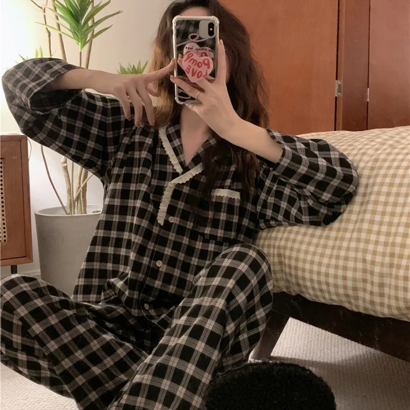 레이스 블랙 격자 무늬 잠옷 여성의 봄과 가을 새로운 한국 스타일 옷깃 긴 소매 바지 외모 홈 의류 세트스토어 가기