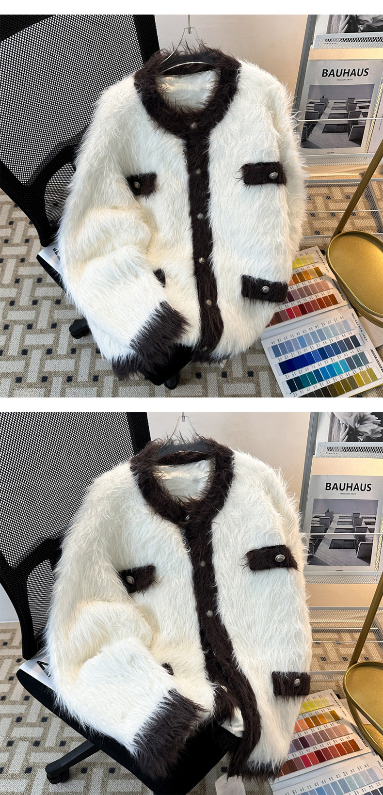 가을과 겨울 2024 새로운 밍크 벨벳 스웨터 코트 남성 디자인 센스 틈새 샤넬 스타일 대비 컬러 니트 카디건
