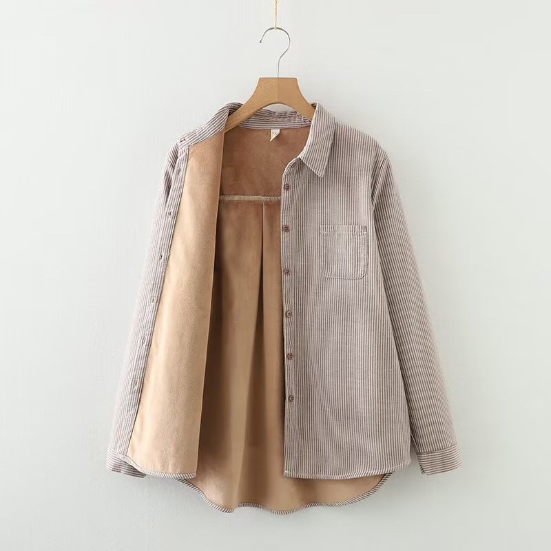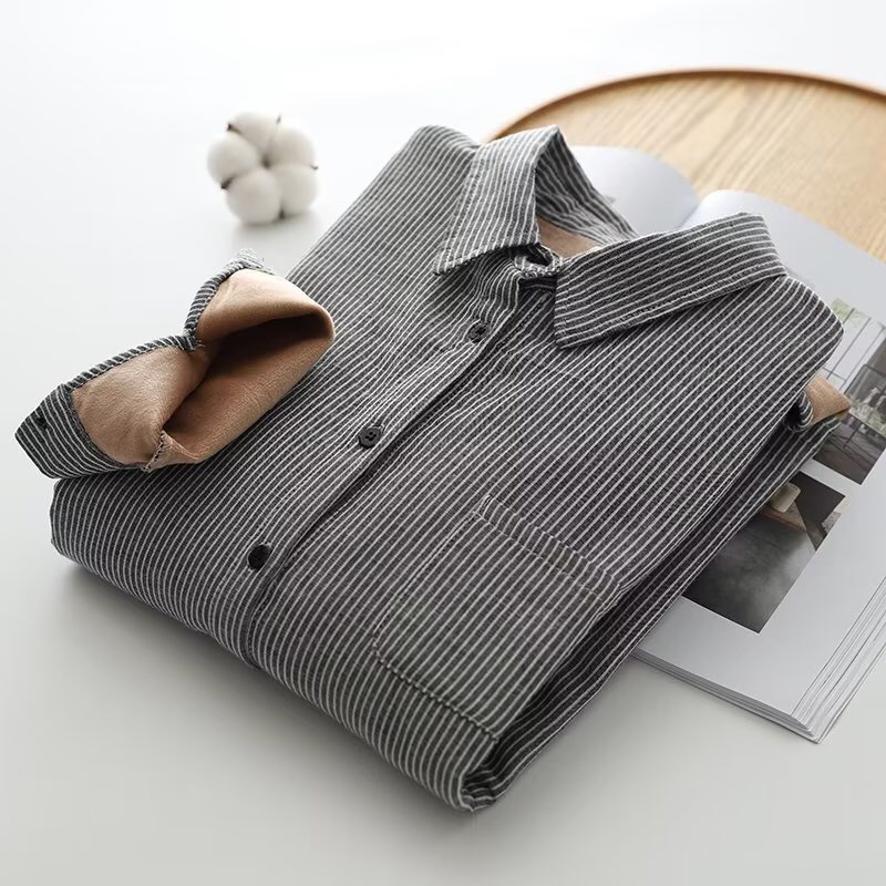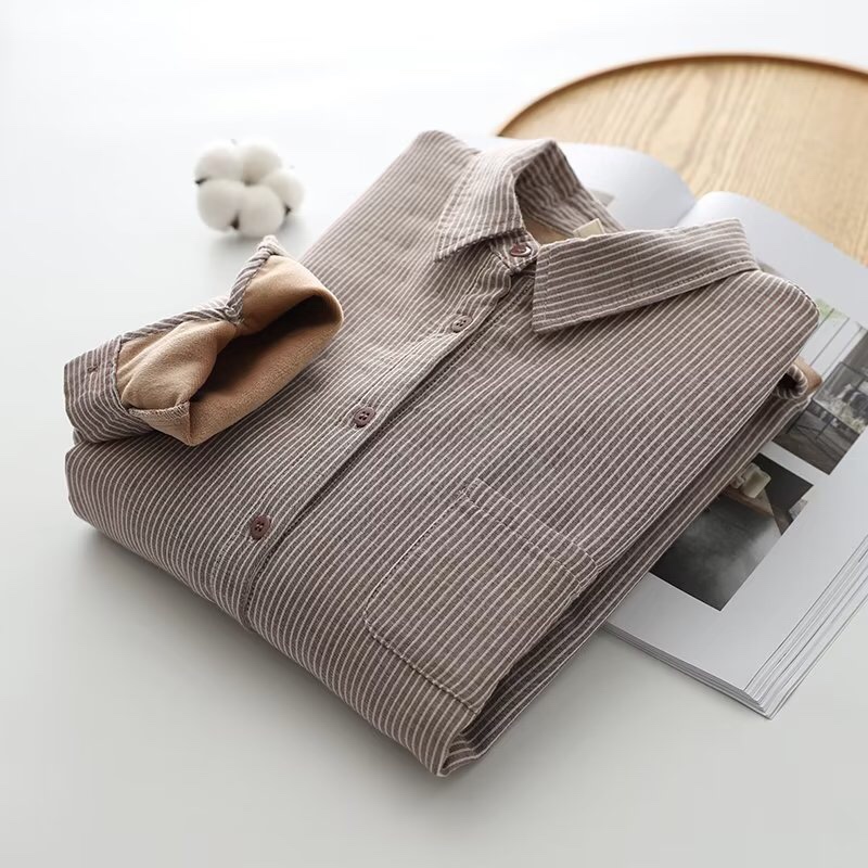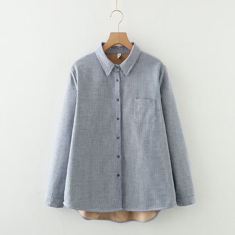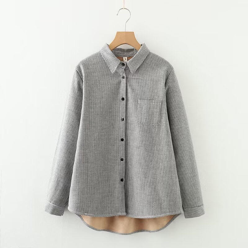 2024 년 가을과 겨울 새로운 기모 두꺼운 기지 긴 소매 탑 재킷 스트라이프 루즈 캐주얼 셔츠